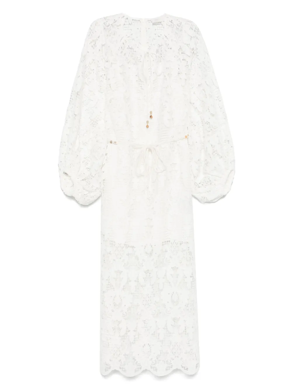 Rochie midi Zimmerman Coco Lace alb, din bumbac, realizata din dantela delicata, cu decolteu adanc in V, maneci vaporoase, inchidere cu fermoar ascuns la spate, talie accentuata cu snur si tiv cu bordura decorativa scallop. Potrivita pentru sezonul toamna/iarna. 100% bumbac; 100% bumbac.
