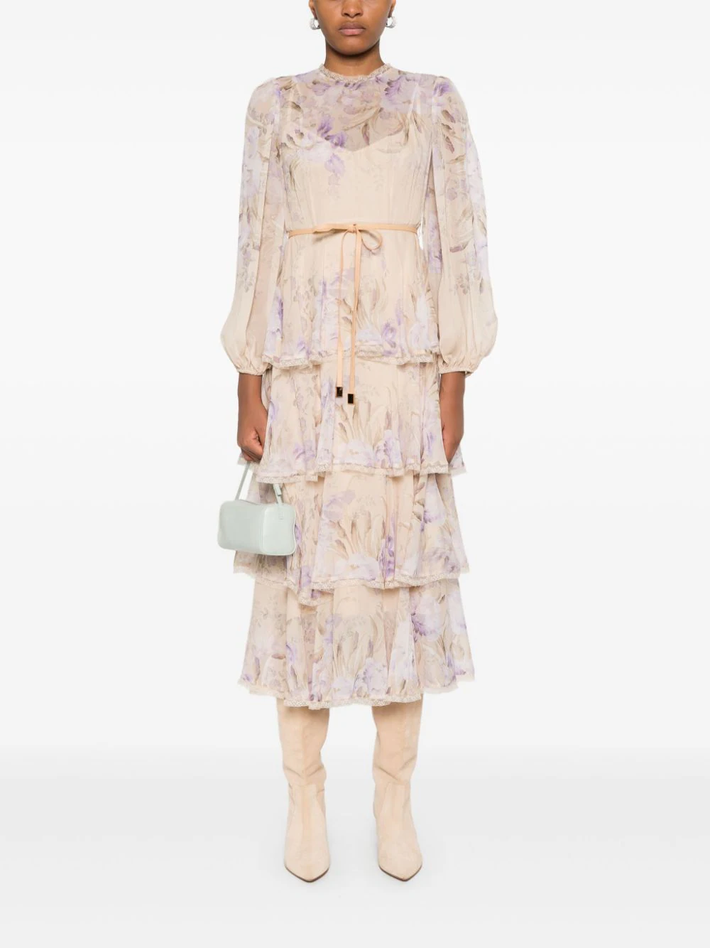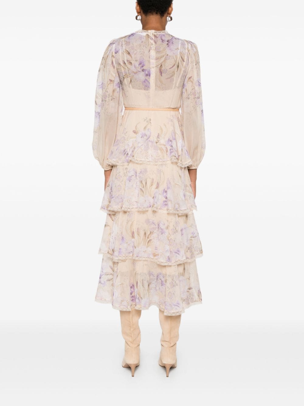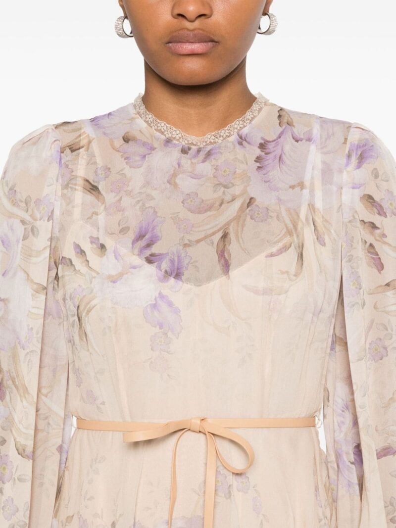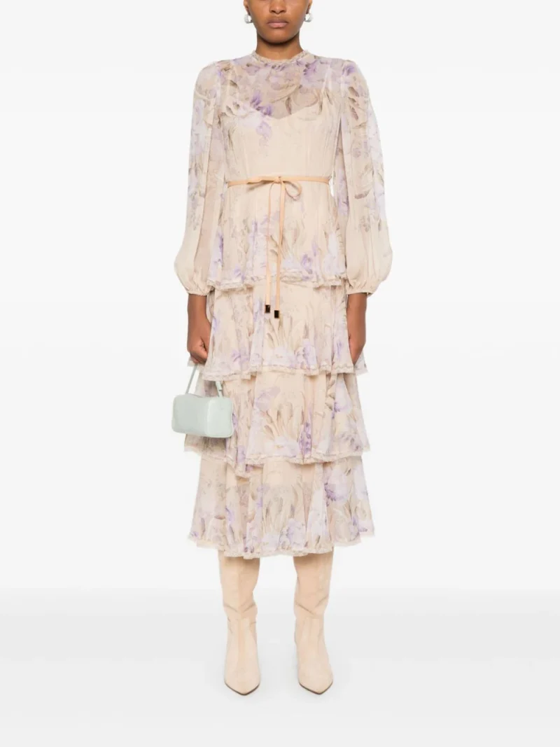 Rochie midi ZZIMMERMANN Eden Lace Edge multicolor, cu guler inalt, inchidere cu fermoar la spate, maneci medii bufante, grafica florala imprimata pe toata suprafata produsului, talie evidentiata, rochie slip detasabila, volane docrative si tiv drept. Potrivita pentru sezonul toamna/iarna. 100% poliamida; 100% viscoza; 86% poliester reciclat; 14% elastan.