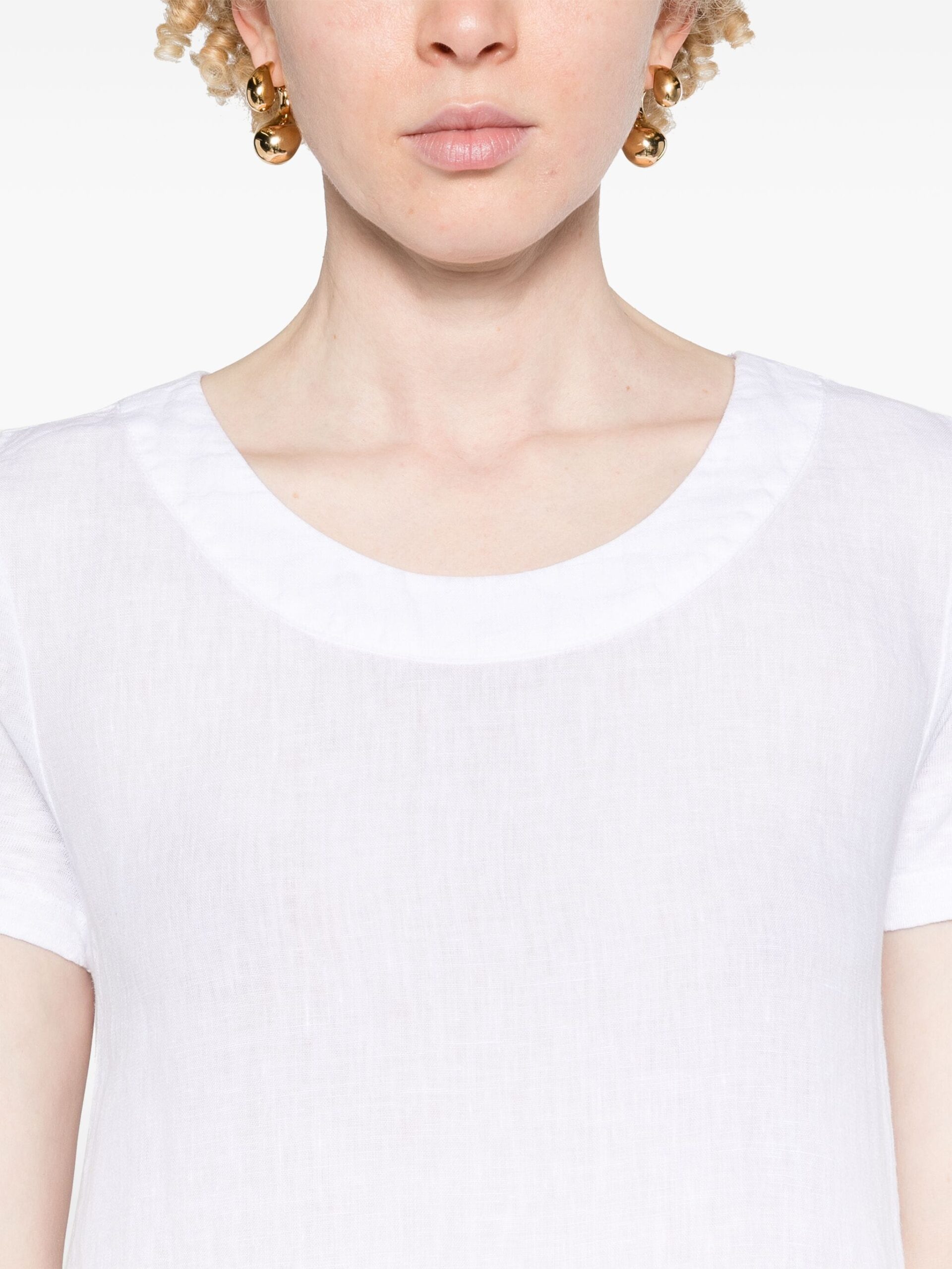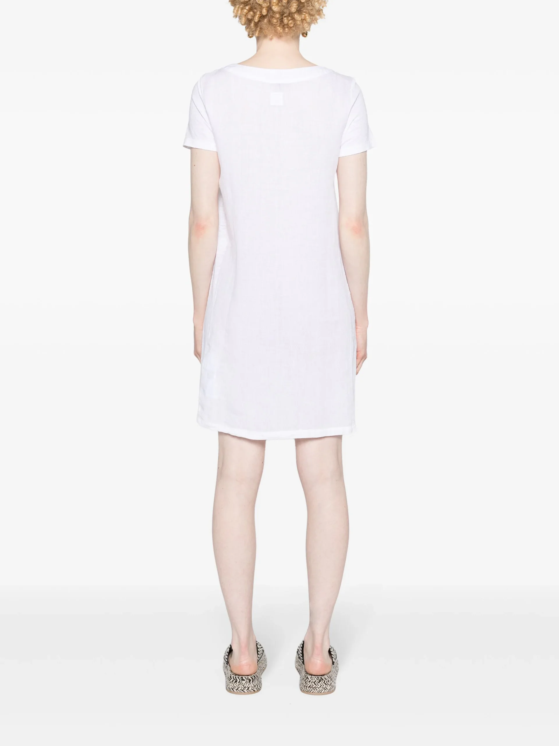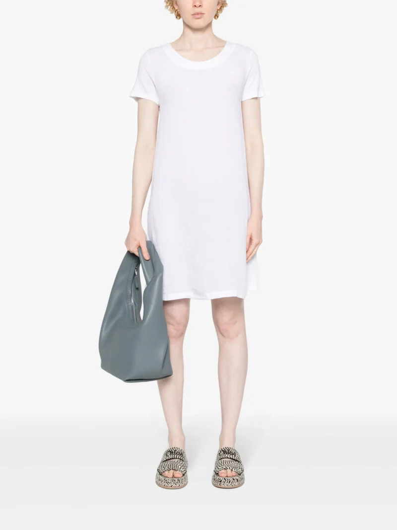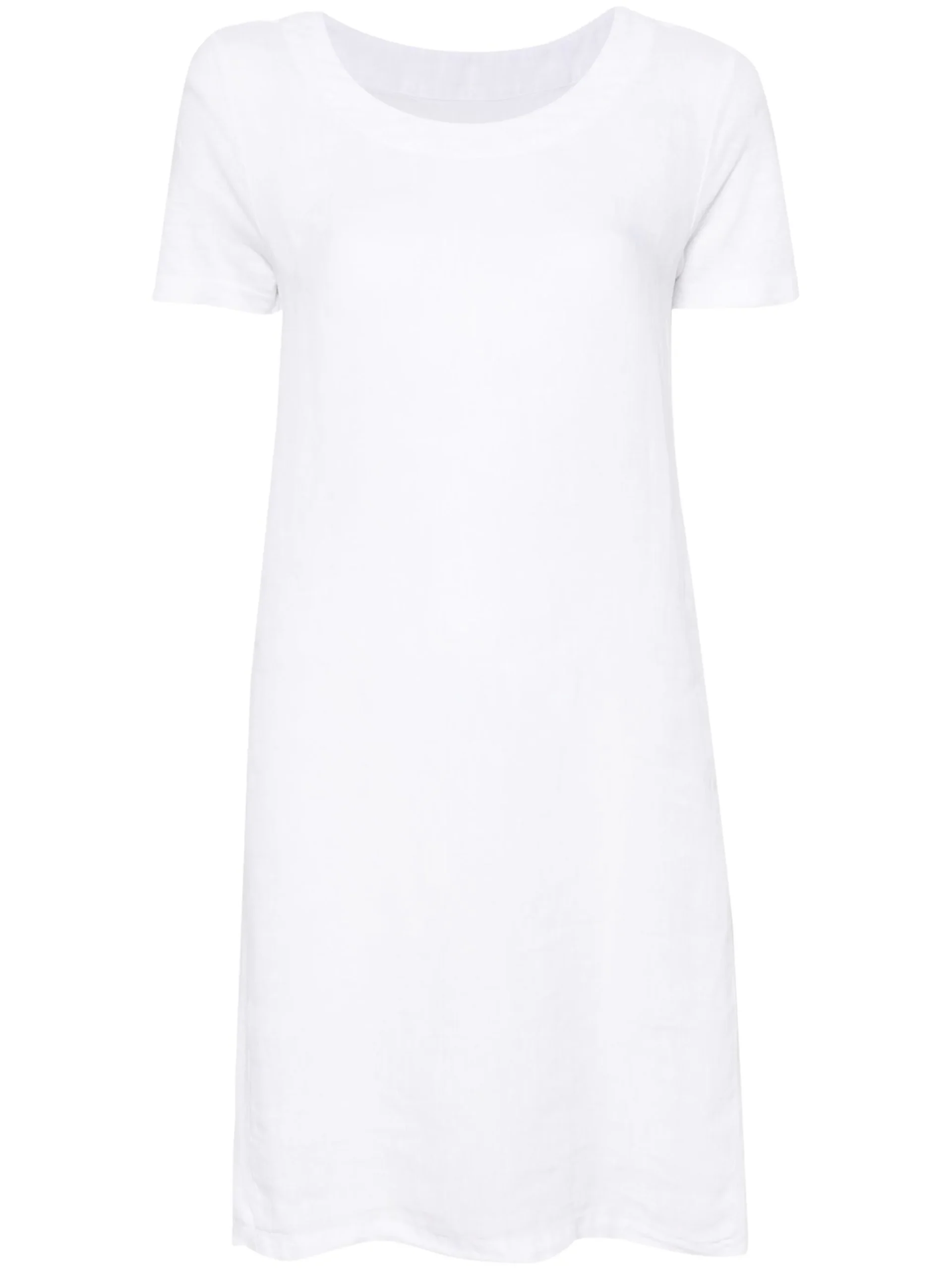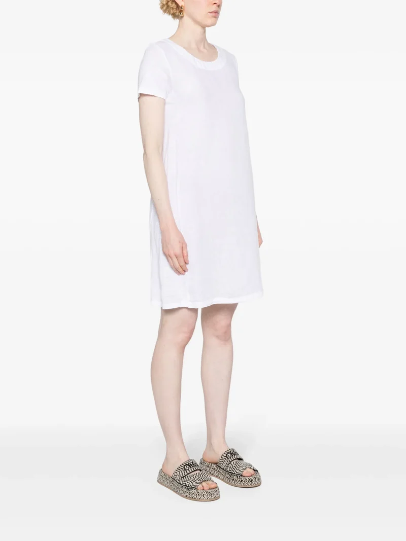 Rochie mini alba din in, tip tricou, cu guler rotund, croiala relaxata si tiv drept. Potrivita pentru sezonul primavara/vara. 100% in.