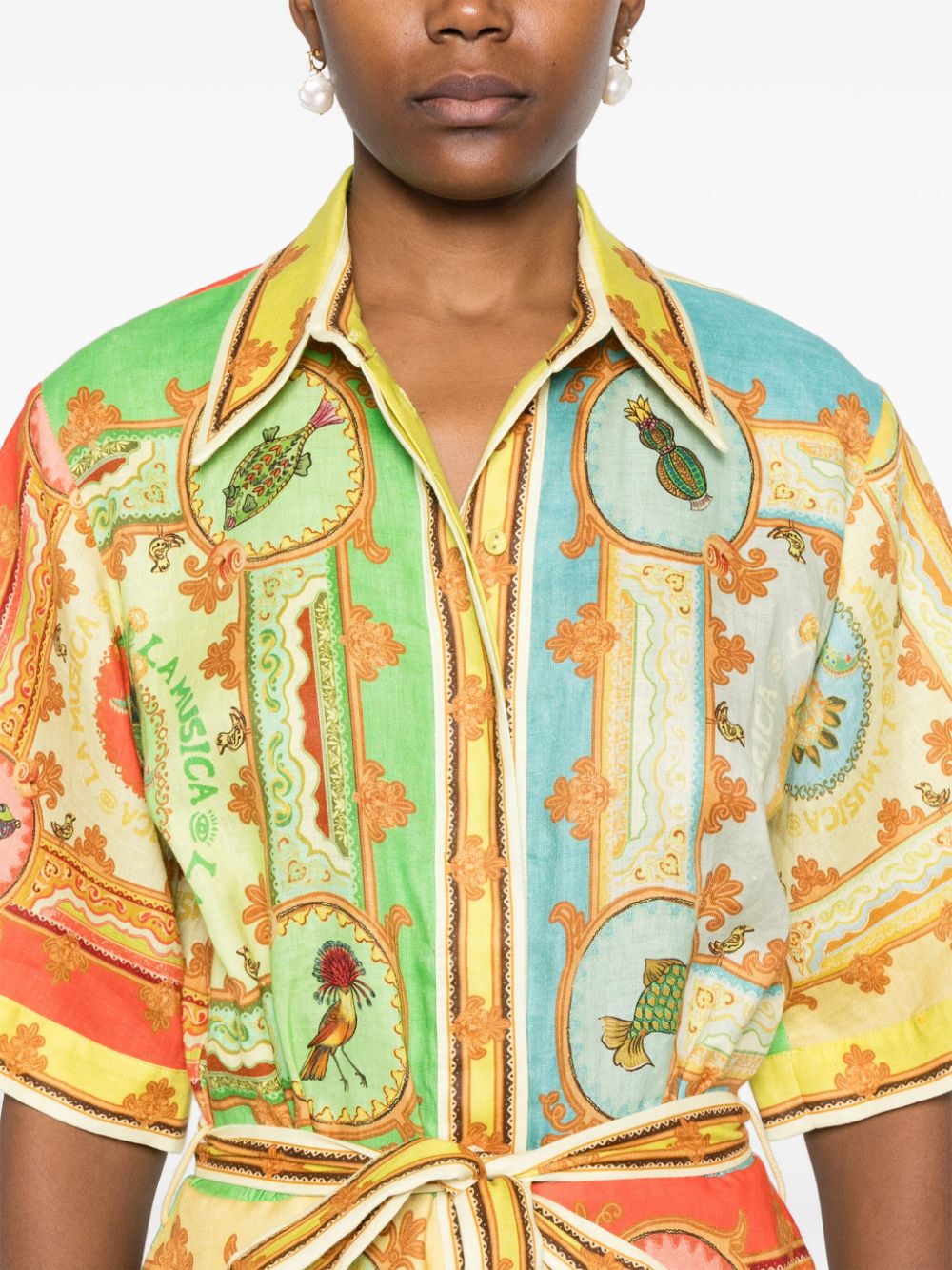 Rochie mini Alemais La Musica multicolor, din in, cu guler ascutit, inchidere cu nasturi ascunsi, maneci medii, buzunare diagonale, cordon textil in jurul taliei, grafica color-block „La musica” imprimata pe toata suprafata si tiv drept. Potrivita pentru sezonul primavara/vara. 100% in.