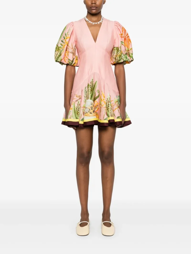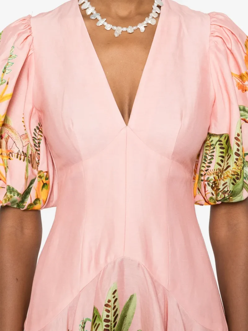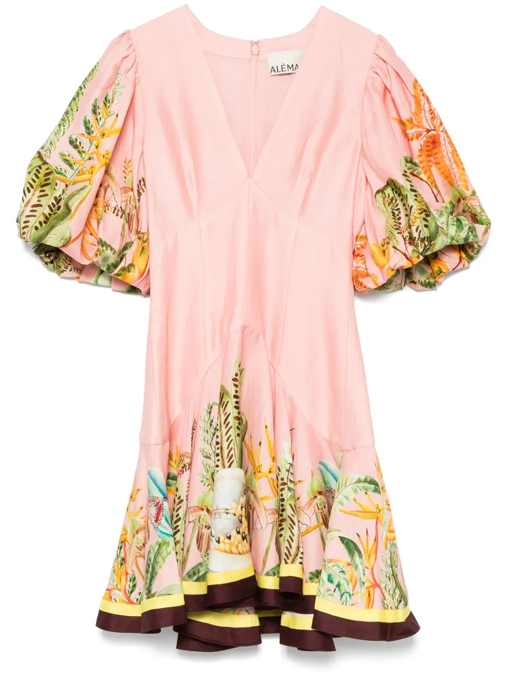 Rochie mini Alemais Papaya roz, din in, cu guler in V, inchidere cu fermor ascuns la spate, maneci scurte bufante, talie evidentiata, grafica Papaya imrpimata si tiv evazat. Potrivita pentru sezonul primavraa/vara. 56% in certificat; 44% viscoza; 100% bumbac.