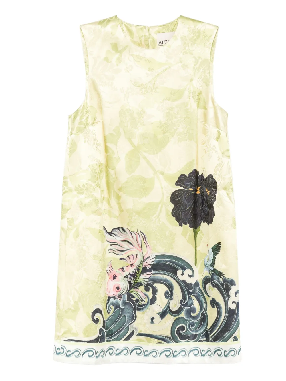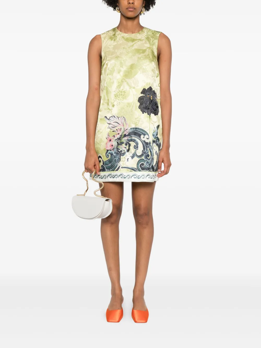 Rochie mini Alemais Rochester Floral-Print Sleeveless verde, cu guler rotund, inchidere cu un singure nasture la spate, grafica florala si Koi Fish imprimate, captuseala din bumbac si tiv drept. Potrivita pentru sezonul toamna/iarna. 58% viscoza; 42% matase; 100% bumbac.