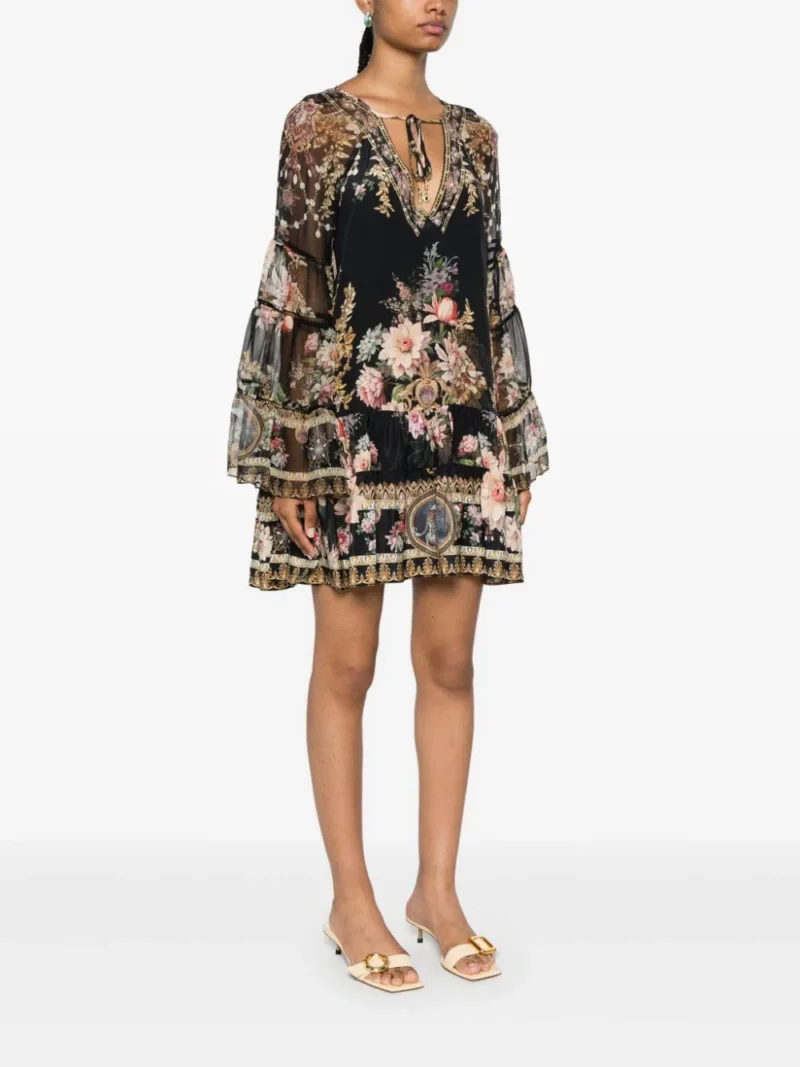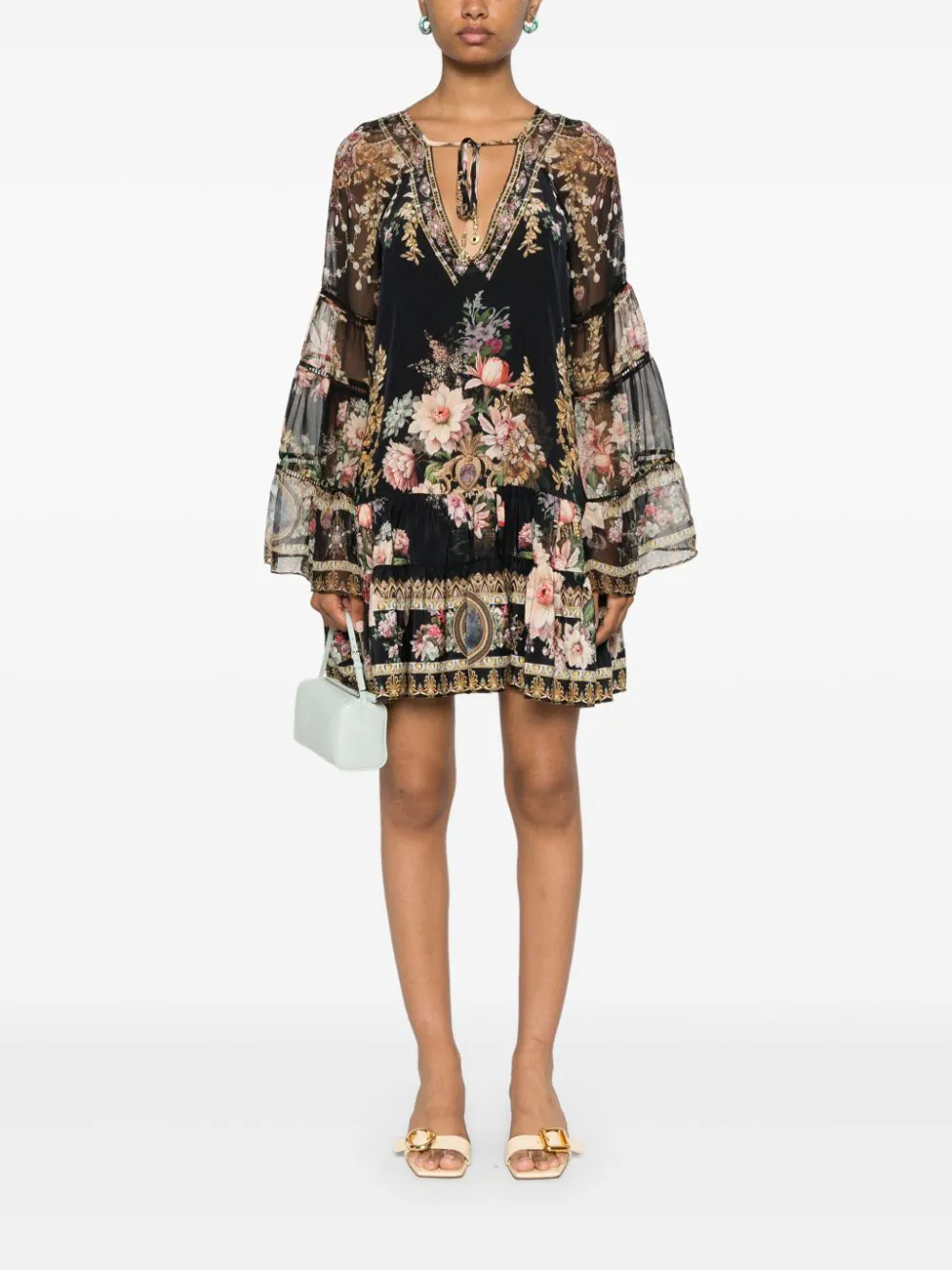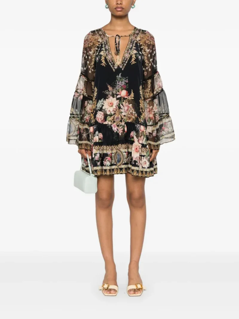 Rochie mini Camilla Lace-Trim multicolor, din matase, cu decolteu in V si inchidere cu snur, maneci lungi bufante, model floral Camilla imprimat pe toata suprafata, cristale sclipitoare aplicate si tiv evazat. Potrivita pentru sezonul primavara/vara. 100% matase.