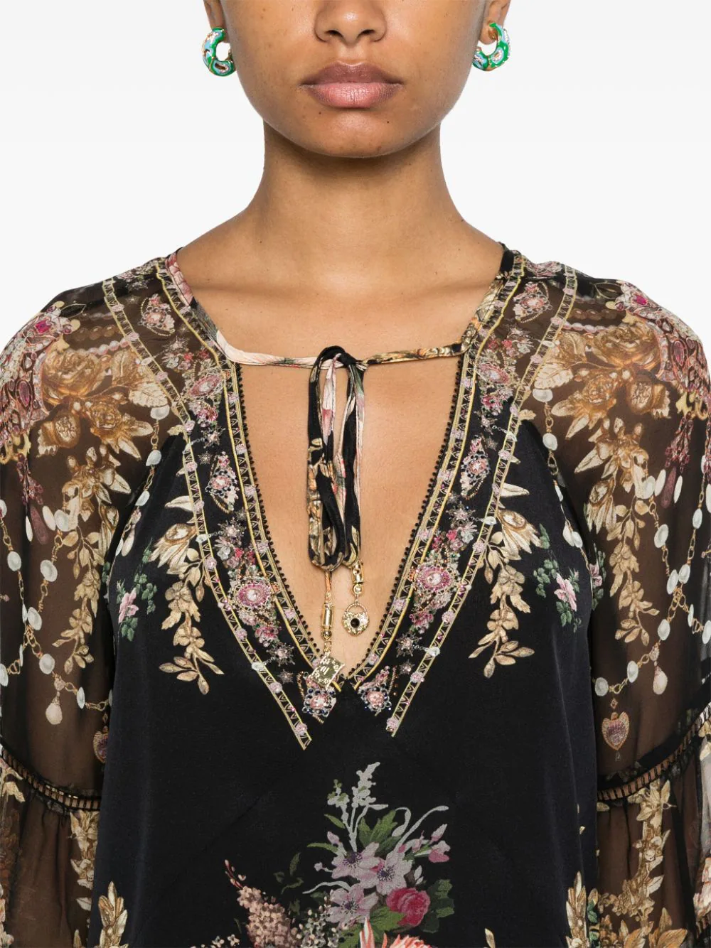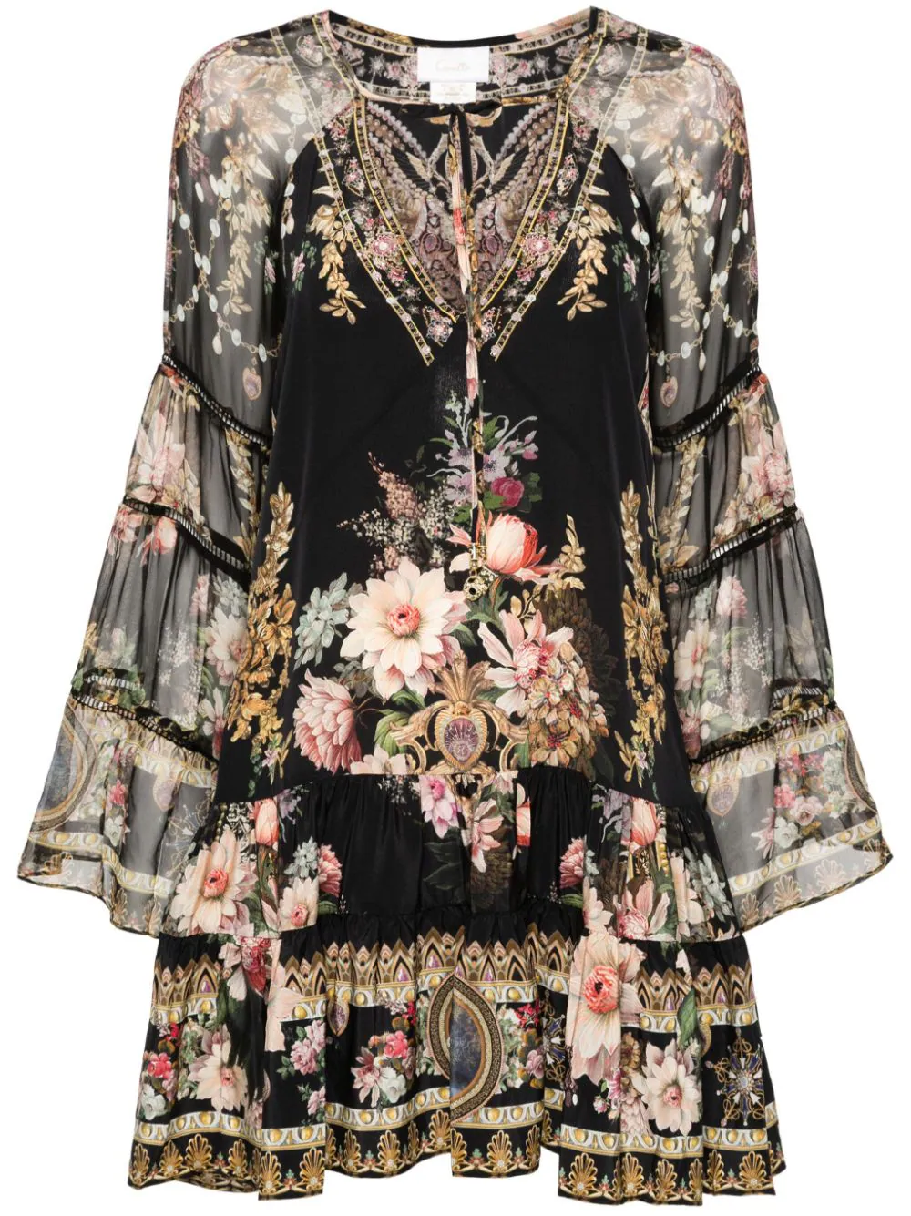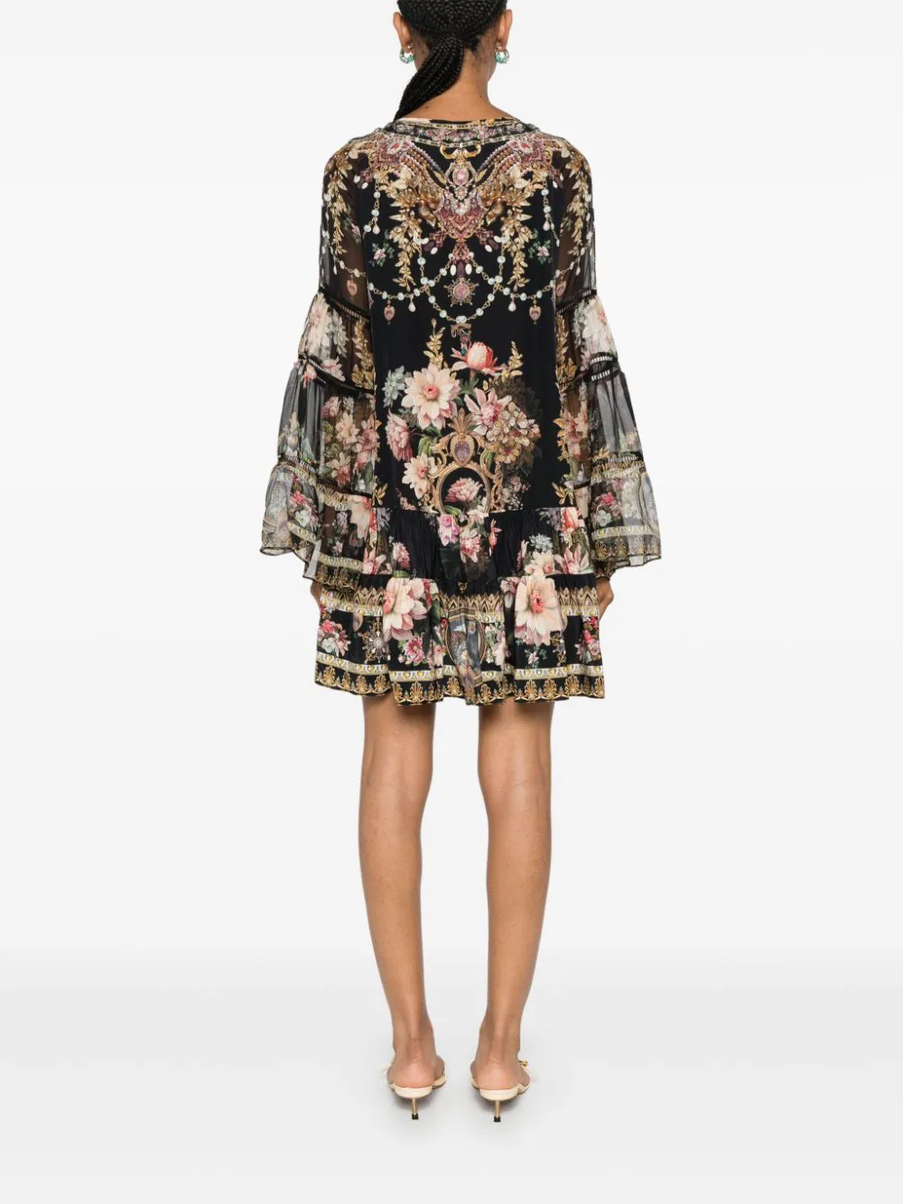 Rochie mini Camilla Lace-Trim multicolor, din matase, cu decolteu in V si inchidere cu snur, maneci lungi bufante, model floral Camilla imprimat pe toata suprafata, cristale sclipitoare aplicate si tiv evazat. Potrivita pentru sezonul primavara/vara. 100% matase.