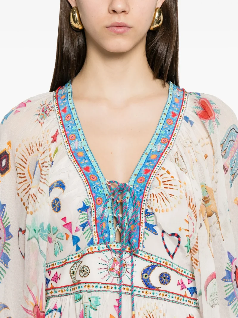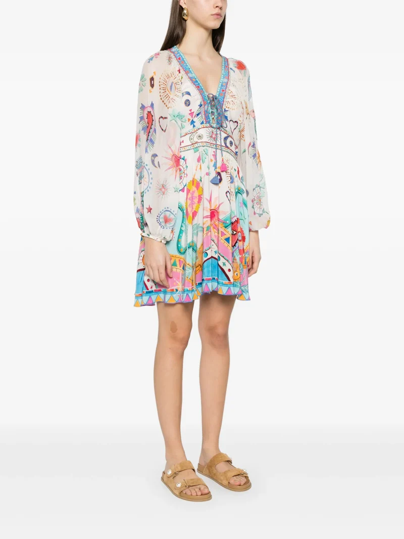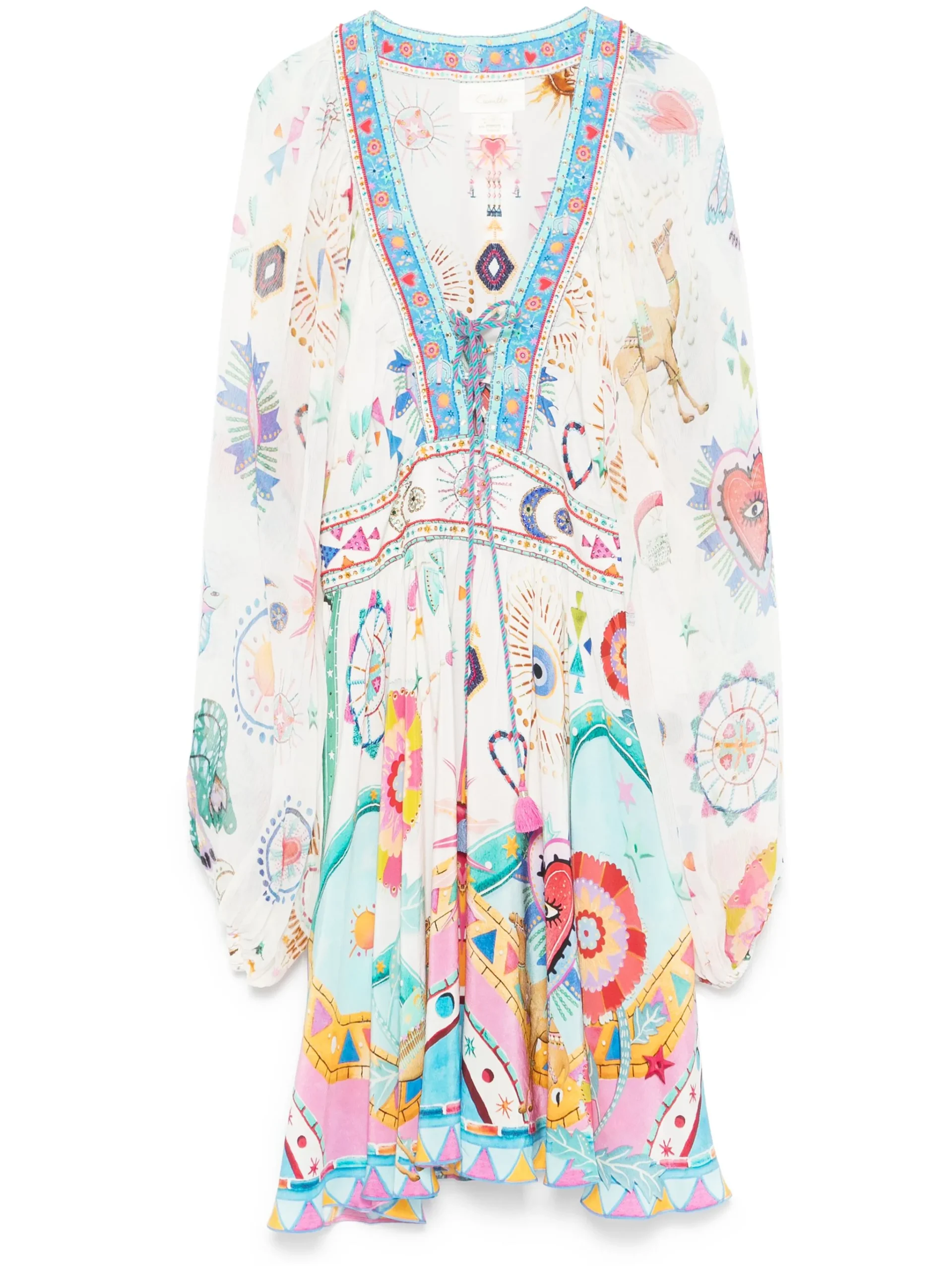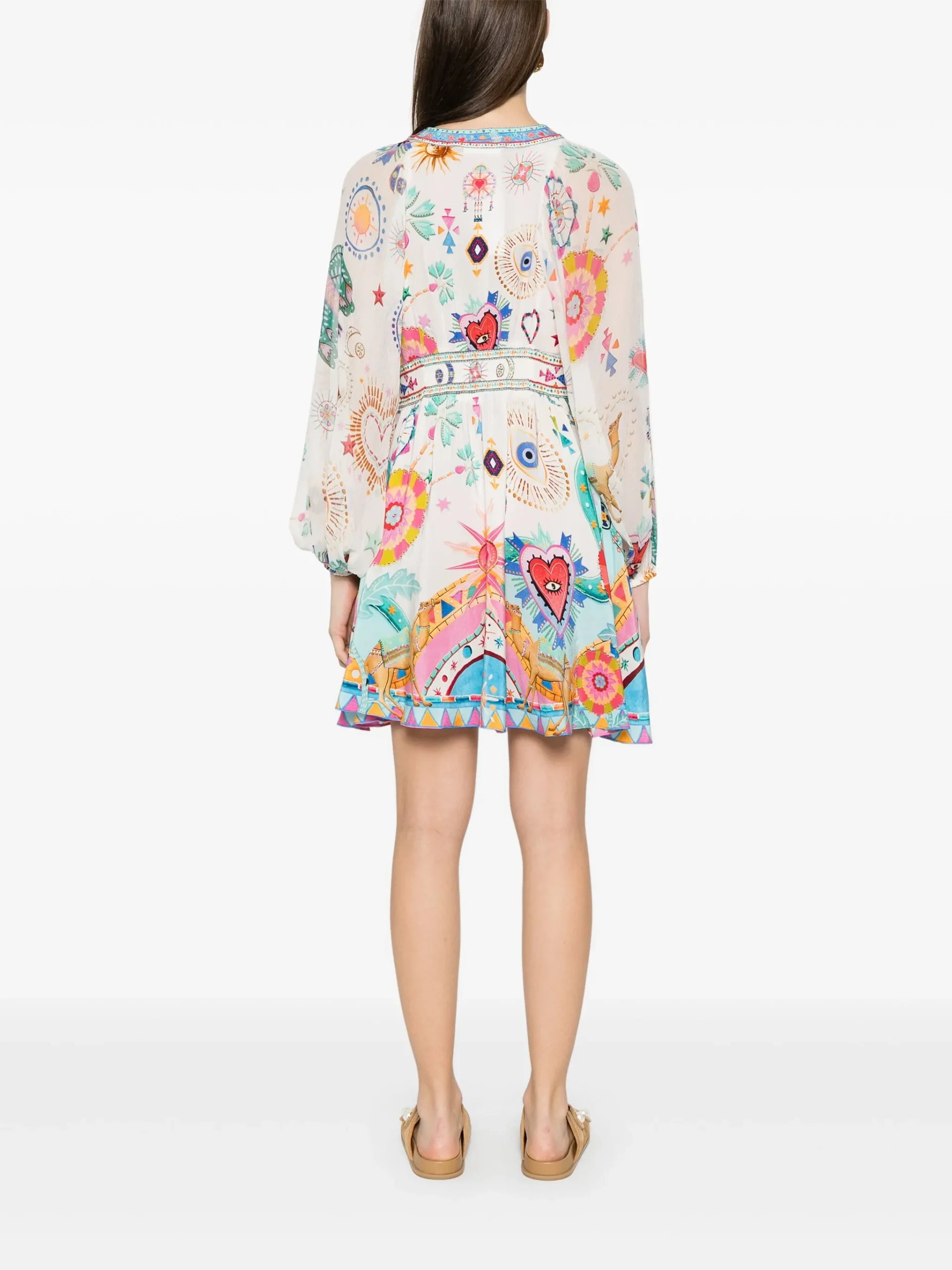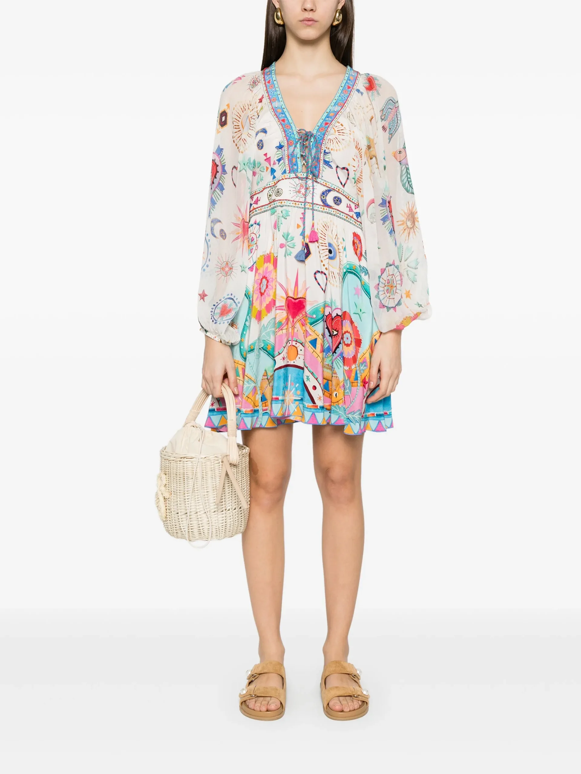 Rochie mini Camilla ” Living in Colour” multicolor, inchidere cu sireturi pe partea frontala, maneci lungi, buzunare laterale cu fante. 100% matase