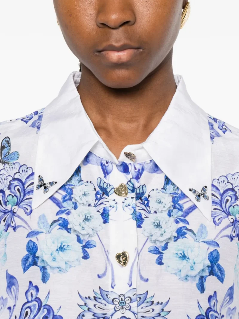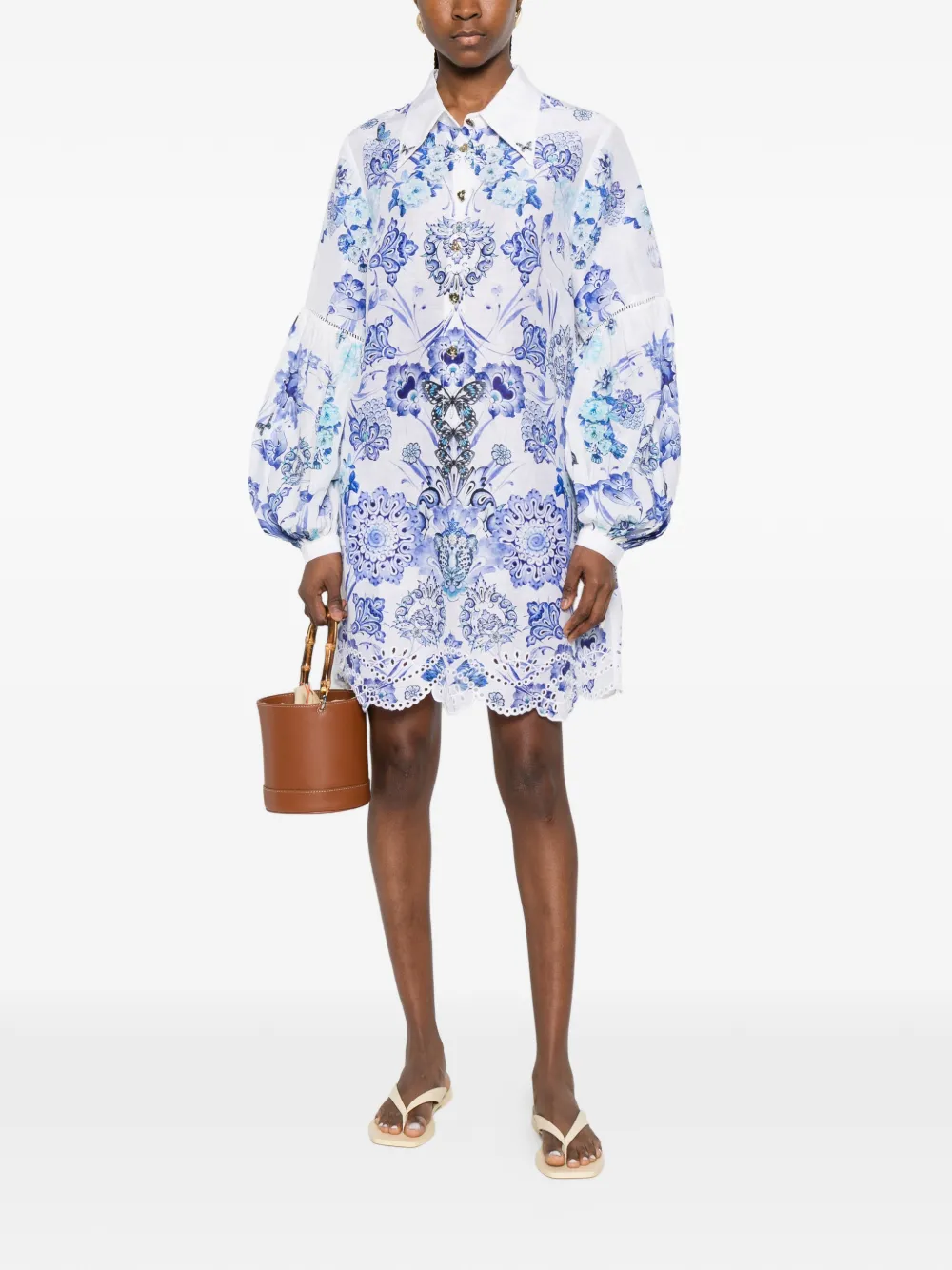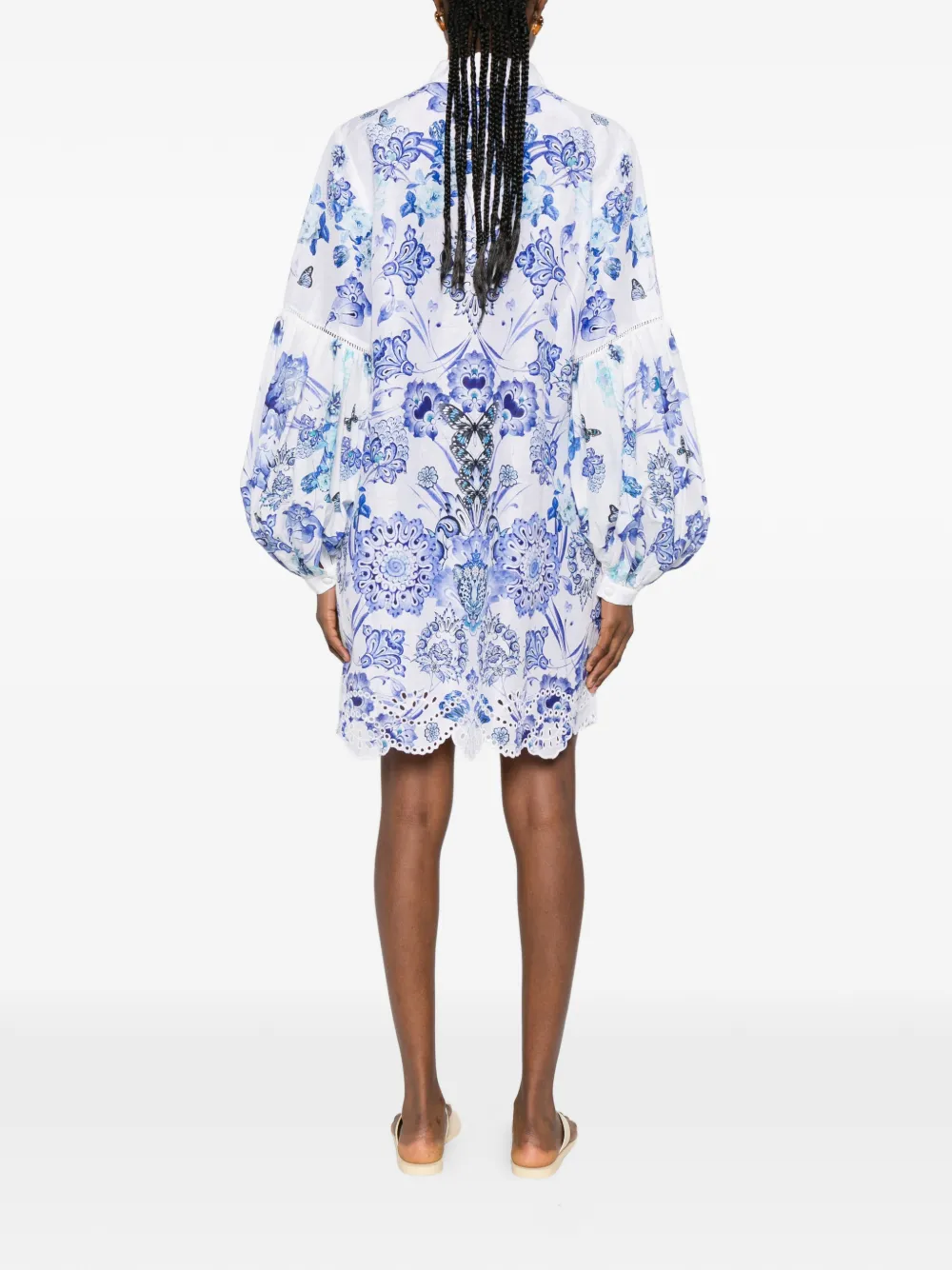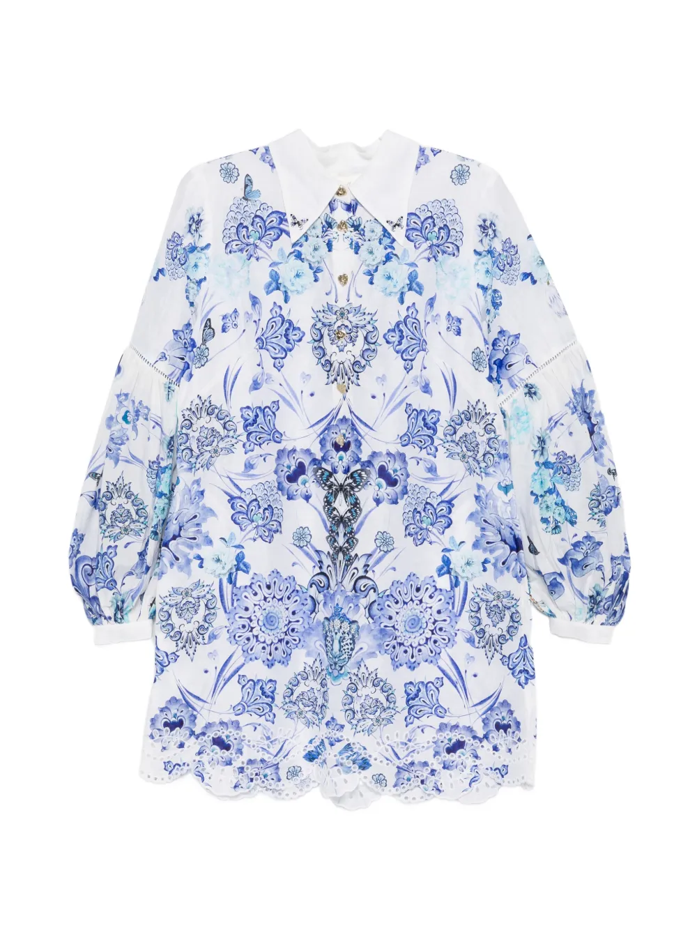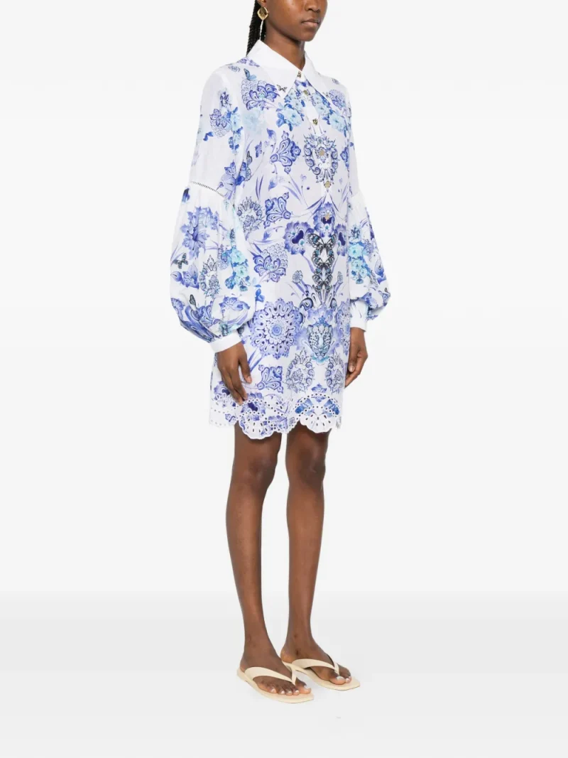Rochie mini Camilla Scallop-Trim Floral-Print alb, cu guler clasic, inchidere partiala cu nasturi, maneci lungi bufante cu insertii crosetate, grafica florala imprimata si tiv feston. Potrvita pentru sezonul primavara/vara. 80% in; 20% matase.