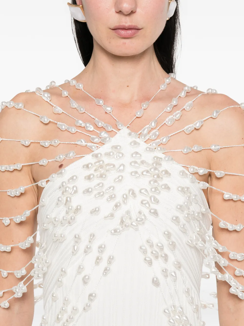 Rochie mini Cult Gaia Oliviana Beaded Ribbed ecru, cu guler halterneck, drapaj decorativ realizat din perle, testaura ribbed, croiala mulata si tiv drept. Potrivita pentru sezonul primavara/vara. 60% viscoza; 40% nylon; 100% poliester..