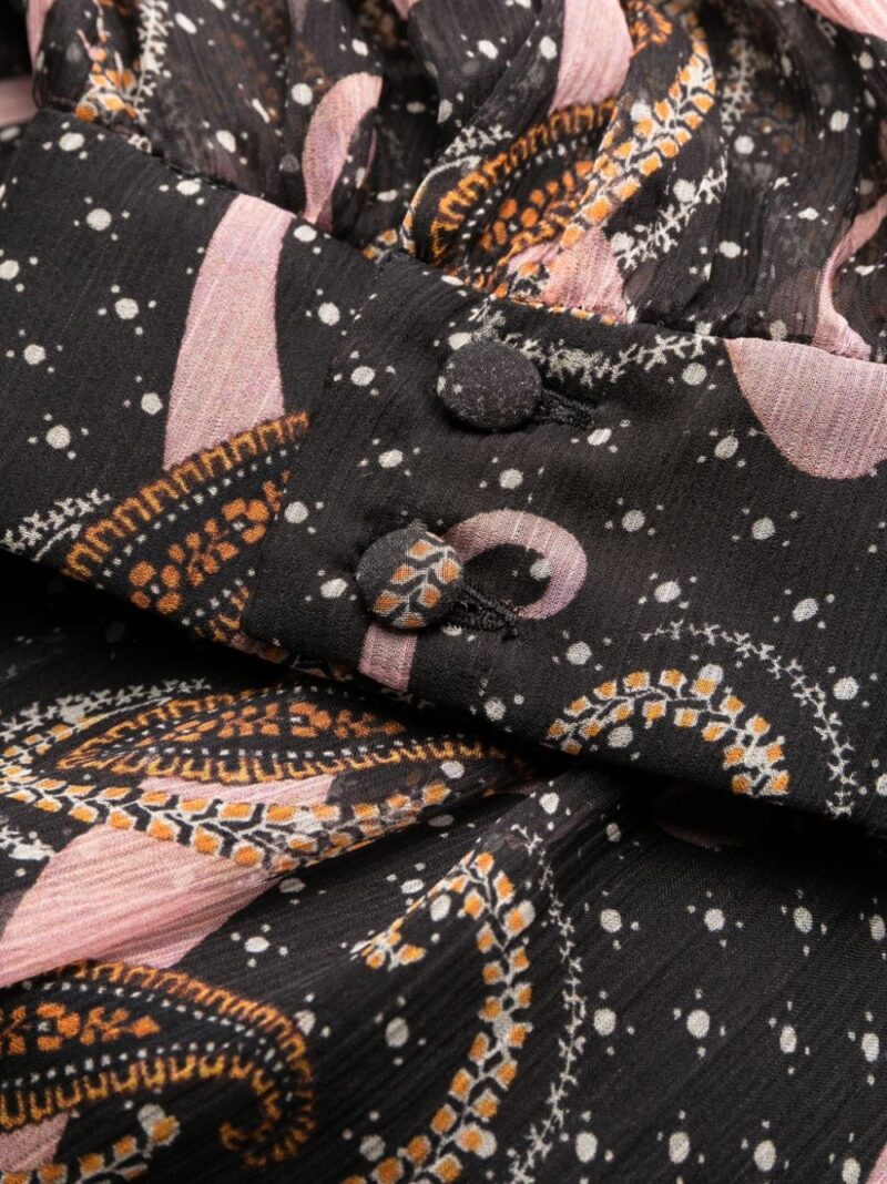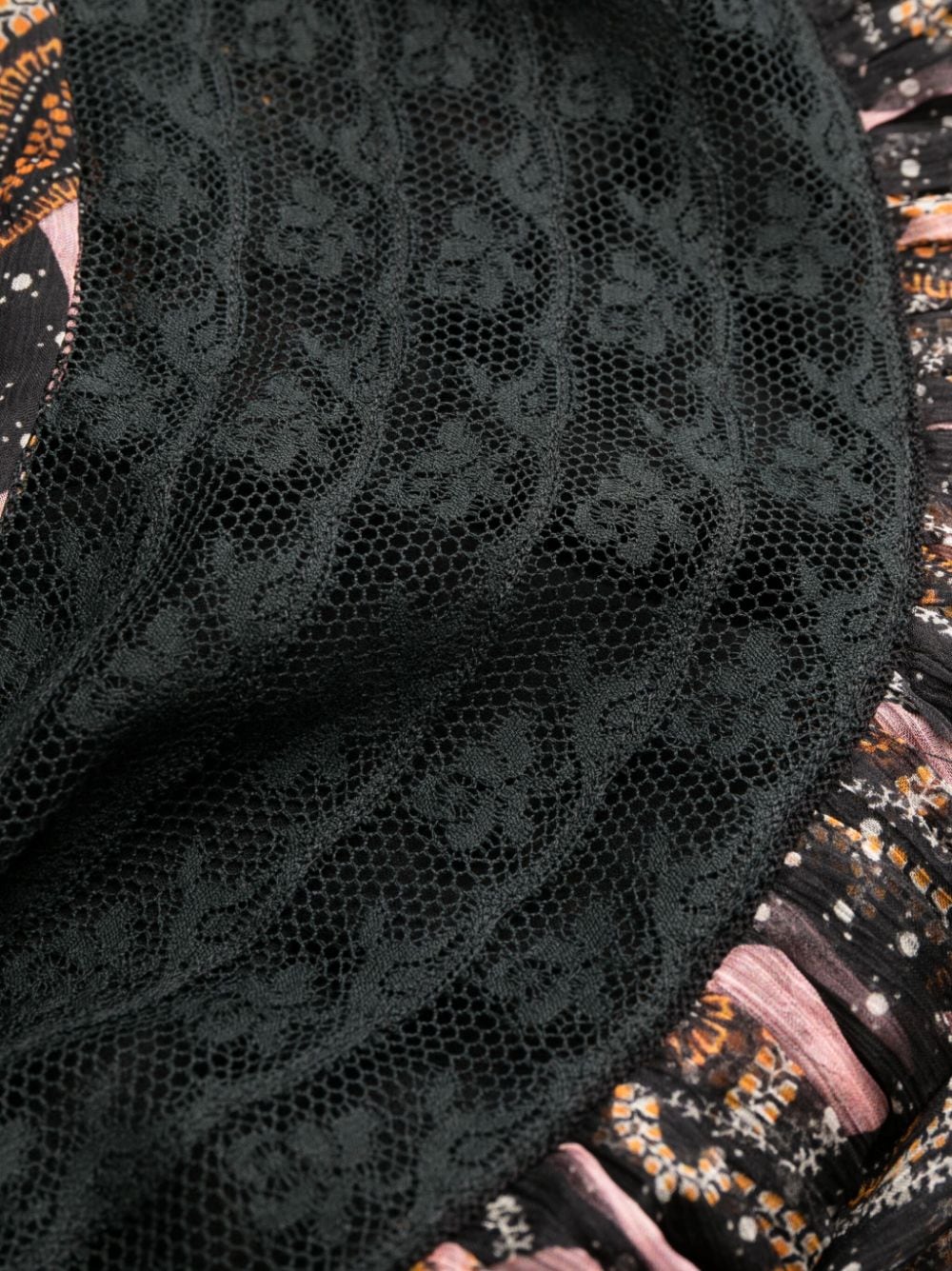 Rochie multicolor din matase creponata, loose fit, cu guler inalt, inchidere cu nasturi, maneci medii, mansete cu nasturi dubli, cordon detasabil in talie, decorata cu detalii din dantela, model Paisley si Polka dot in tesatura, captuseala din poliester si tiv evazat. Potrivita pentru sezonul toamna/iarna. 100% matase; 90% viscoza; 10% poliamida; 100% poliester.
