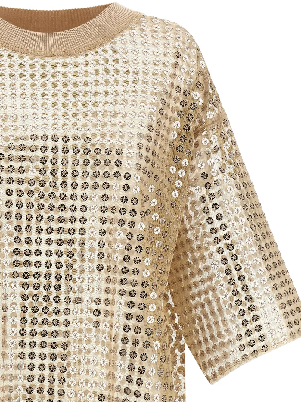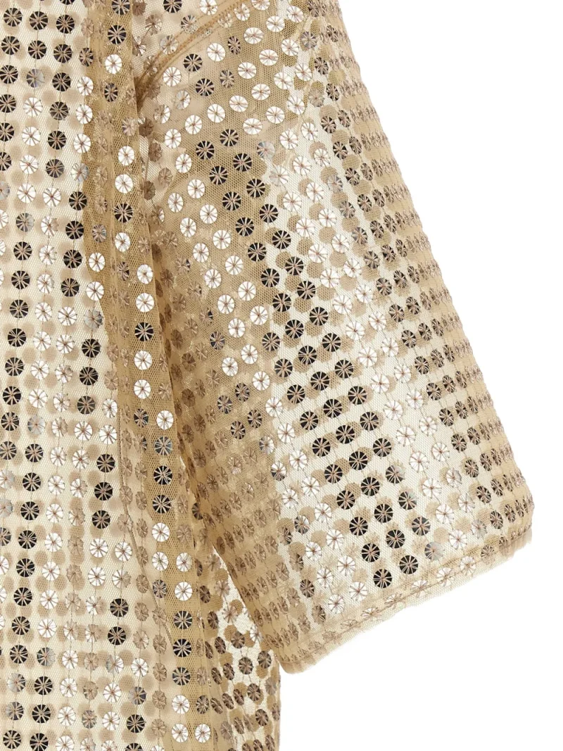 Rochie mini Fabiana Filippi Sequin-Embellished auriu, cu guler crewneck ribbed, maneci medii, decorata integral cu paiete sclipitoare si tiv drept. Potrivita pentru sezonul primavara/vara. 100% poliester.