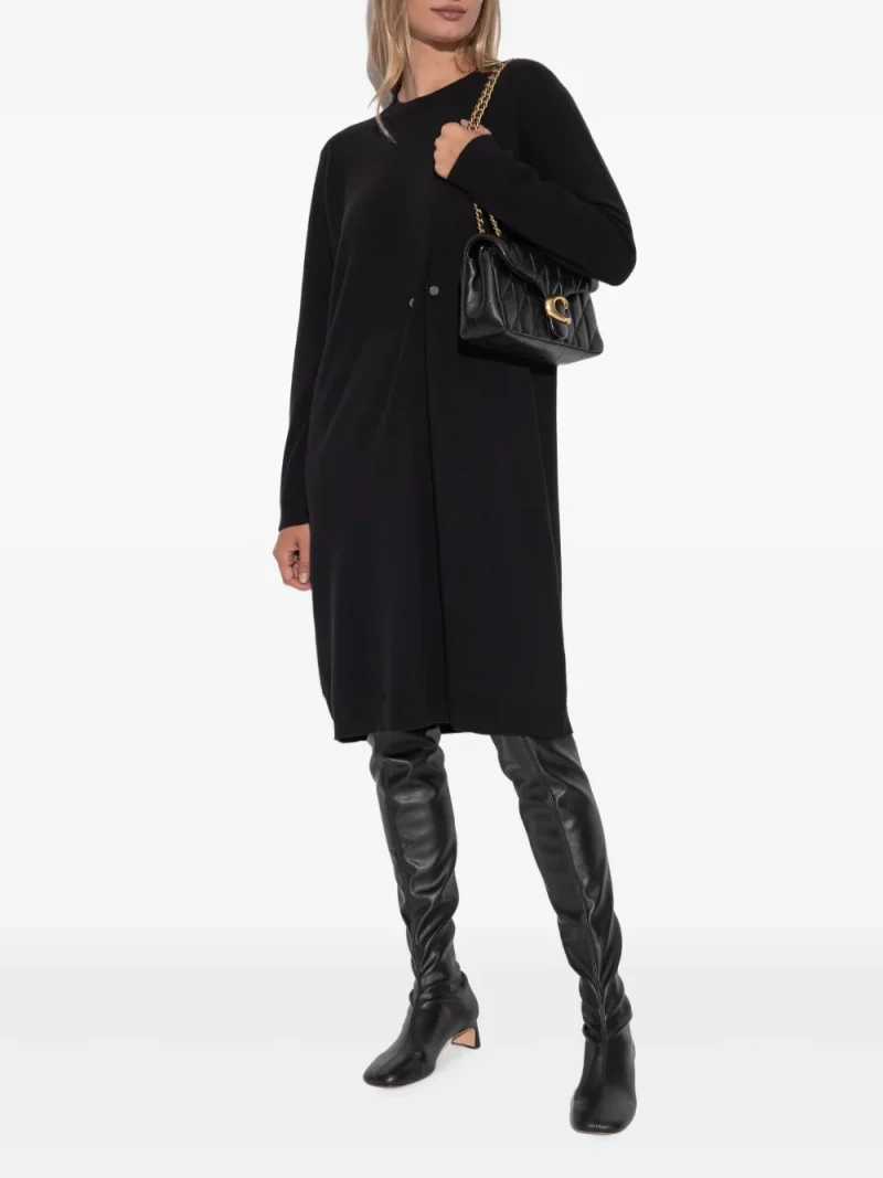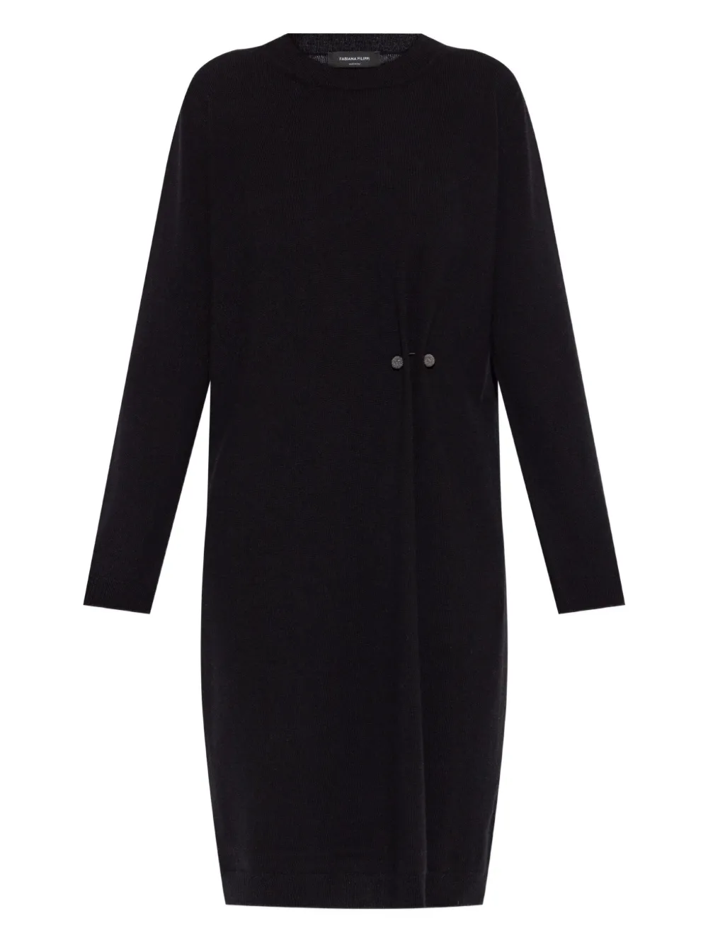 Rochie mini Fabiana Filippi Wool maro, tricotata din lana, cu guler crewneck, maneci lungi, mansete ribbed, brosa decorativa si tiv drept. Potrivita pentru sezonul toamna/iarna. 100% lana.