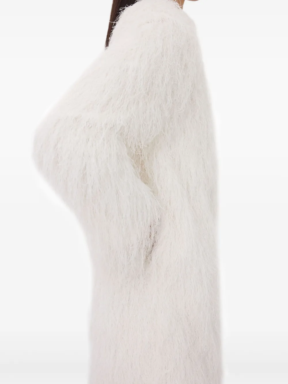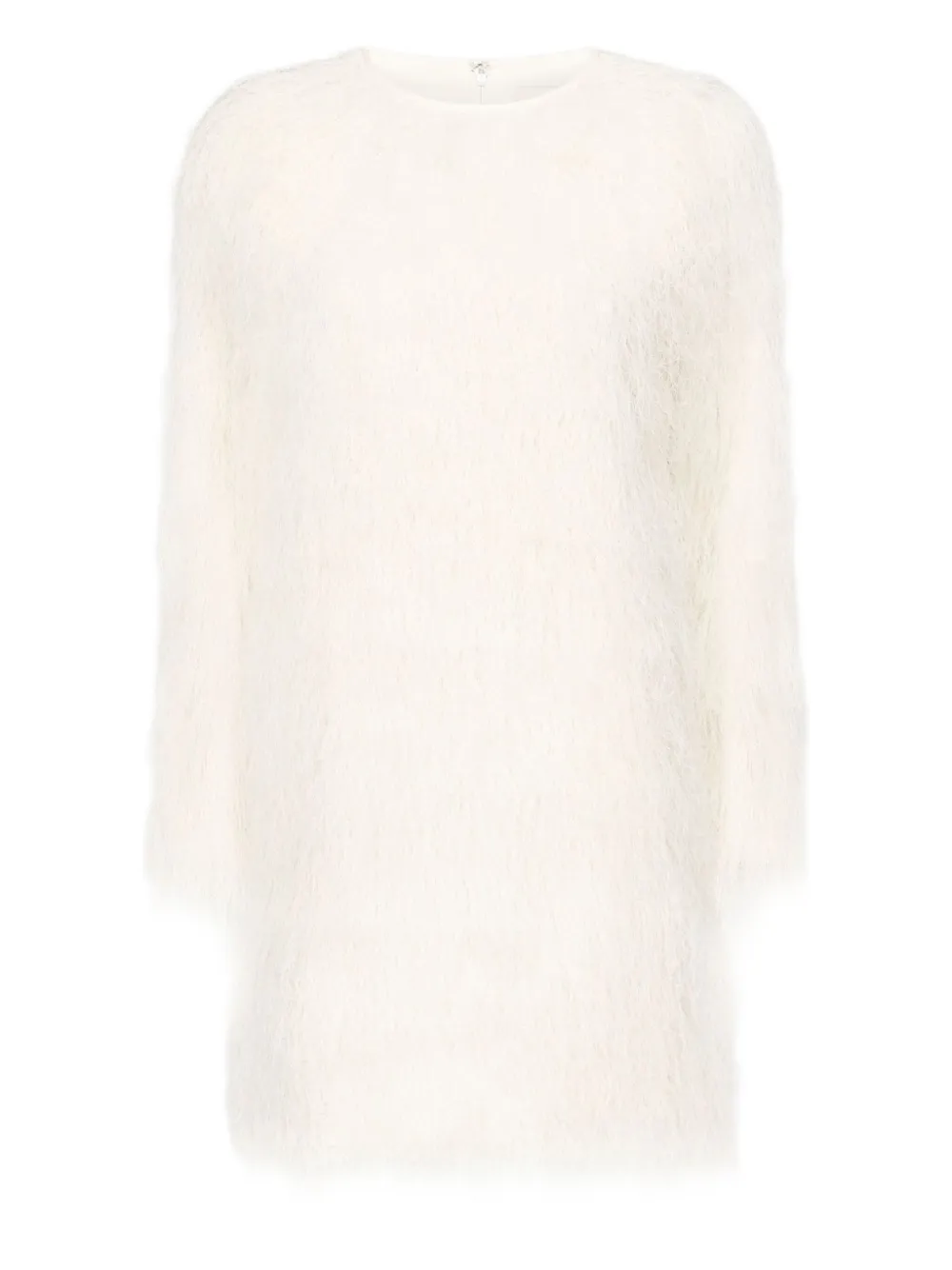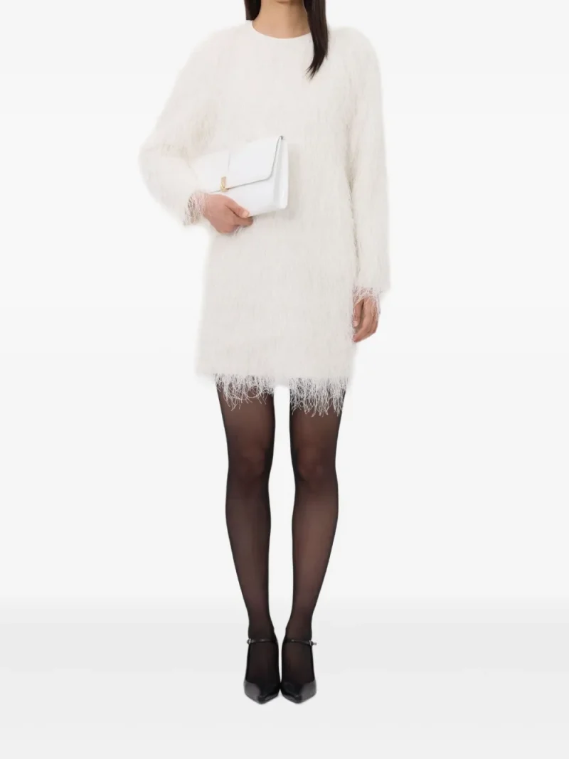 Rochie mini LouLou de Saison Tina Fringe Long Sleeve alb, cu guler crewneck, maneci lungi si tesatuta eyelash yarn. Potrivit pentru sezonul toamna/iarna. 100% poliester.