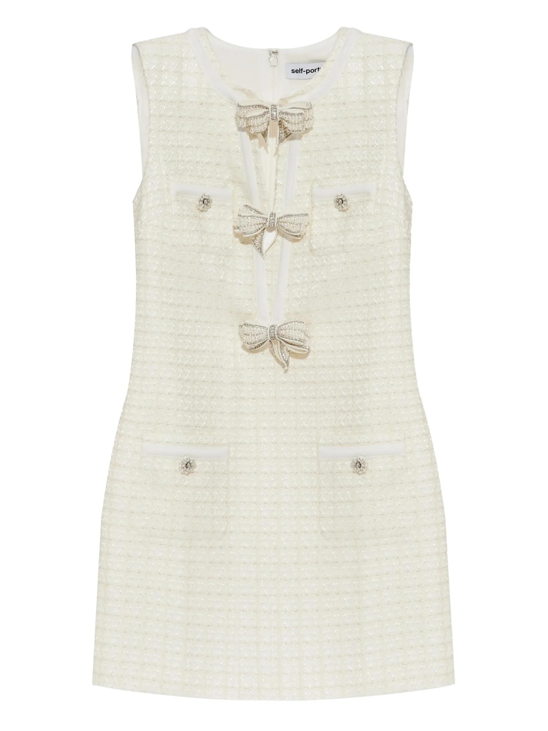 Rochie mini Self-Portrait bouclé alb, guler rotund, buzunare frontale, fara maneci si inchidere cu fermoar la spate.63% acetat 17% poliester 14% lana 5% nylon 1% metal