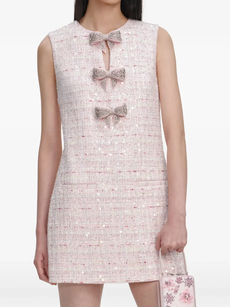 Rochie mini Self-Portrait bow-detail embellished roz, cu aplicatii din paiete, trei funde decorative, fara maneci si decolteu rotund. 52% bumbac 33% poliester 9% acril 4% metal 2% nylon