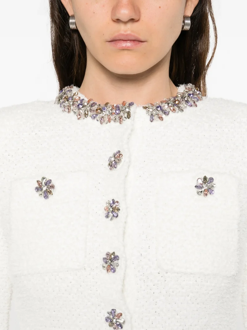 Rochie mini Self-Portrait embellished pocket alb, cu decolteu jewel, nasturi decorativi, doua buzunare frontale cu clapete ornamentate si maneci lungi. 46% poliester 44% bumbac 10% nylon