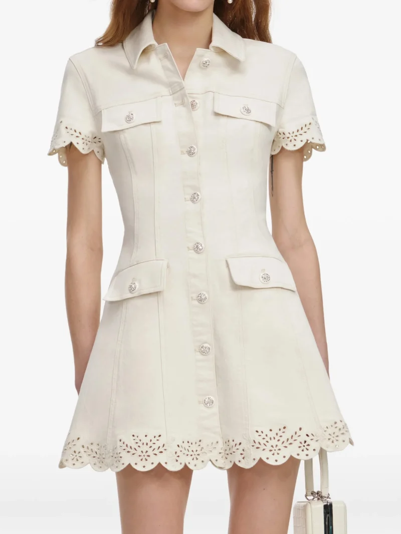 Rochie mini Self-Portrait eyelet collared alb, cu margini scalloped, guler ascutit, maneci scurte si inchidere cu nasturi. 96% bumbac 3% poliester 1% elastan