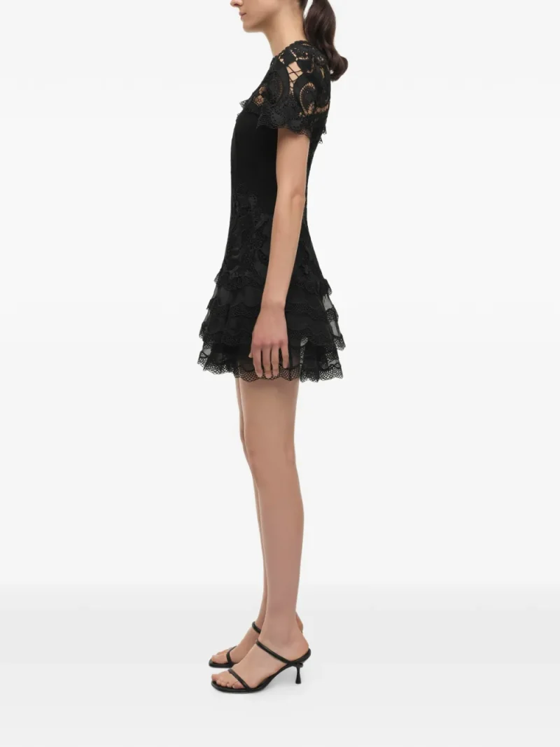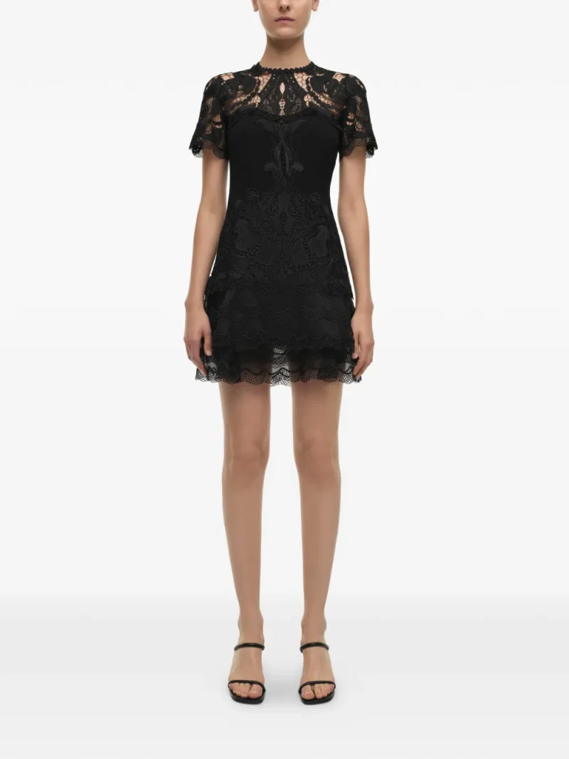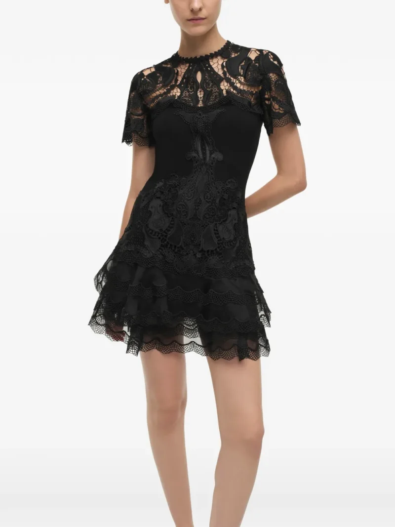 Rochie mini Simkhai Signature Paislee negru, cu guler rotund, inchidere cu fermoar ascuns la spate, maneci scurte, corset structurat, insertii din broderie pe toata suprafata, corset structurat, fusta evazata si tiv feston. 100% textil.