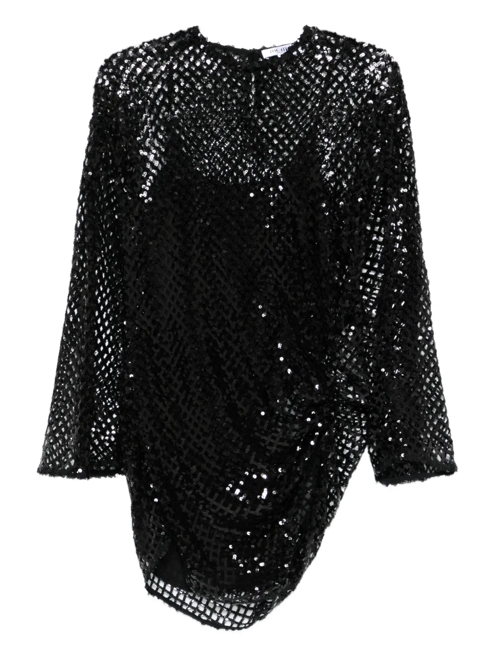 Rochie mini The Attico Mesh Rushed negru, design in straturi, semitransparenta, cu umeri cazuti, manci lungi evazate, slit pe laral, tesatuar tip plasa si tiv drept. Potrivita pentru sezonul toamna/iarna. 100% poliester. 100% poliamida.