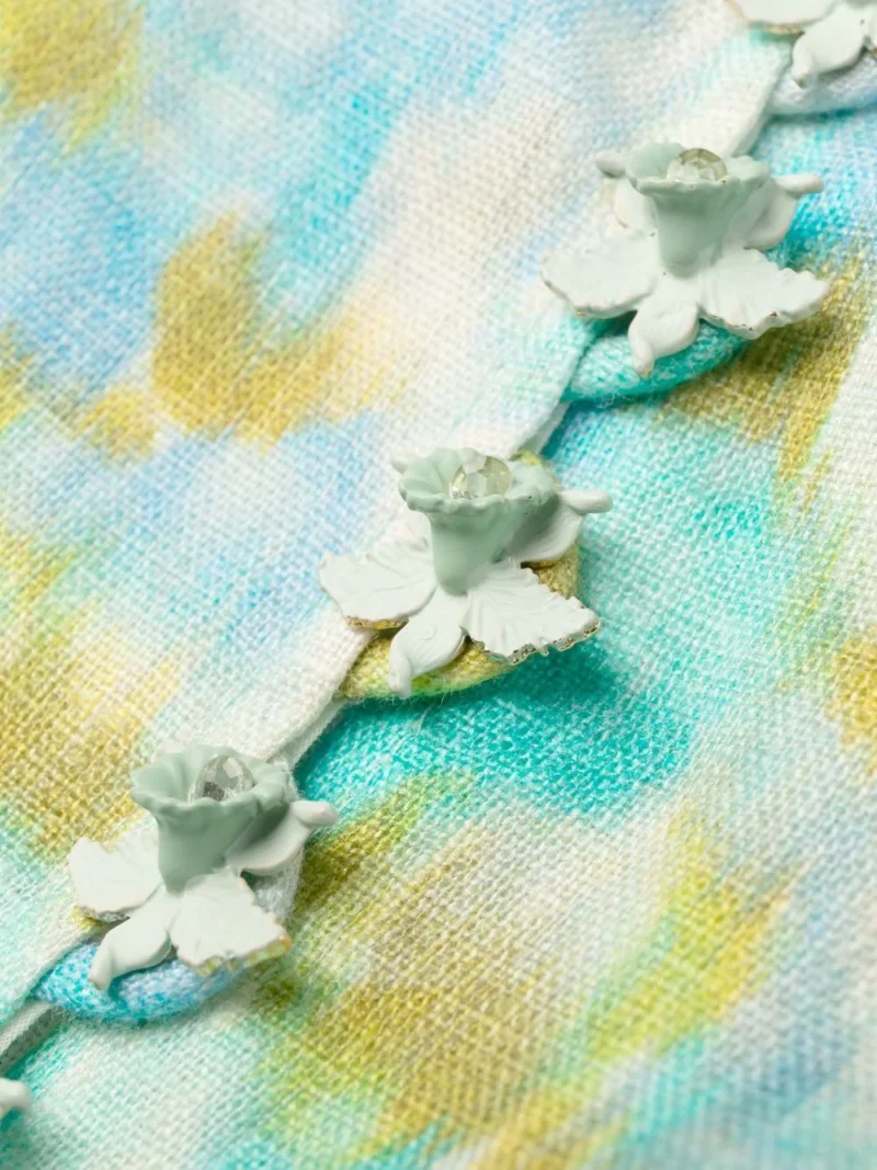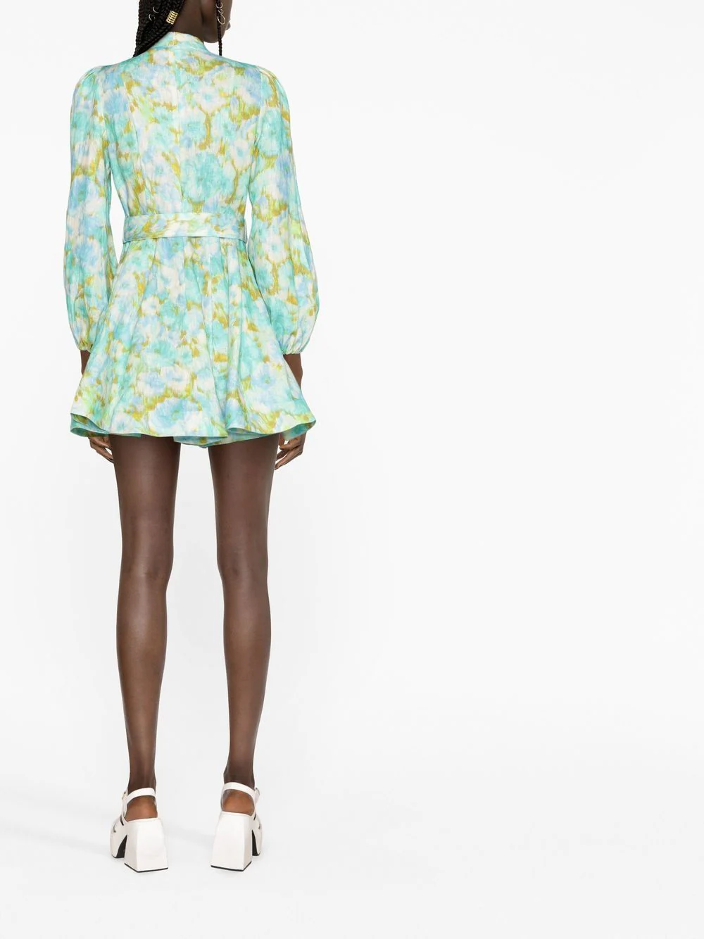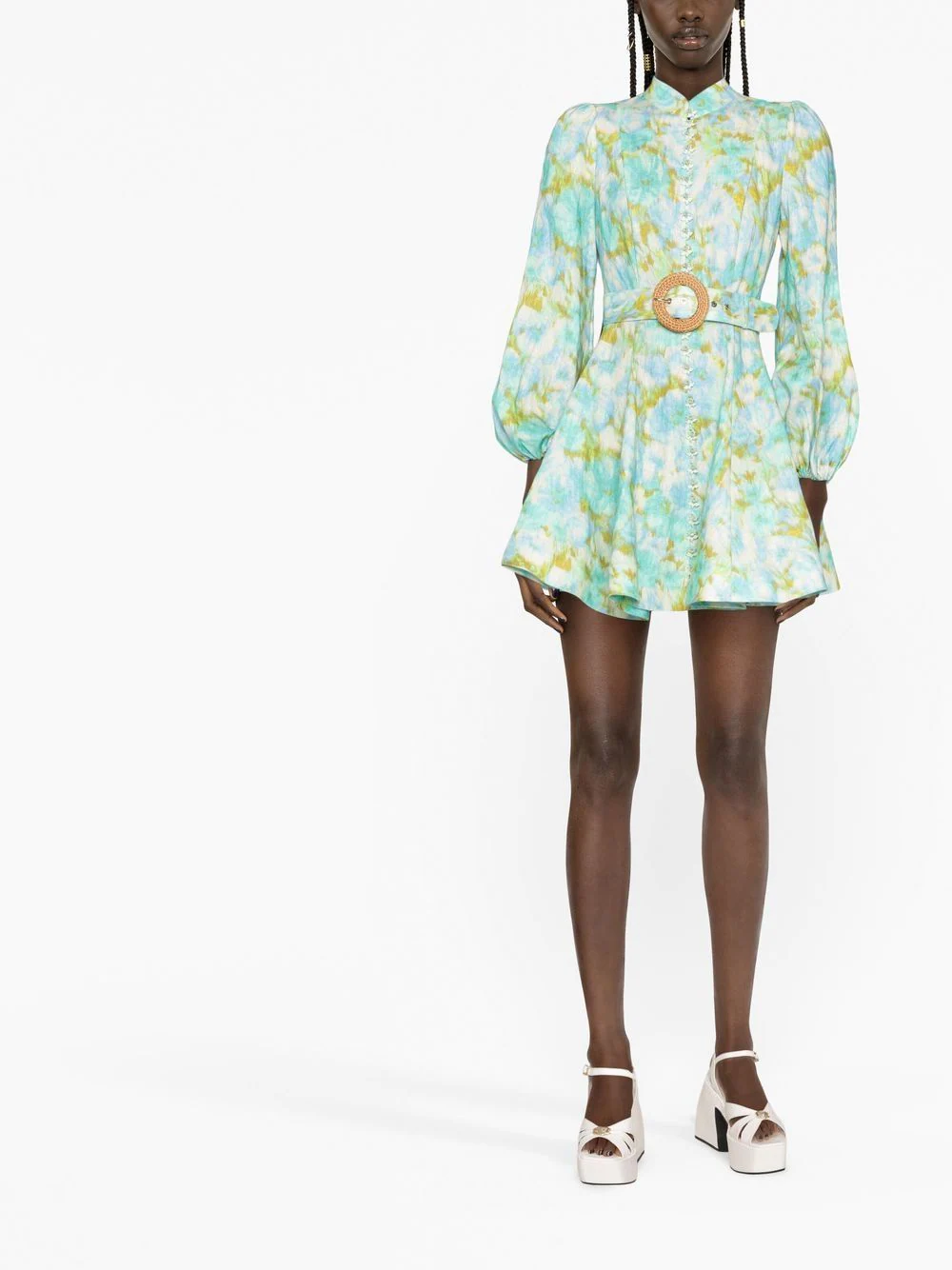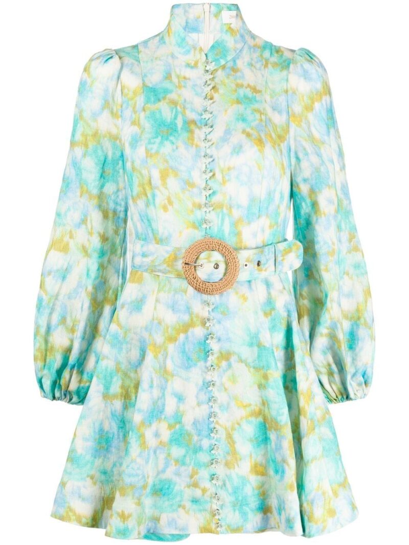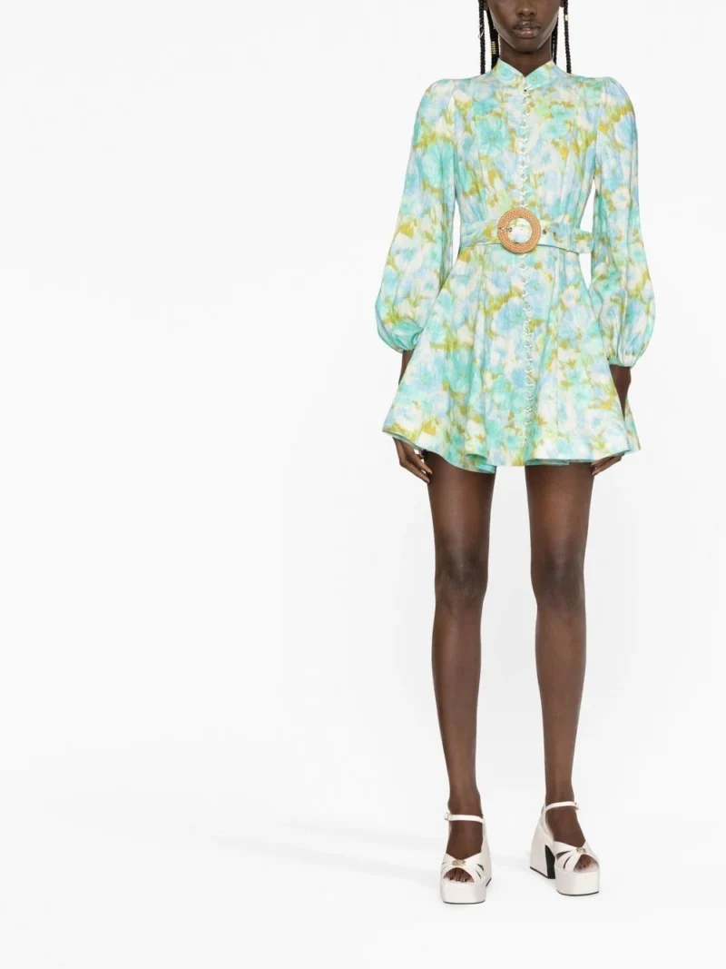 Rochie mini multicolor din in, cu guler tunica si inchidere cu femoar ascuns la spate, maneci bufante lungi, mansete elastice, model Zimmermann High Tide imprimat pe toata suprafata, curea textila in jurul taliei si tiv drept. Potrivita pentru sezonul primavara/vara. 100% in.