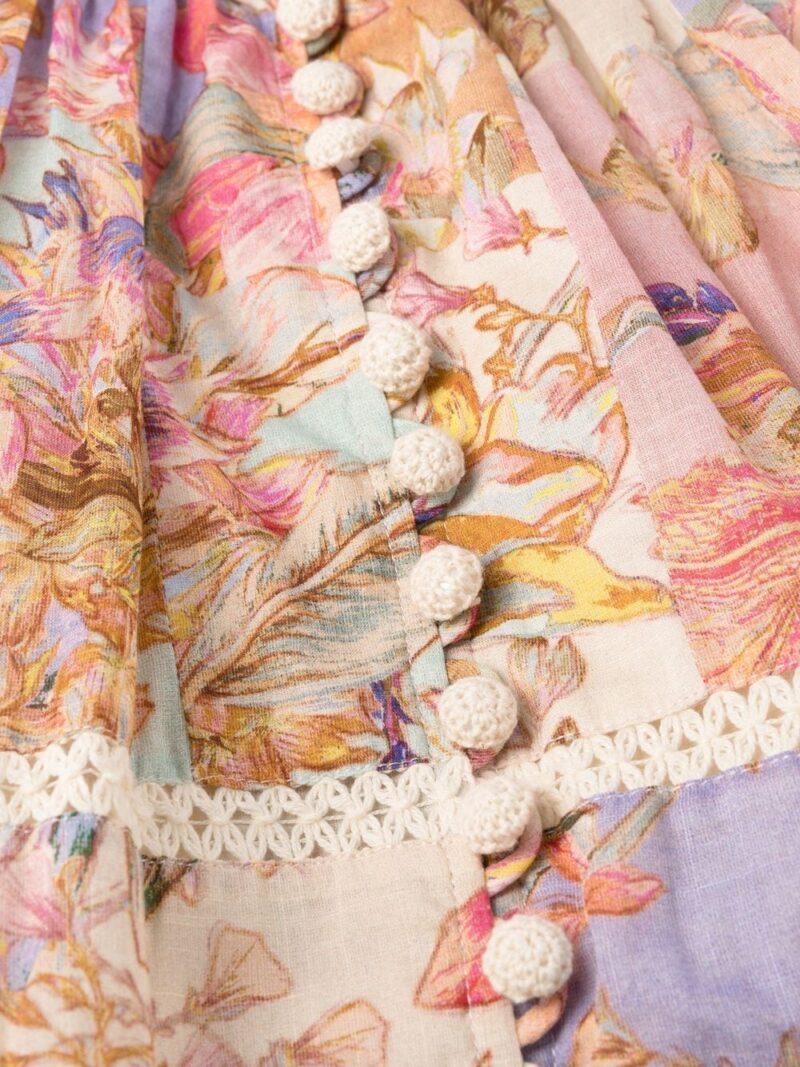 Rochie mini multicolor din in, cu guler in V si inchidere cu fermoar ascuns la spate, maneci bufante medii, mansete elastice, model Zimmermann Cira imprimat pe toata suprafata, design din panouri, captuseala din bumbac si tiv feston. Potrivita pentru sezonul primavara/vara. 100% in; 100% bumbac.