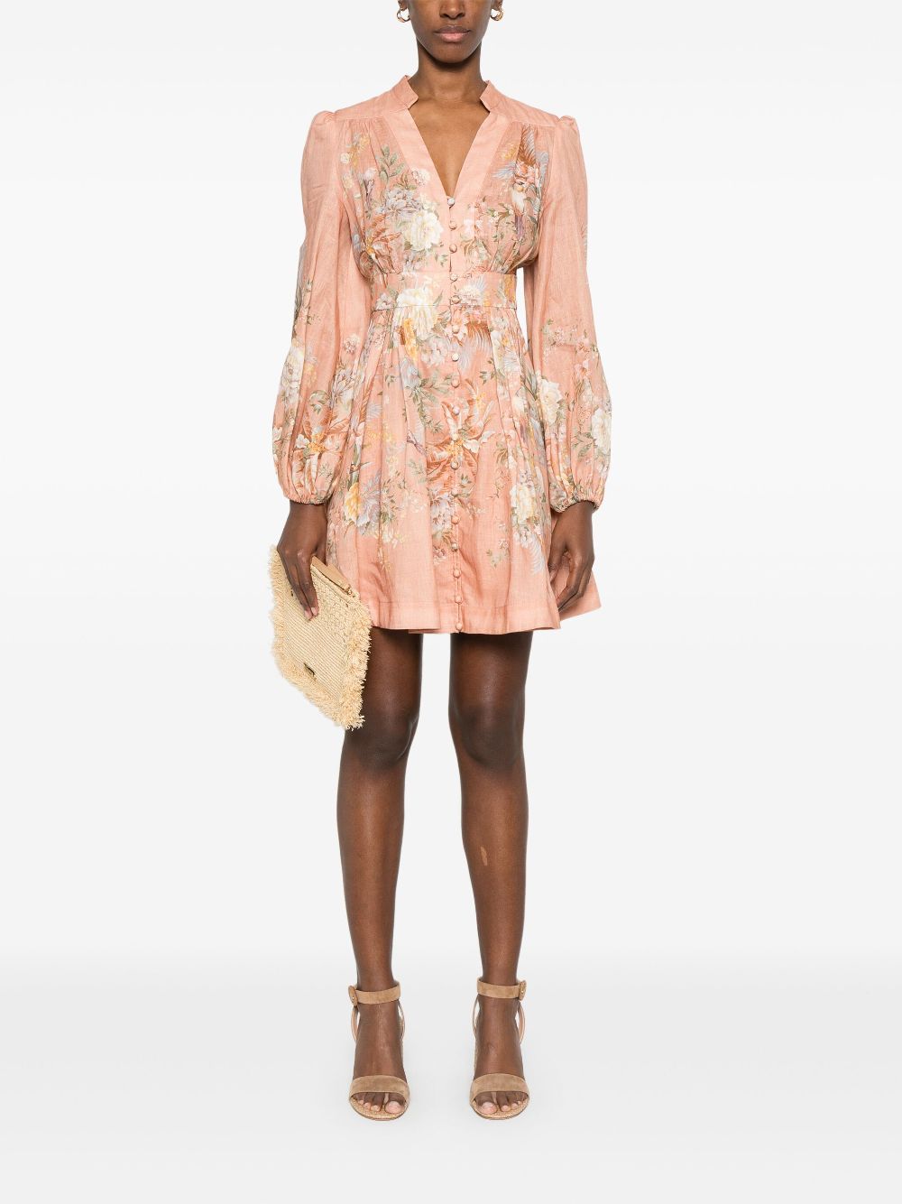 Rochie mini Zimmermann Tallow Plunge roz, din in, cu decolteu in V, inchidere cu fermoar la spate si nasturi decorativi pe partea din fata, maneci bufante, mansete elastice, talie evidentiata, grafica Tallow Plunge imprimata si tiv drept. Potrivita pentru sezonul primavara/vara. 100% in.