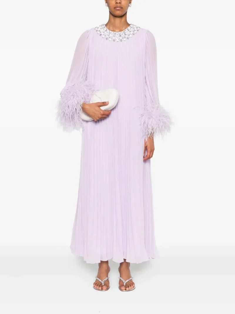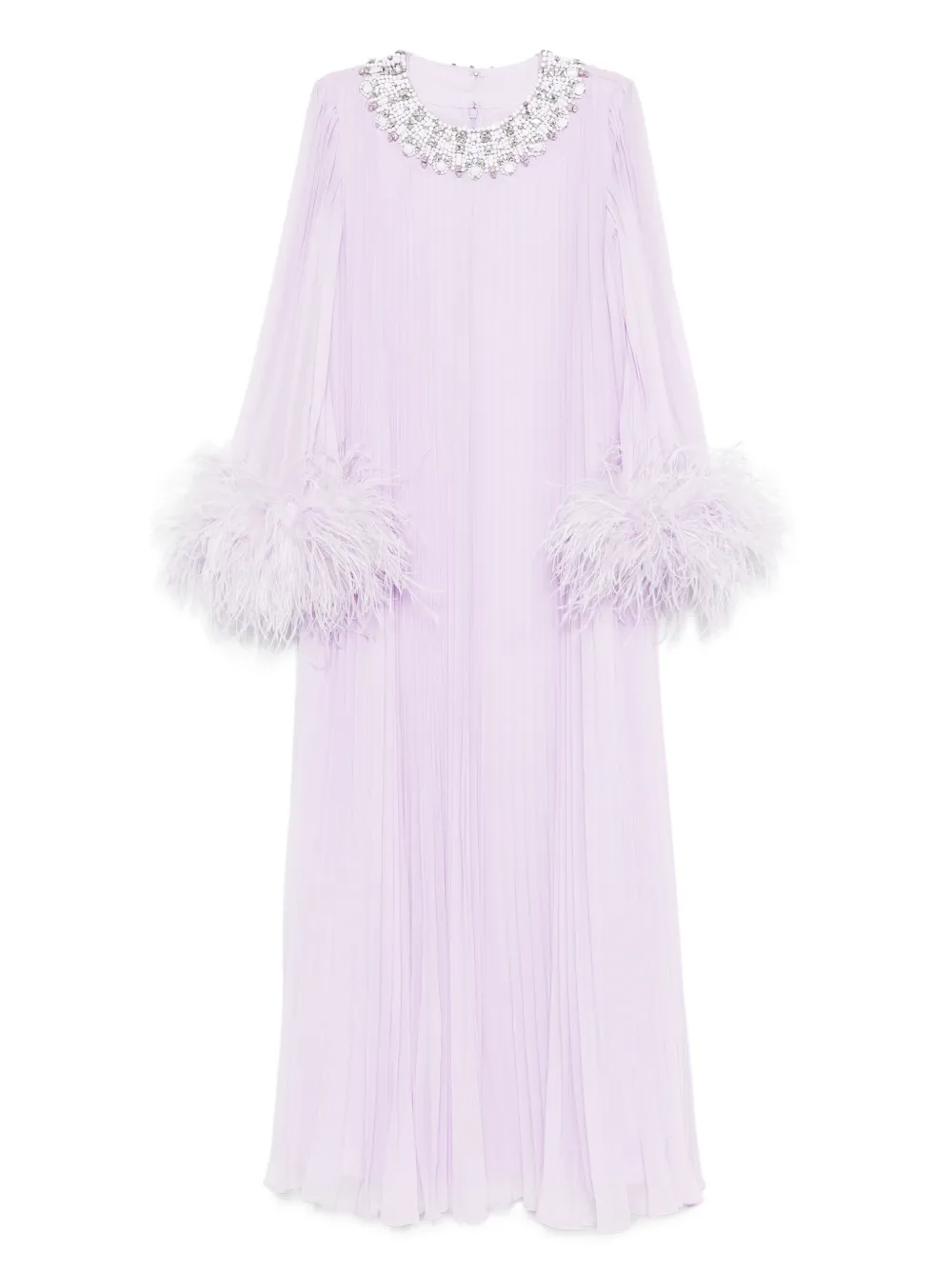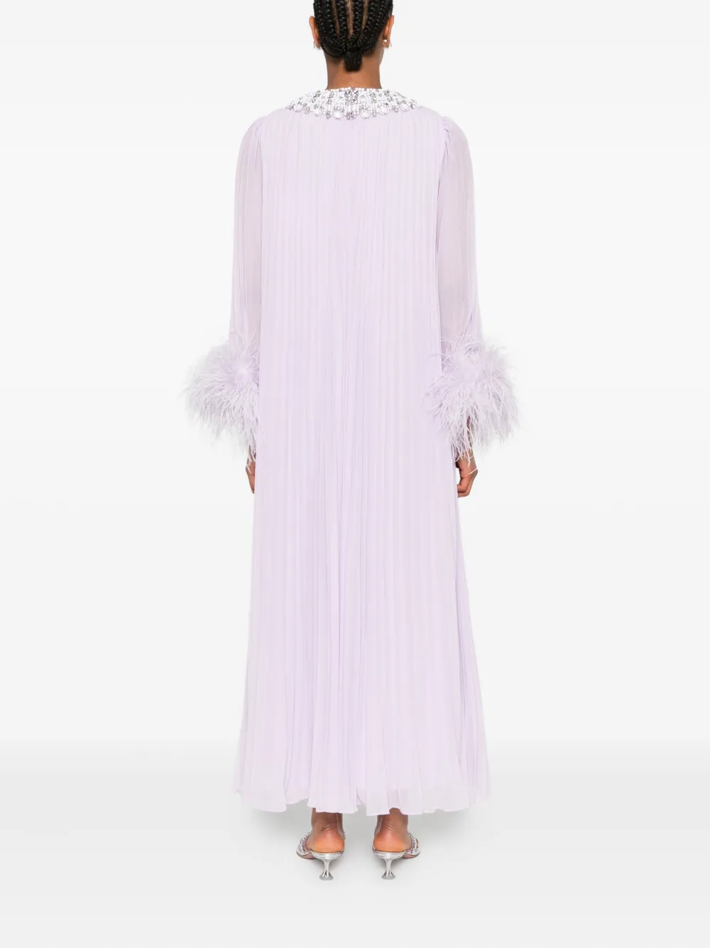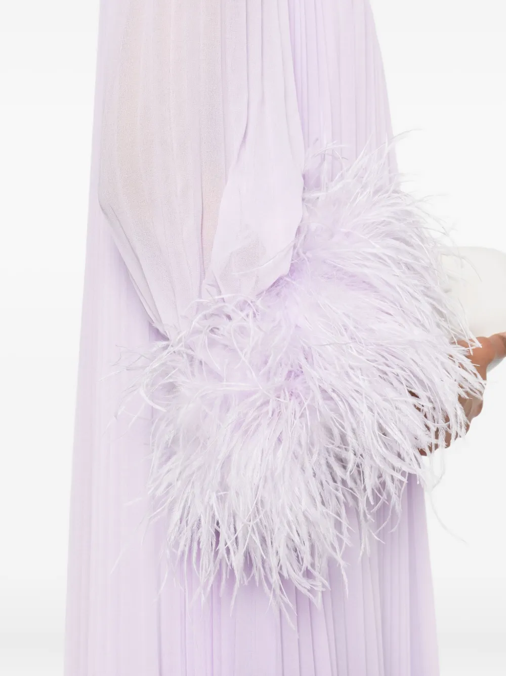 Rochie Self-Portrait Chiffon Feather-Detail mov, cu fit evazat, din poliester, cu guler rotund decorat cu cristale sclipitoare, maneci lungi evazate cu mansete din pene, pliuri decorative si tiv drept. Potrivita pentru sezonul primavara/vara. 100% poliester; 100% pene de strut; 100% poliester.