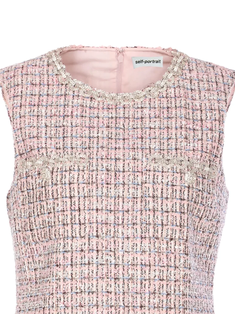 Rochie Self-Portrait crystal-embellished roz, fara maneci, inchidere cu fermoar la spate, cristale aplicate si buzunare pe partea din fata.10% lana 85% poliester 5% vascoza
