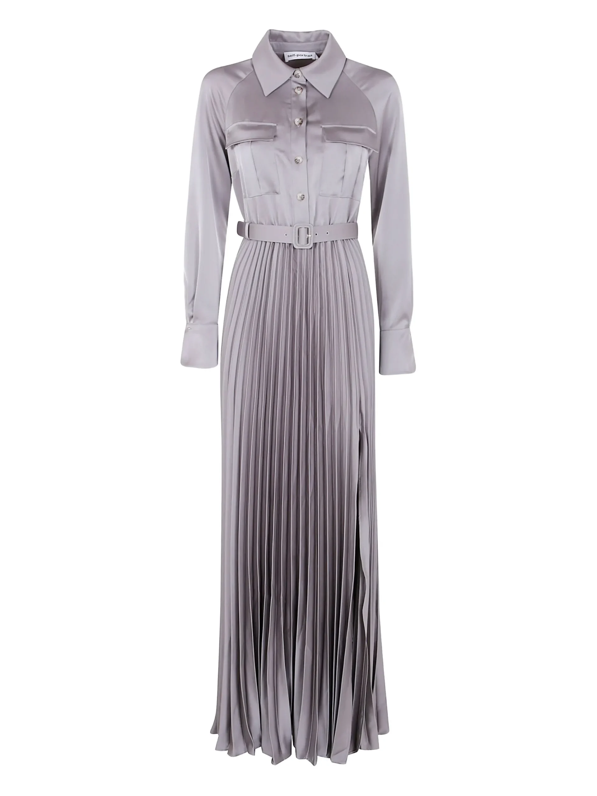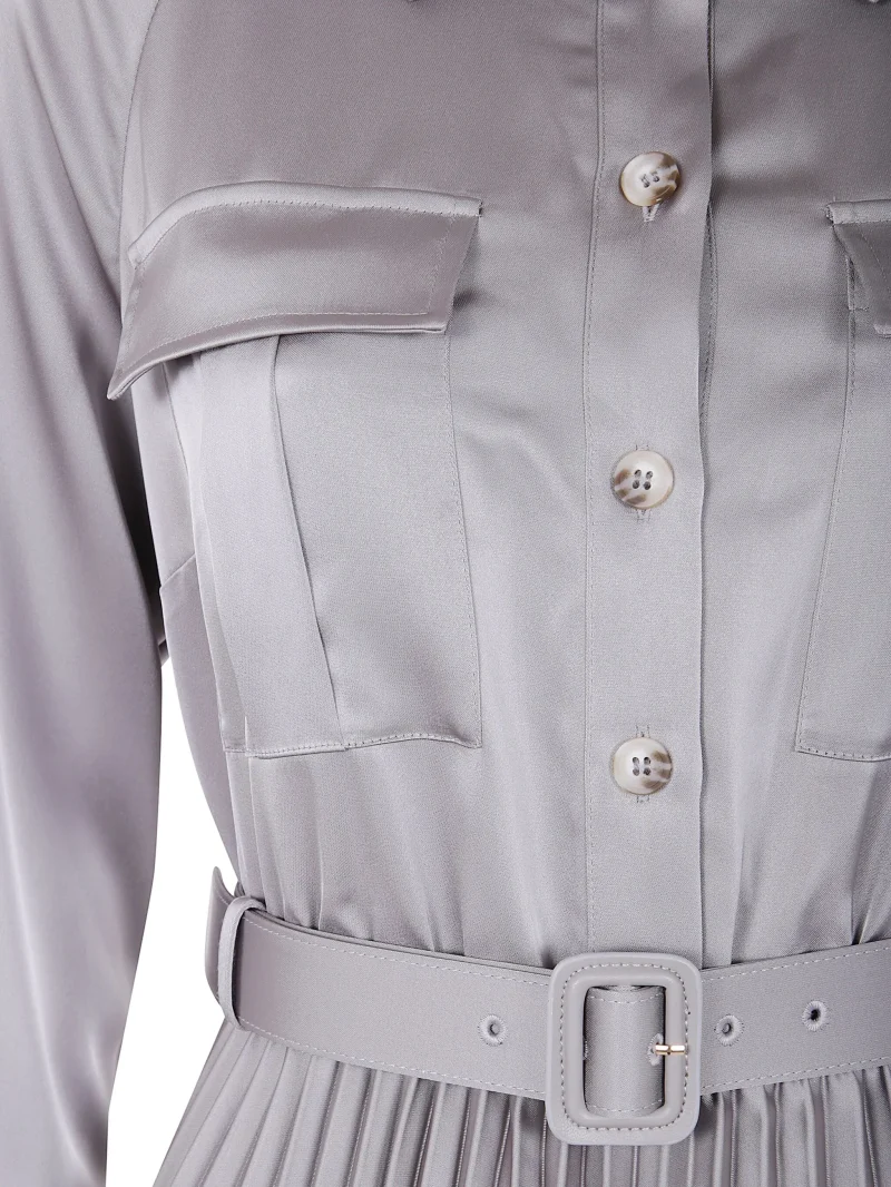 Rochie Self-Portrait Pleated gri, inchidere cu nasturi, guler clasic, buzunare cu clapa, talie cu curea, maneci lungi, pliuri. 100% poliester