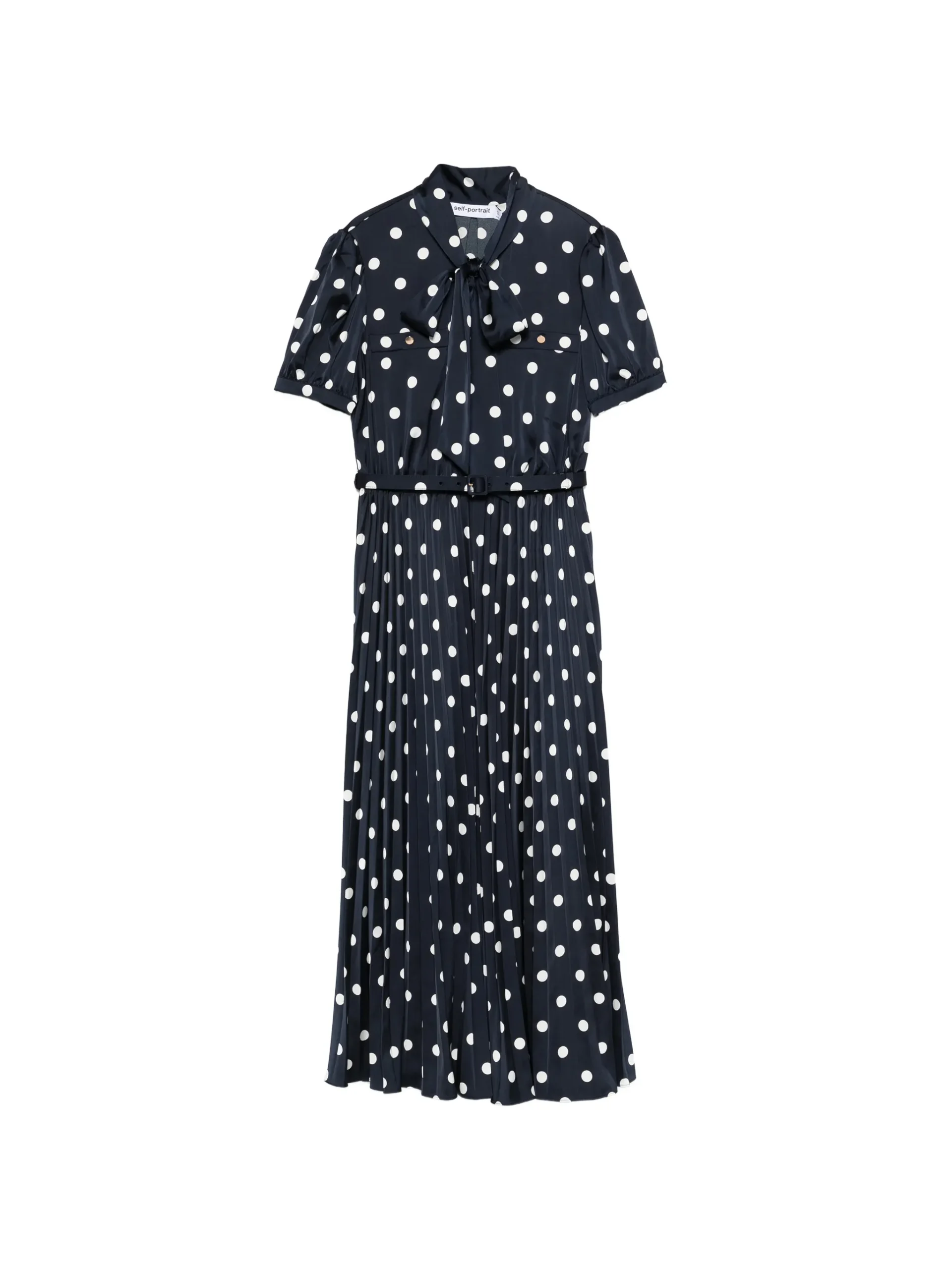 Rochie Self-Portrait Polka Dot albastru, cu model cu buline, inchidere funda, maneci scurte, cordon in talie si fusta plisata.96% poliester 4% elastan