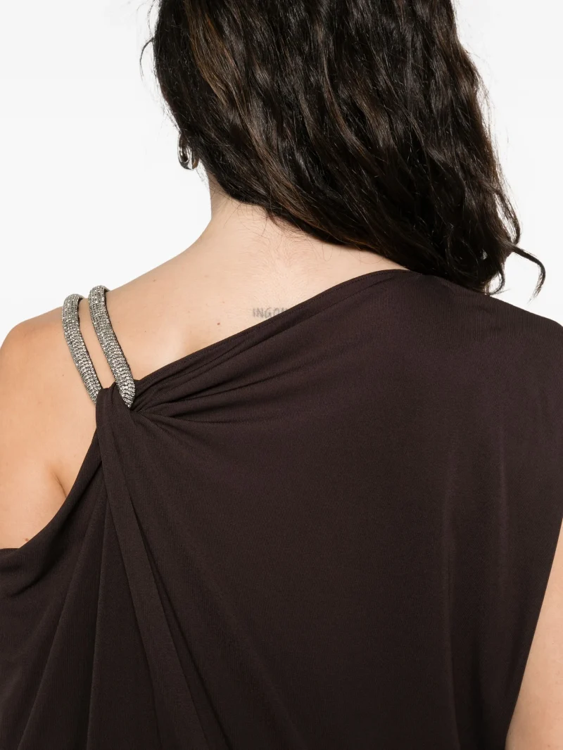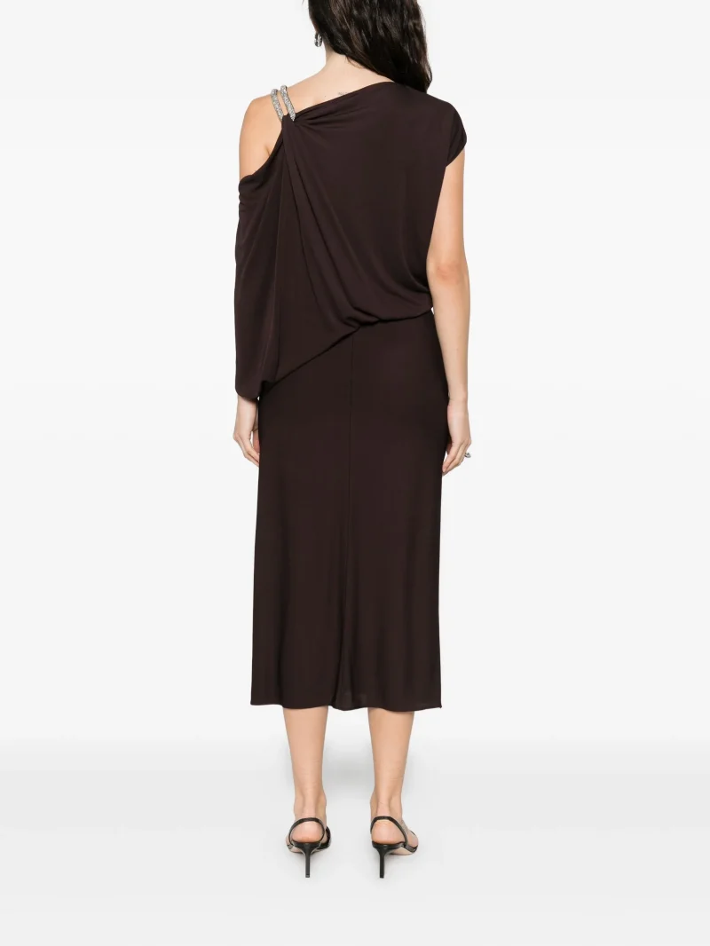 Rochie TOM FORD maro, cu design asimetric one-shoulder, maneca scurta si croiala moderna.100% vascoza