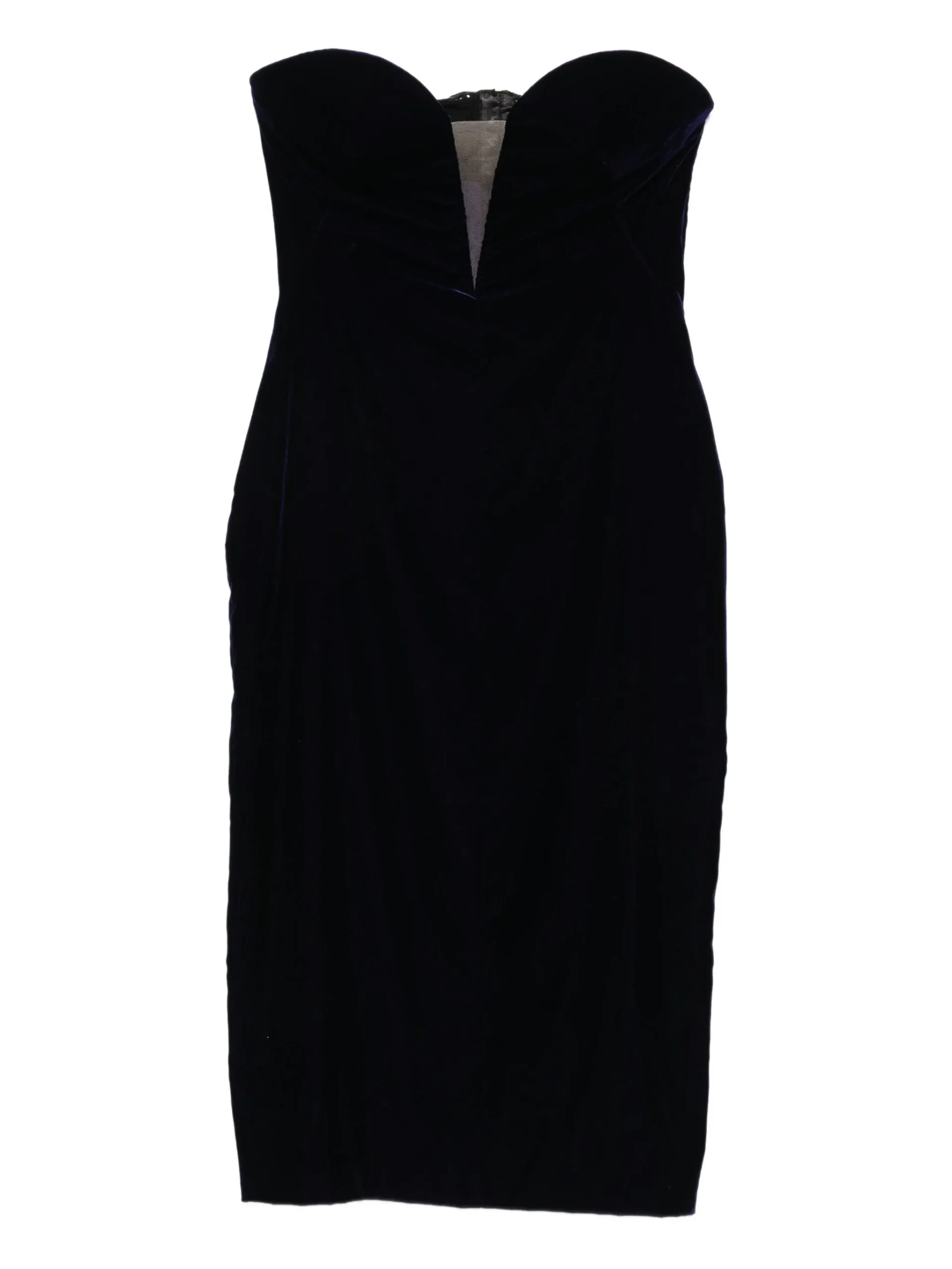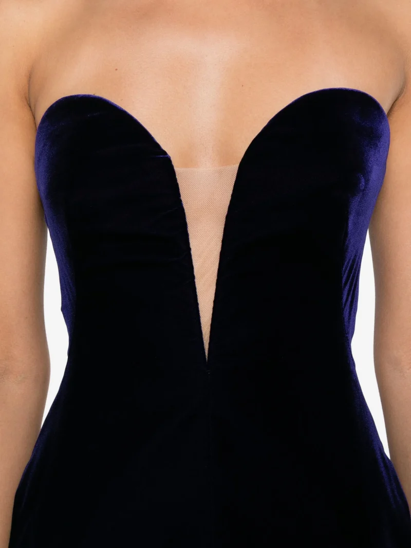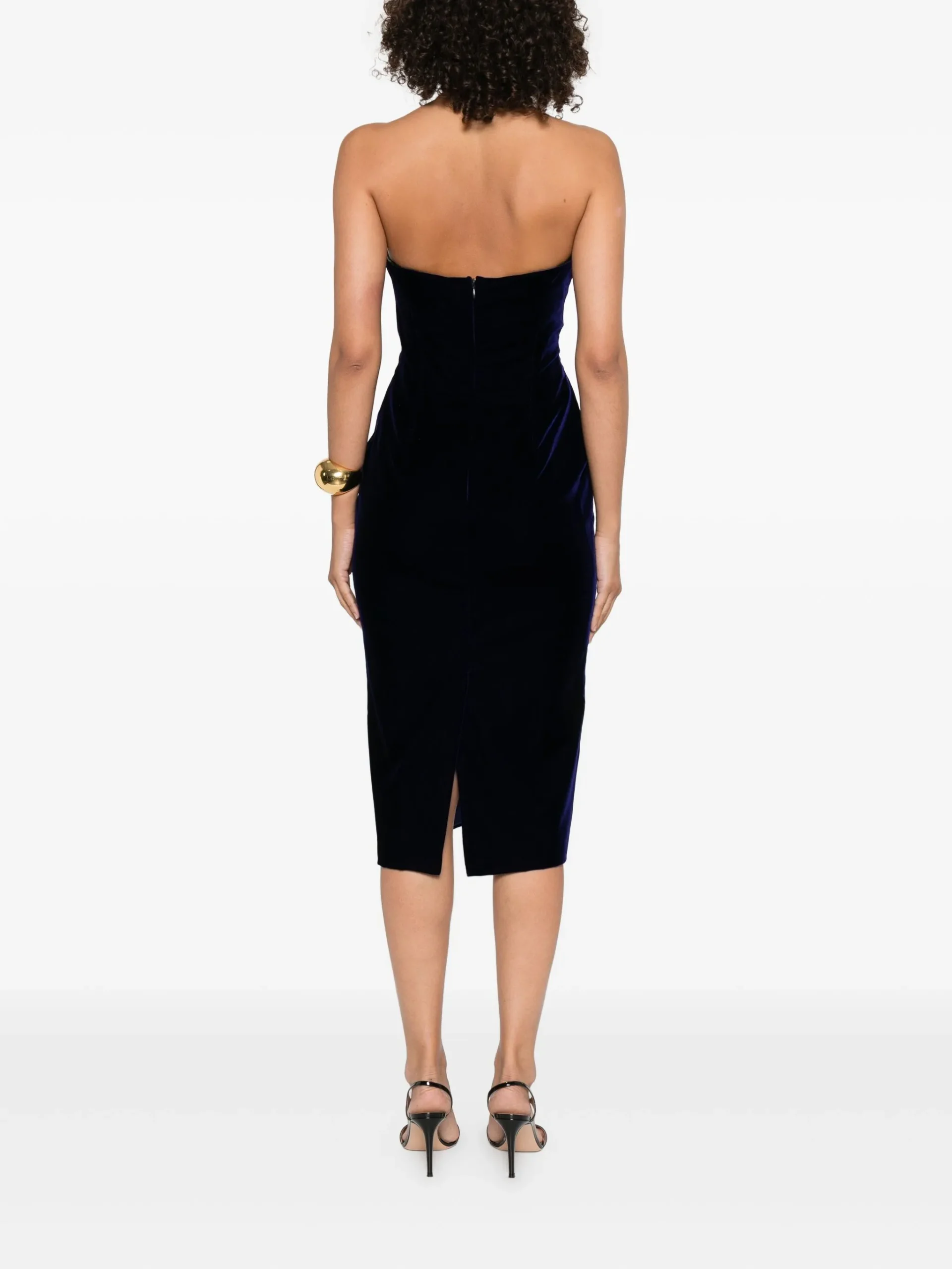 Rochie TOM FORD velvet strapless midnight blue, cu decolteu sweetheart, fermoar ascuns la spate, tiv drept si lungime midi. 66% vascoza 31% bumbac 3% elastan