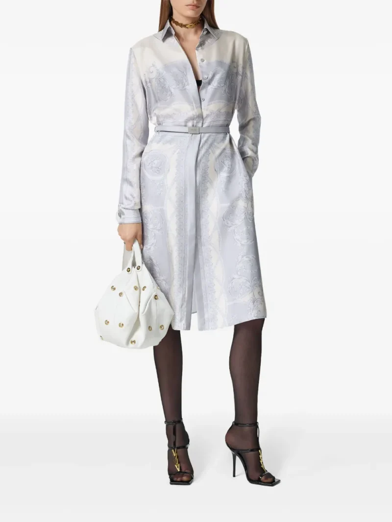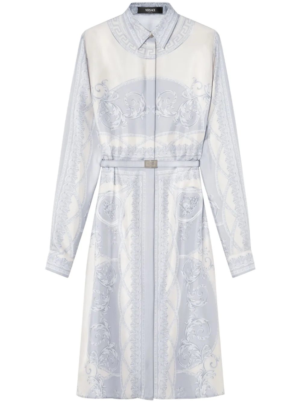 Rochie Versace Barocco-Print Shirt albastru, tip camasa, din matase, cu guler clasic, inchidere cu nasturi ascunsi, maneci lungi, mansete cu nasturi, buzunare diagonale, curea textila in jurul taliei cu inchidere catarama si logo Versace gravat, grafica Barocco imprimata si tiv drept. Potrivita pentru sezonul primavara/vara. 100% matase.