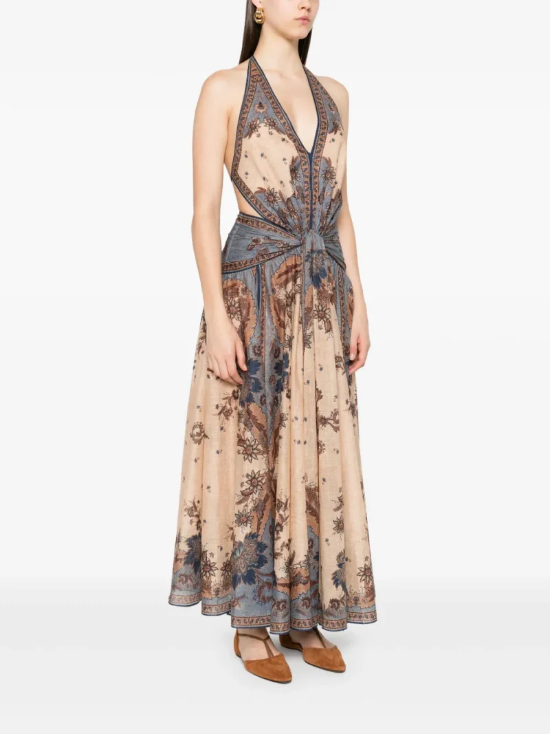 Rochie Zimmermann Ascension Plunge Halter Maxiotton verde, realizata din bumbac, halterneck, cu decolteu adanc in V, talie marcata cu decupaje laterale, fusta evazata cu detalii fluide si grafica florala imprimata. Potrivita pentru sezonul toamna/iarna. 100% bumbac; 100% bumbac.