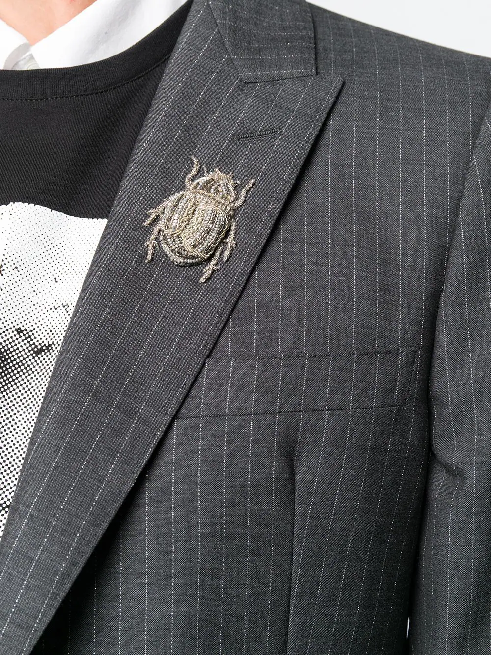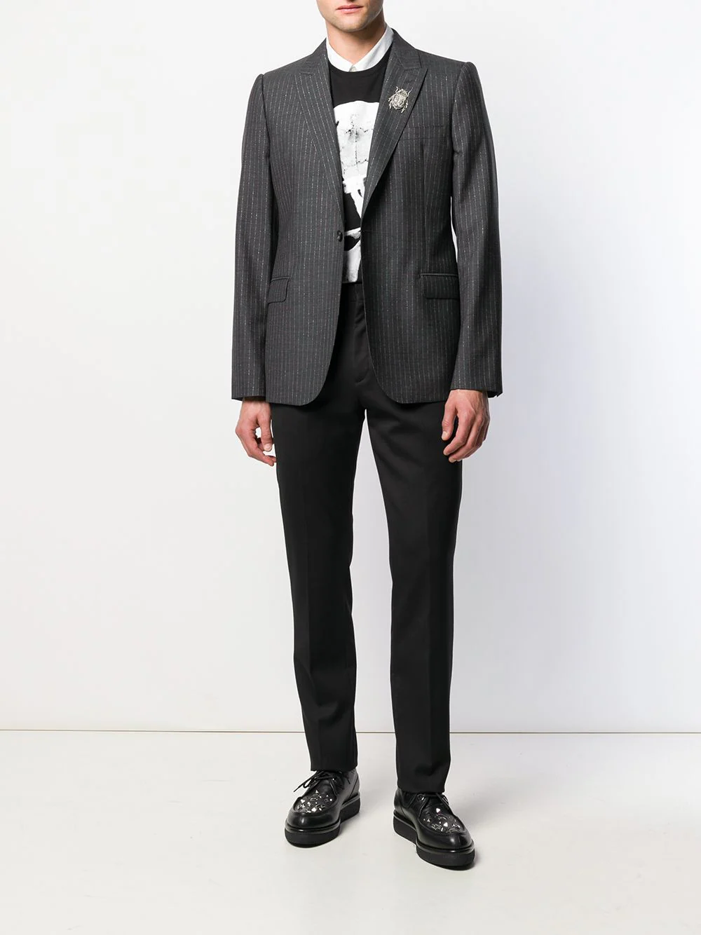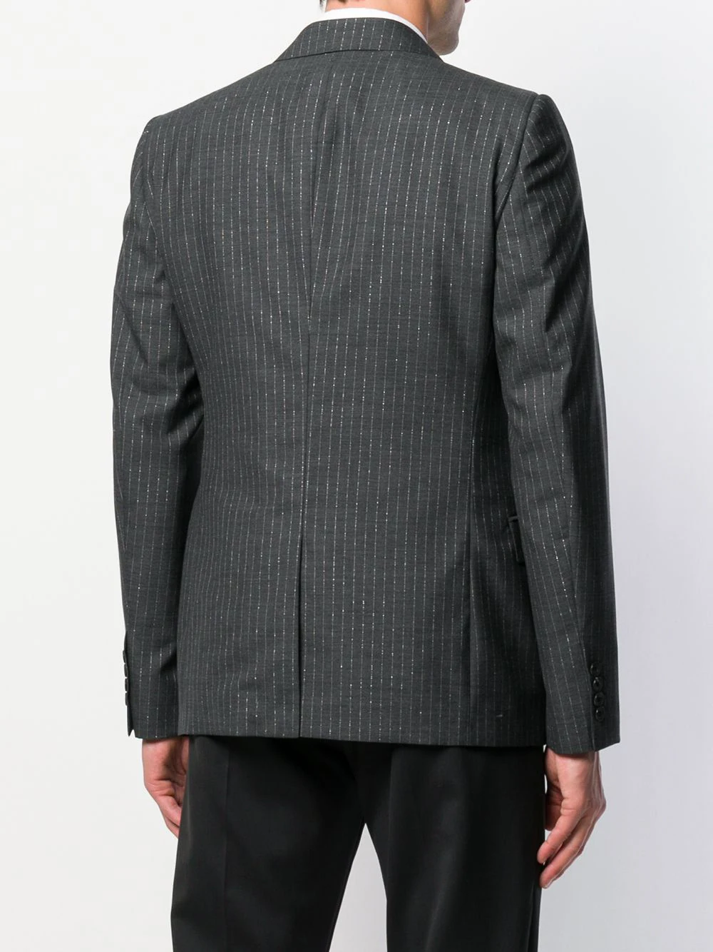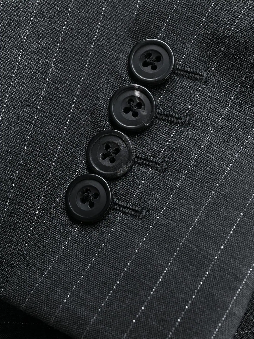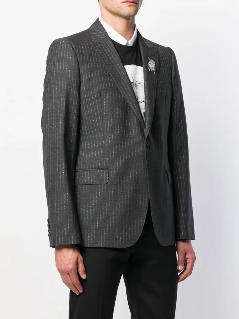 Sacou gri din lana, cu rever tip peak decorat cu brosa, inchidere cu nasture, maneci lungi, mansete cu nasturi, dungi verticale pe toata suprafata, buzunare laterale, buzunar la piept, captuseala din cupro si tiv drept. Potrivit pentru sezonul toamna/iarna. 98% lana; 1% poliester metalizat; 1% cupro; 100% poliamdia; 100% cupro; 100% bumbac.