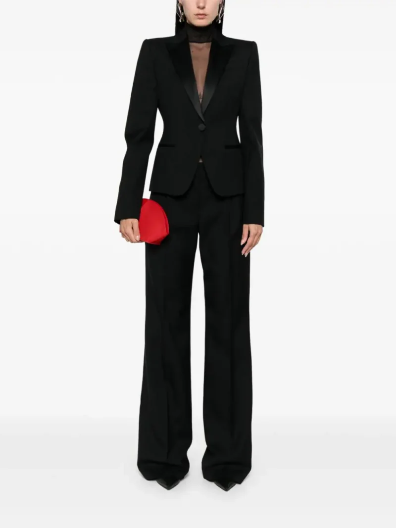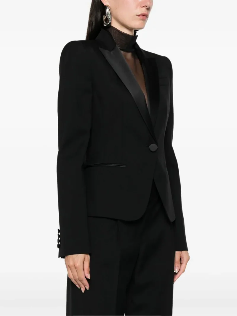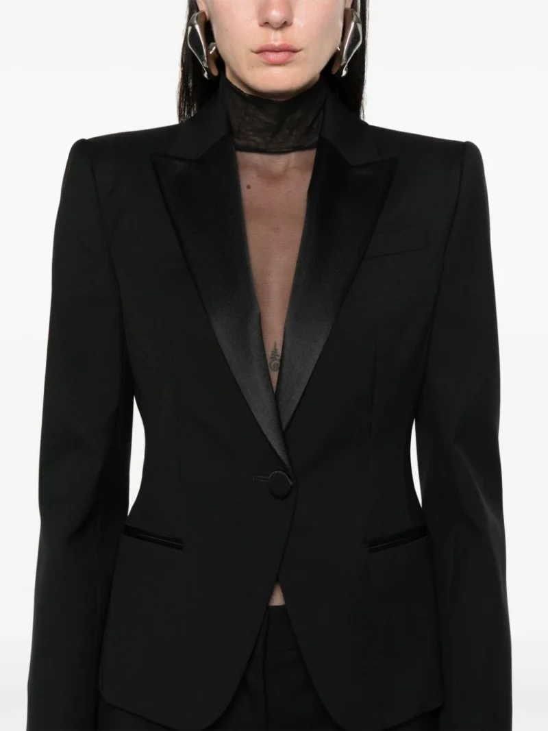 Sacou Alexander McQueen Wool negru, din lana, cu rever crestat din matase, inchidere cu un singure nasture, umeri conturati, mansete cu nasturi, buzunare tip welt, decoratiune Chain pe spate si tiv curbat. Potrivit pentru sezonul toamna/iarna. 100% lana; 78% matase; 22% poliester; 55% bumbac; 45% cupro.