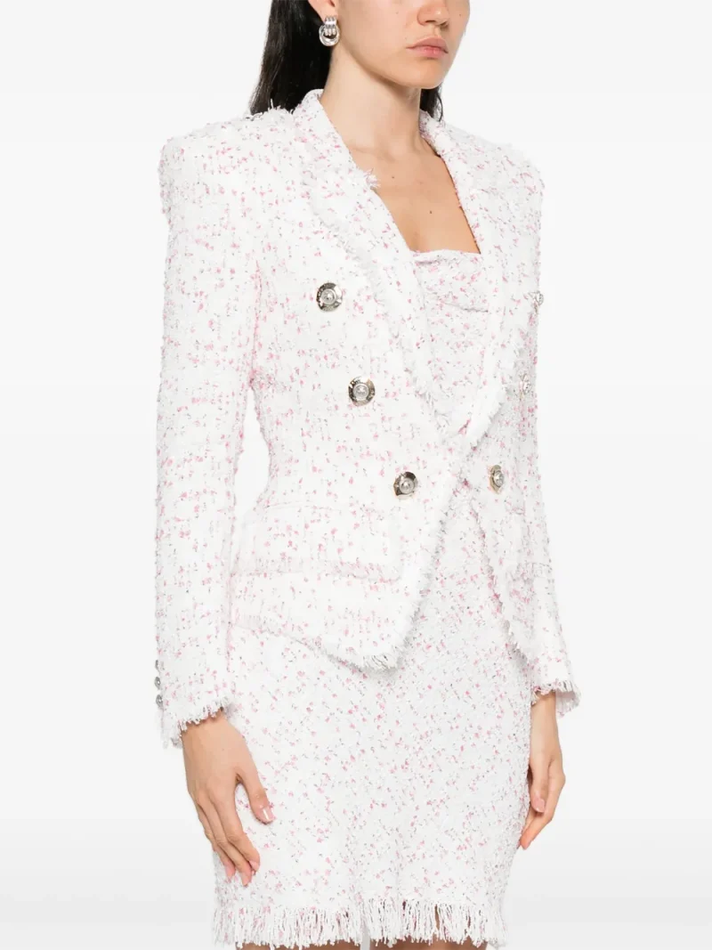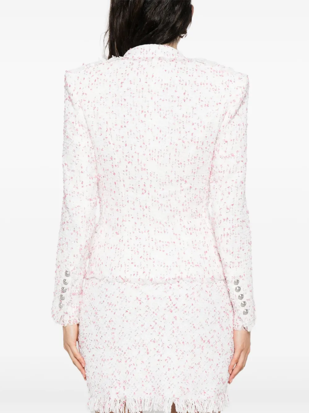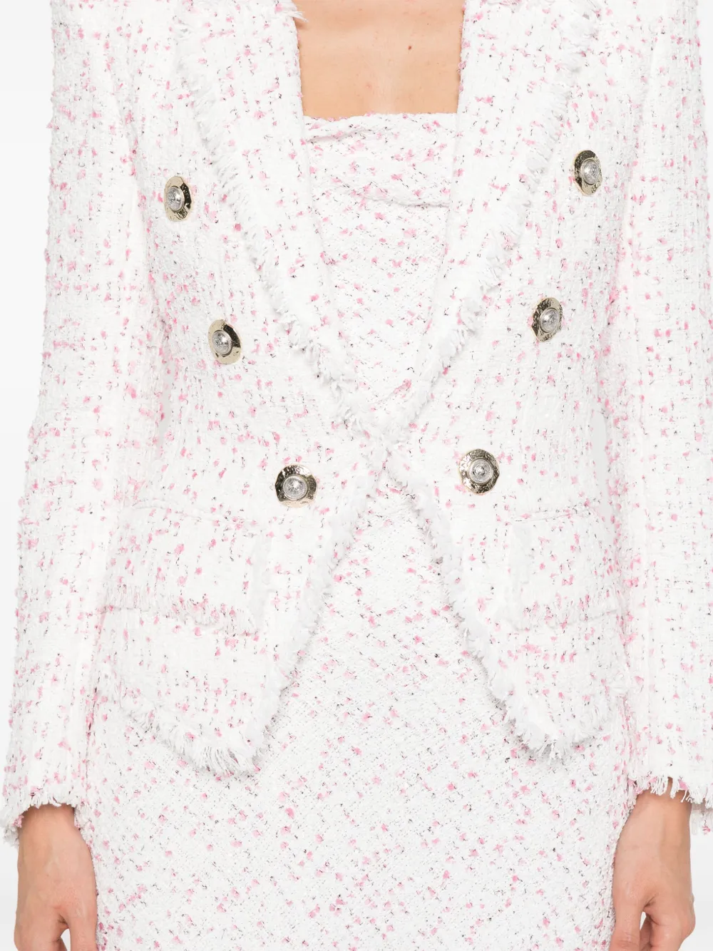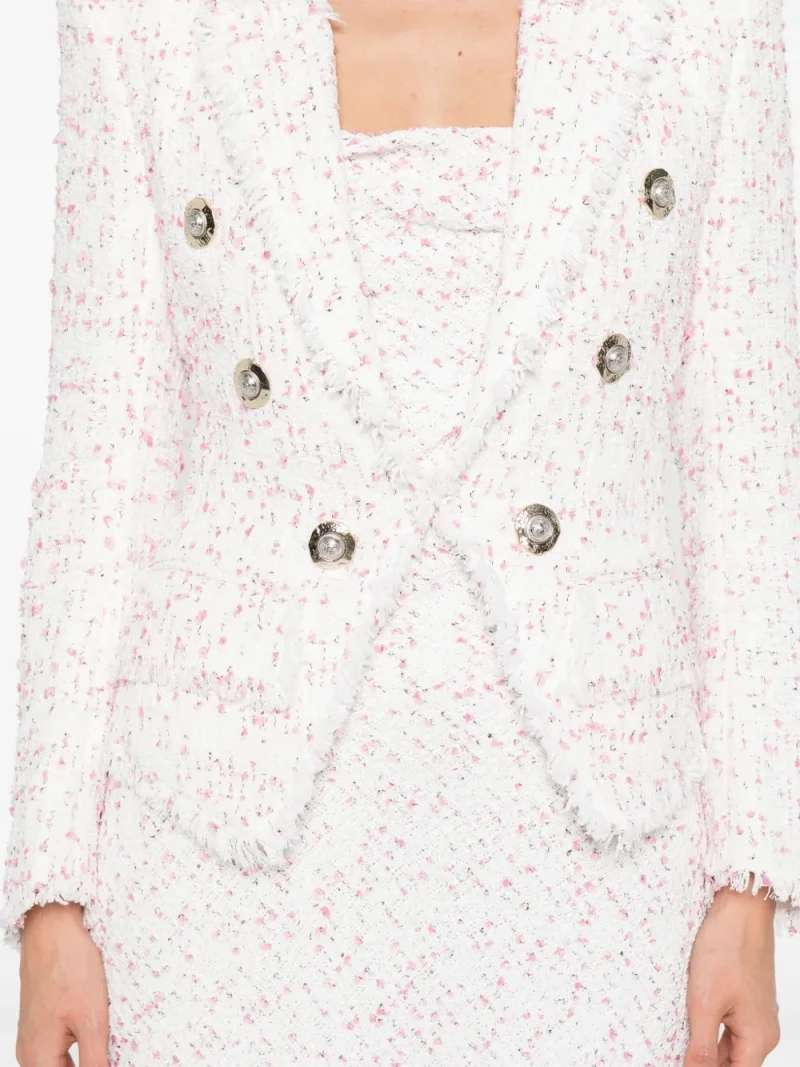 Sacou Balmain Tweed alb, cu rever ascutit, inchidere carlig, maneci lungi, nasturi dubli decorativi si tiv drept. Potrivit pentru sezonul toamna/iarna. 28% poliester; 60% poliamida; 12% matase; 52% viscoza; 48% bumbac.