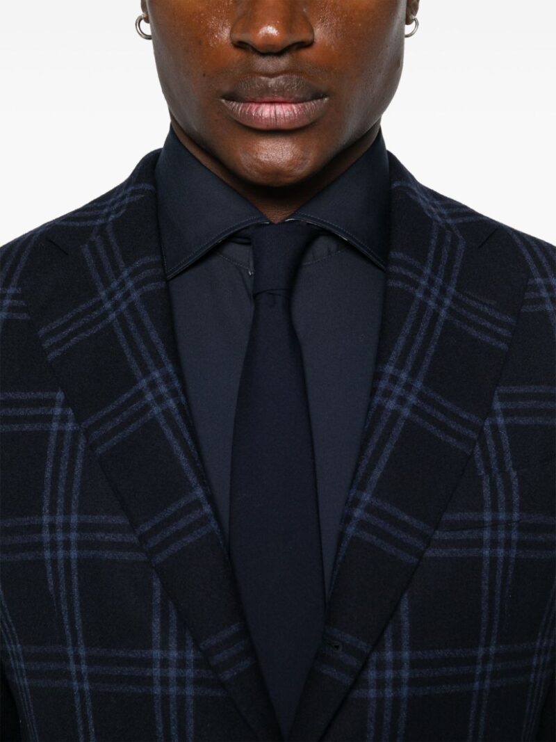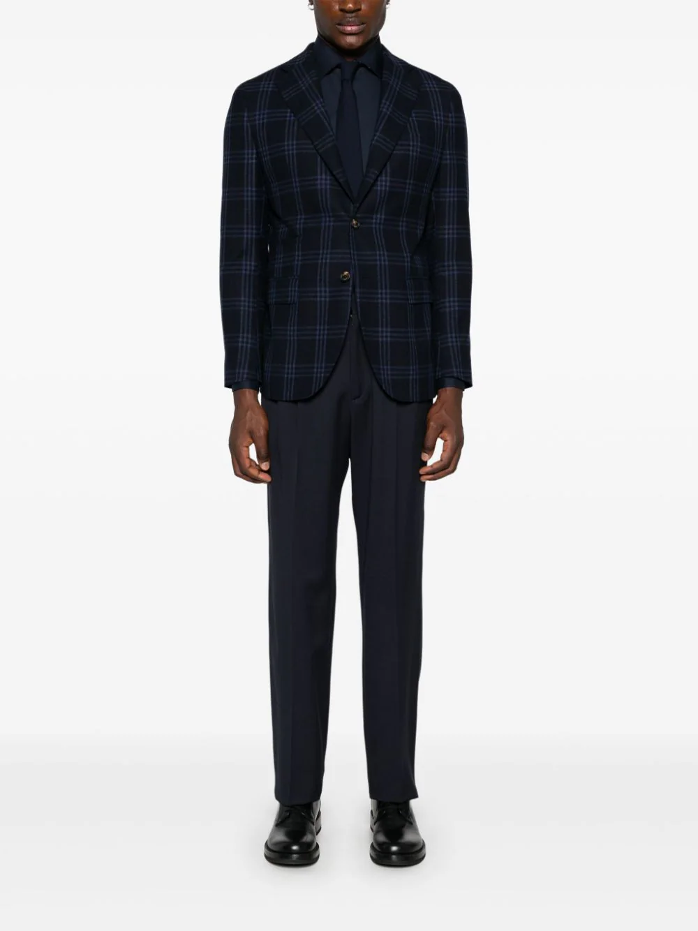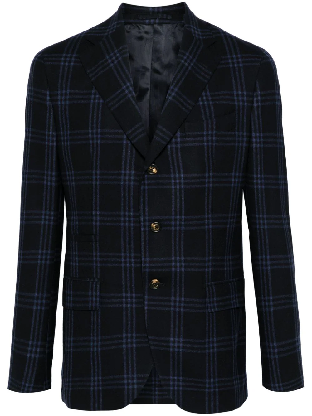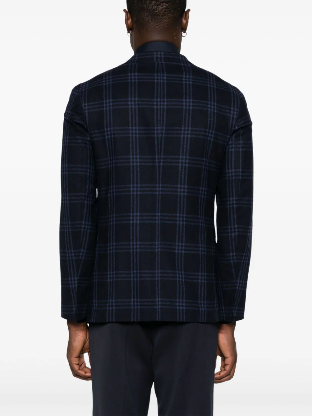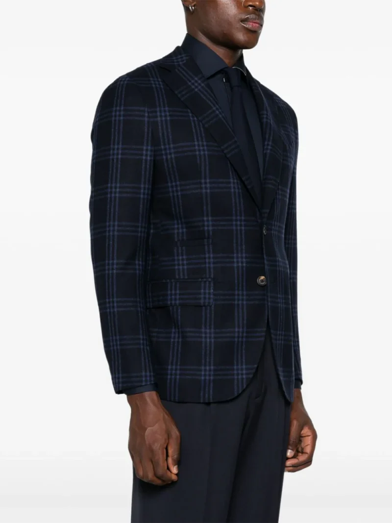 Sacou Eleventy Checkered bleumarin, din lana, cu rever crestat, inchidere cu nasturi, buzunare laterale cu clapeta, buzunar la piept tip welt, maneci lungi, grafica Checked in tesatura pe toata suprafata produsului, captuseala partiala idn viscoza si tiv drept. Potrivit pentru sezonul toamna/iarna. 100% viscoza; 100% lana.