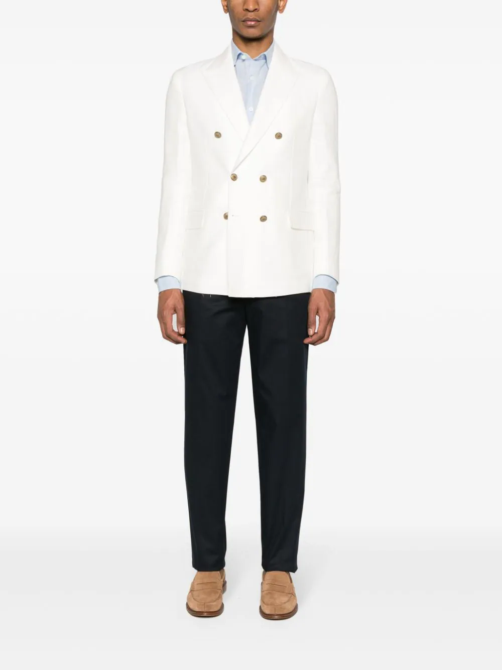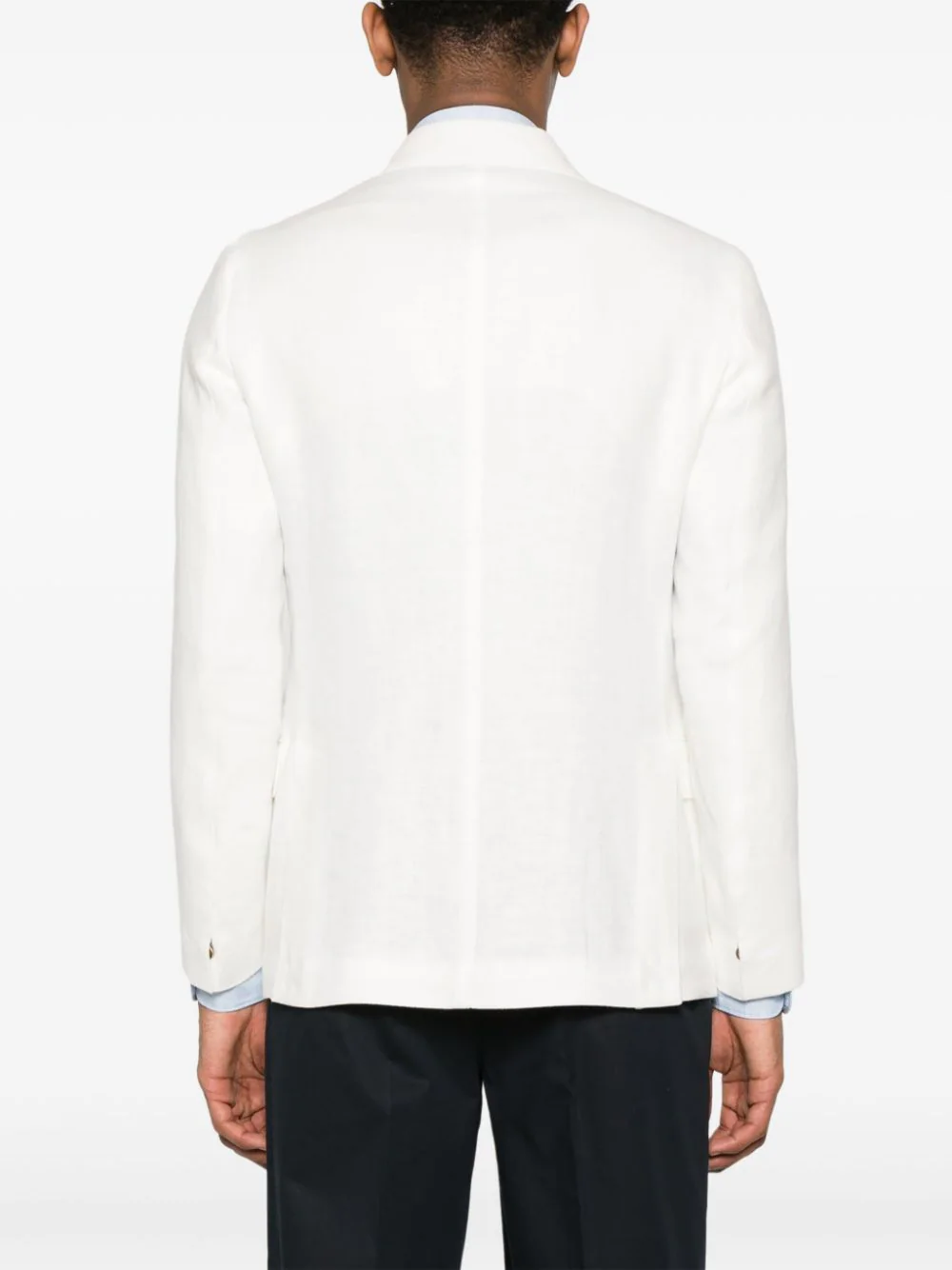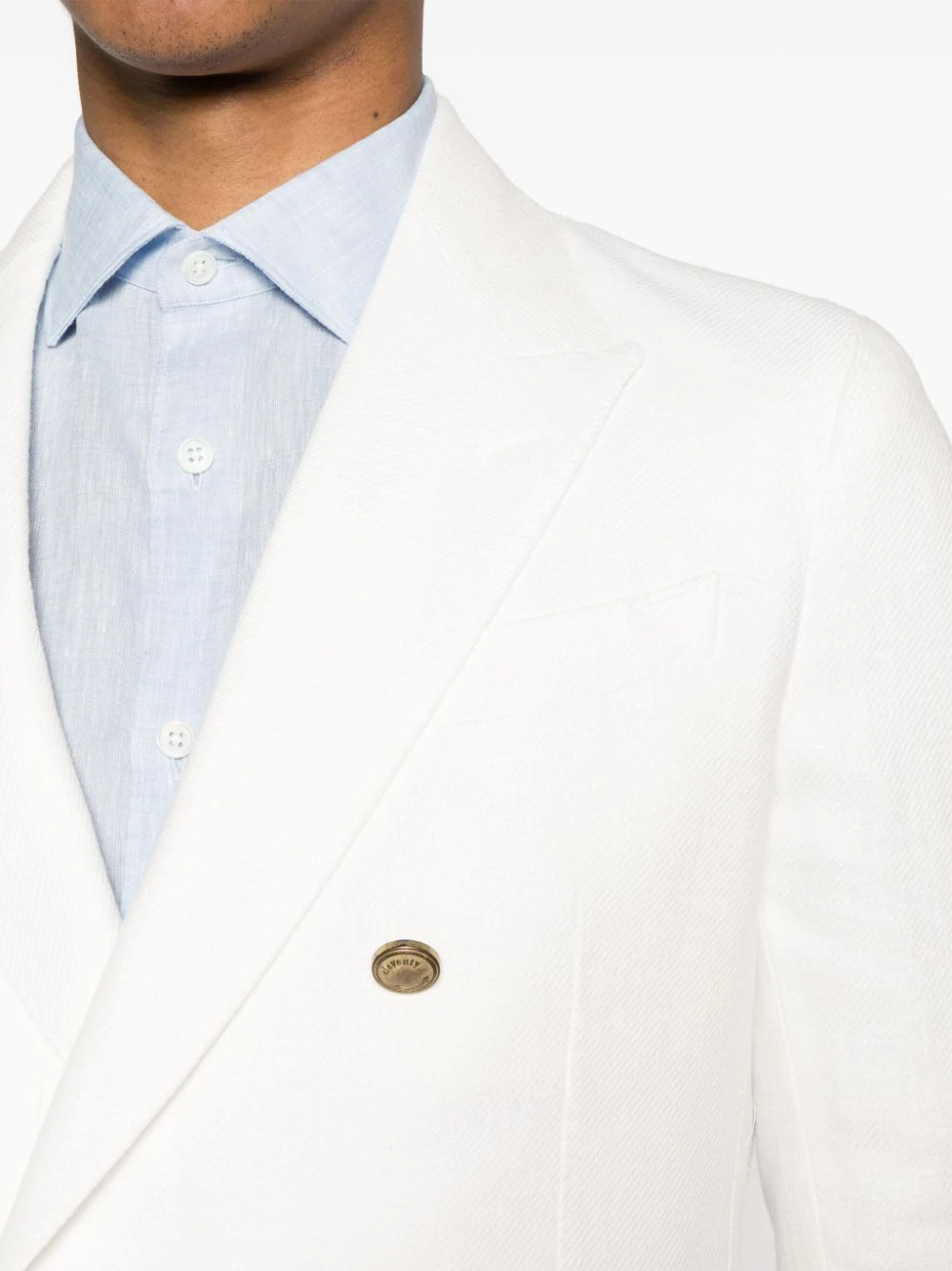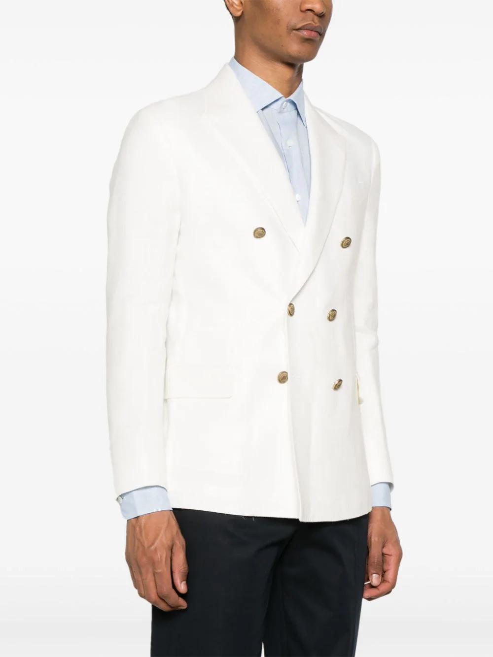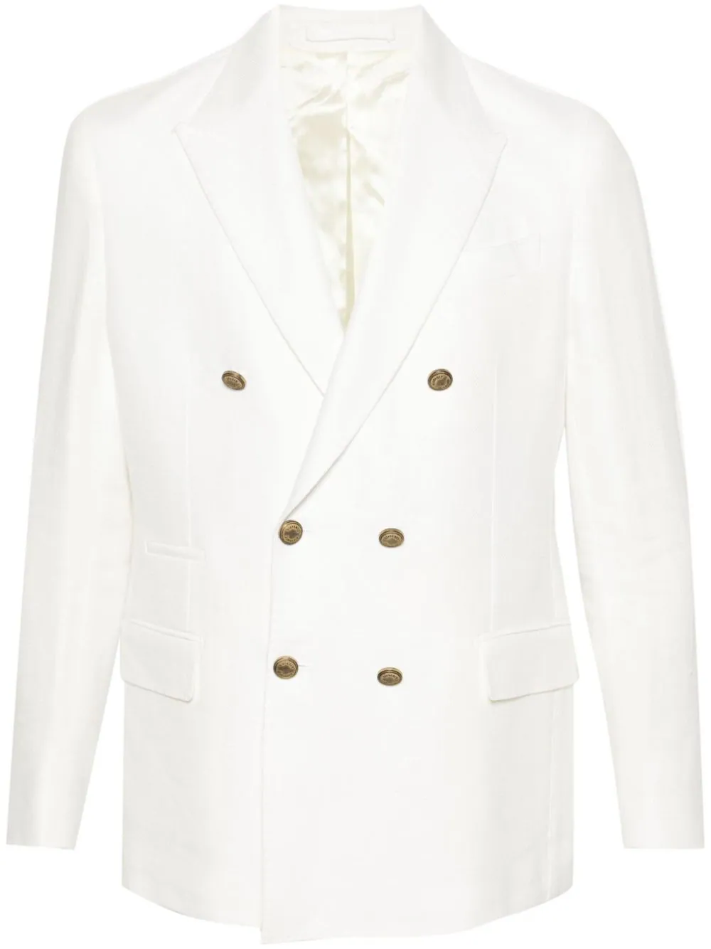 Sacou alb din in, cu doua randuri de nasturi, cu revere ascutite, maneci lungi, mansete cu nasturi, buzunar la piept, buzunare laterale cu clapeta, captuseala din viscoza si tiv drept. Potrivit pentru sezonul primavara/vara. 100% in; 100% viscoza.