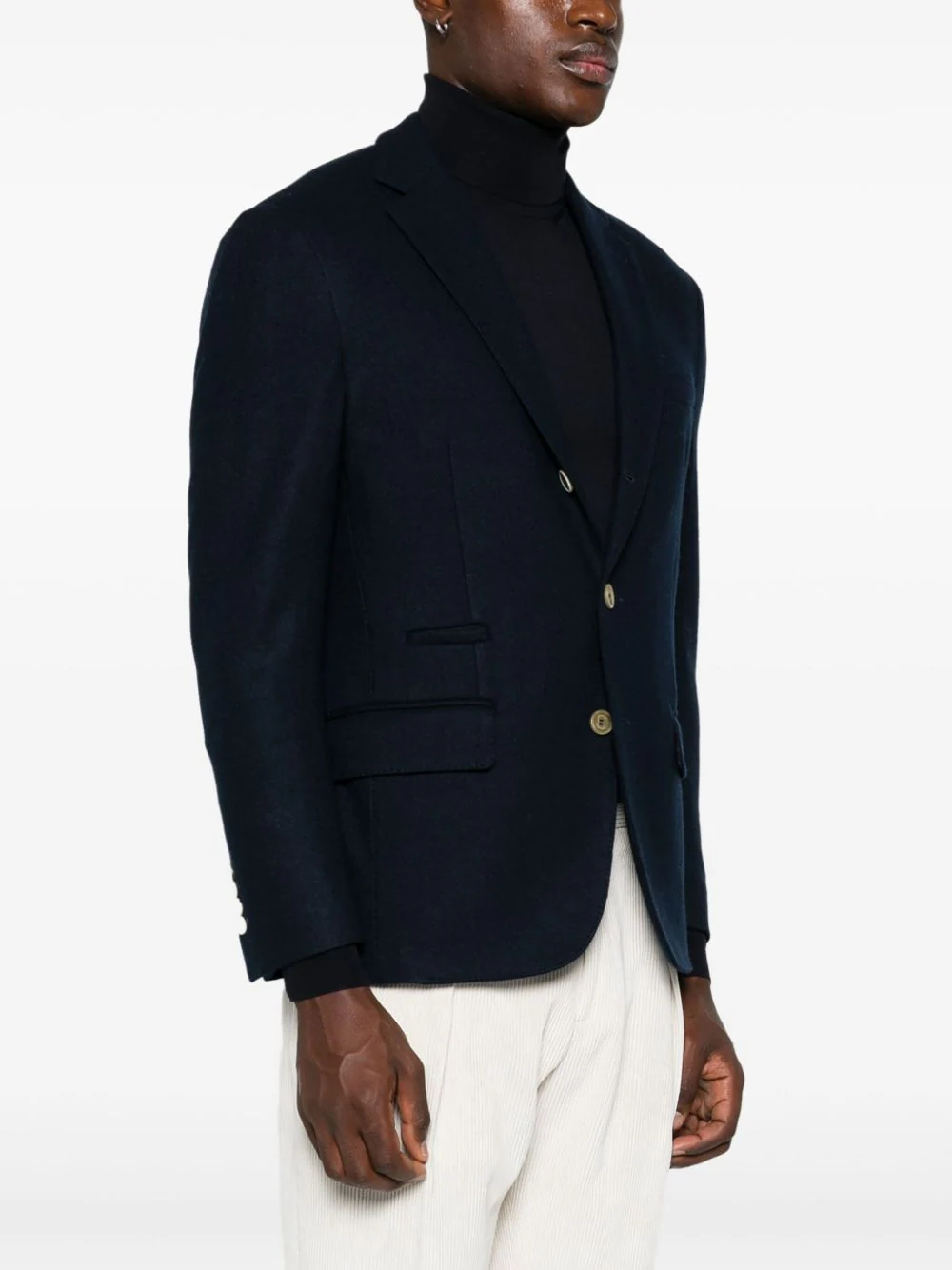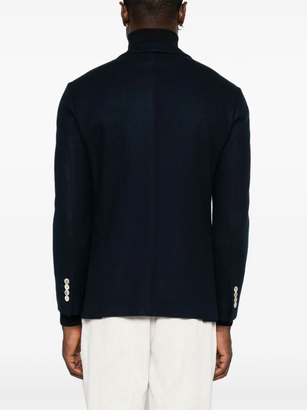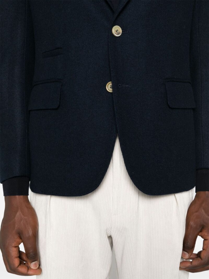 Sacou Eleventy Felted bleumarin, din lana, cu rever crestat, inchidere cu nasturi, maneci lungi, mansete cu nasturi, buzunare laterale cu clapeta, buzunare tip welt pe partea din fata, captuseala partiala din acetat si tiv curbat. Potrivit pentru sezonul toamna/iarna. 93% lana; 7% casmir; 100% blana de capra; 68% acetat; 32% poliester.