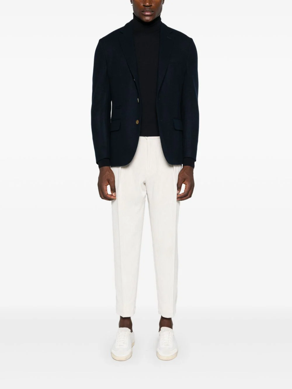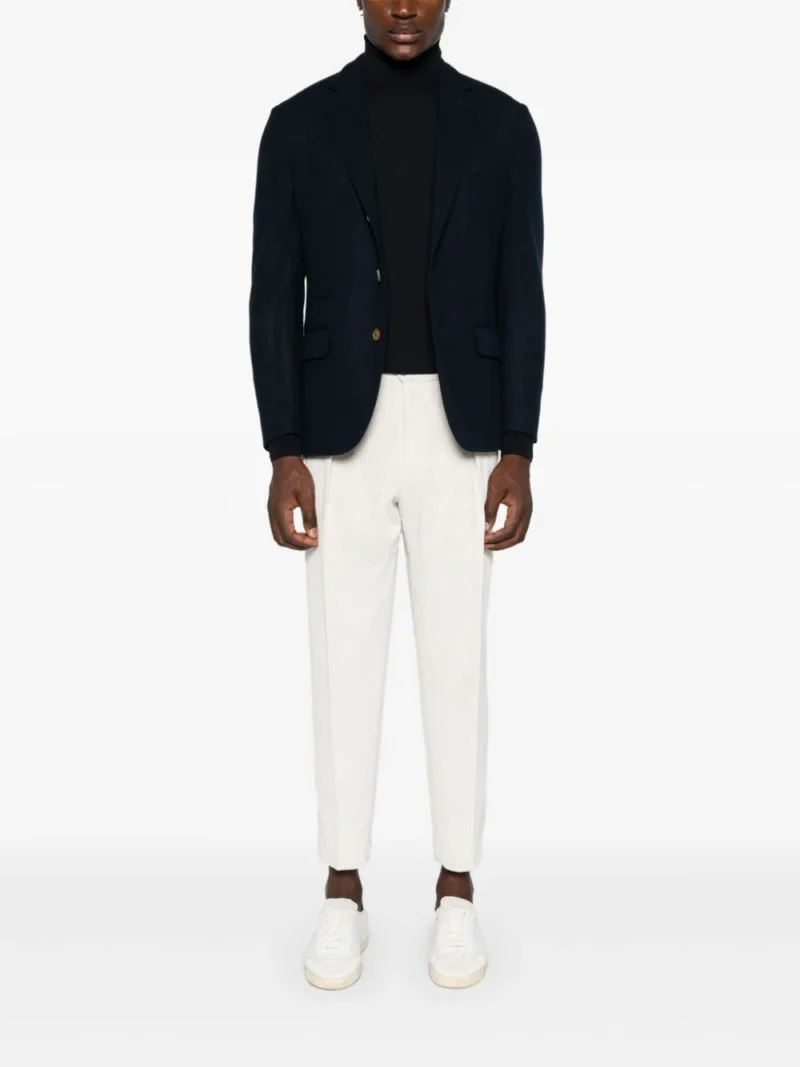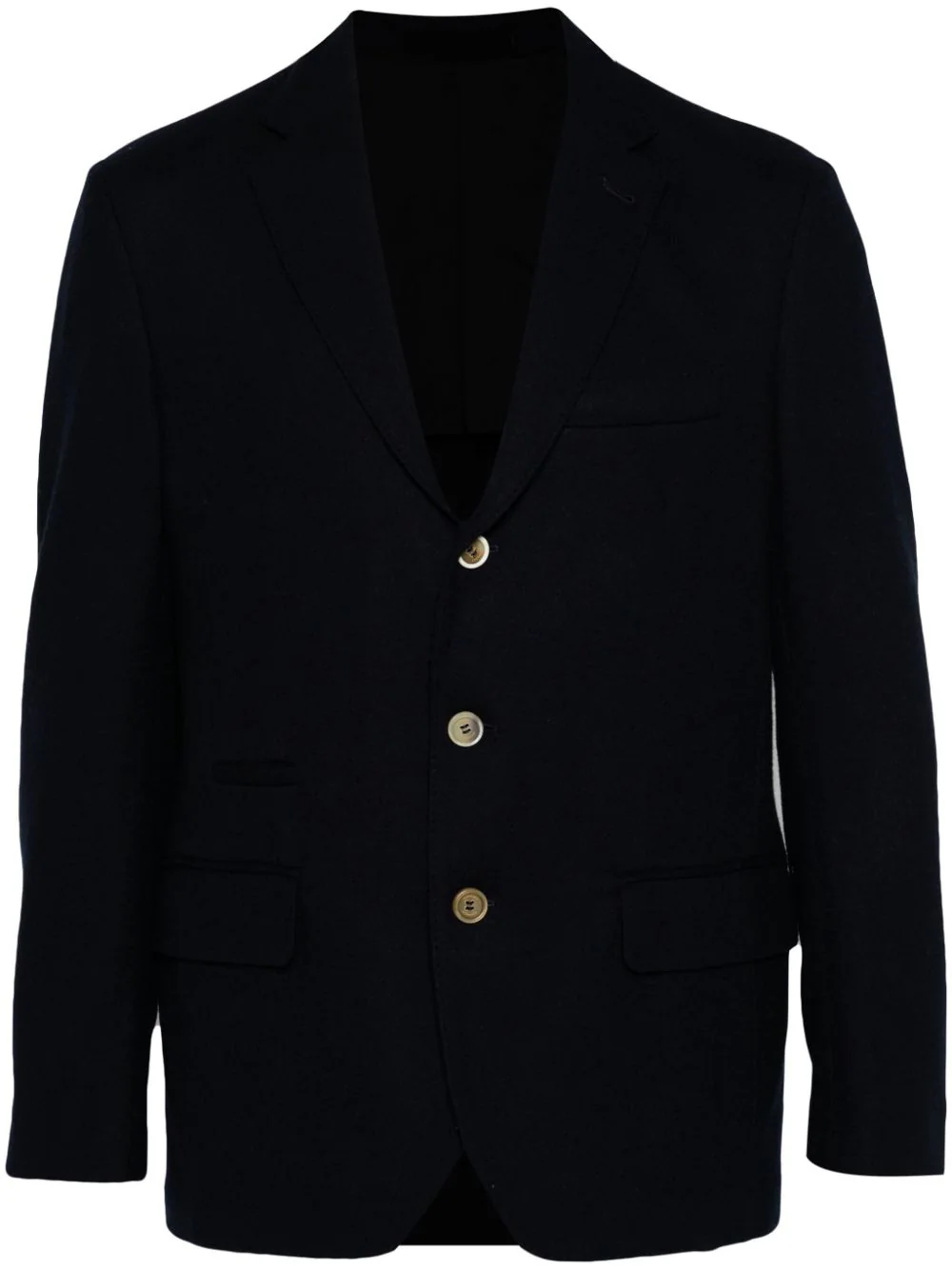 Sacou Eleventy Felted bleumarin, din lana, cu rever crestat, inchidere cu nasturi, maneci lungi, mansete cu nasturi, buzunare laterale cu clapeta, buzunare tip welt pe partea din fata, captuseala partiala din acetat si tiv curbat. Potrivit pentru sezonul toamna/iarna. 93% lana; 7% casmir; 100% blana de capra; 68% acetat; 32% poliester.
