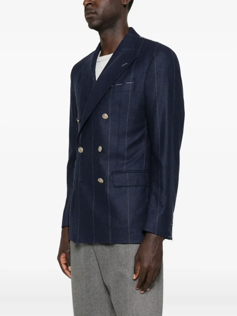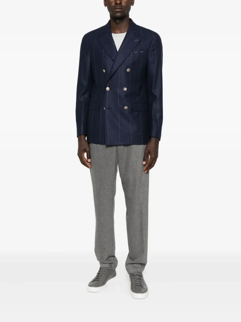 Sacou Eleventy Pinstripe Double-Breasted bleumarin, realizat din lana, cu rever ascutit, inchidere cu nasturi, maneci lungi, grafica cu dungi in tesatura, buzunare multiple si tiv drept. Potrivit pentru sezonul toamna/iarna. 89% lana; 6% matase; 5% casmir.