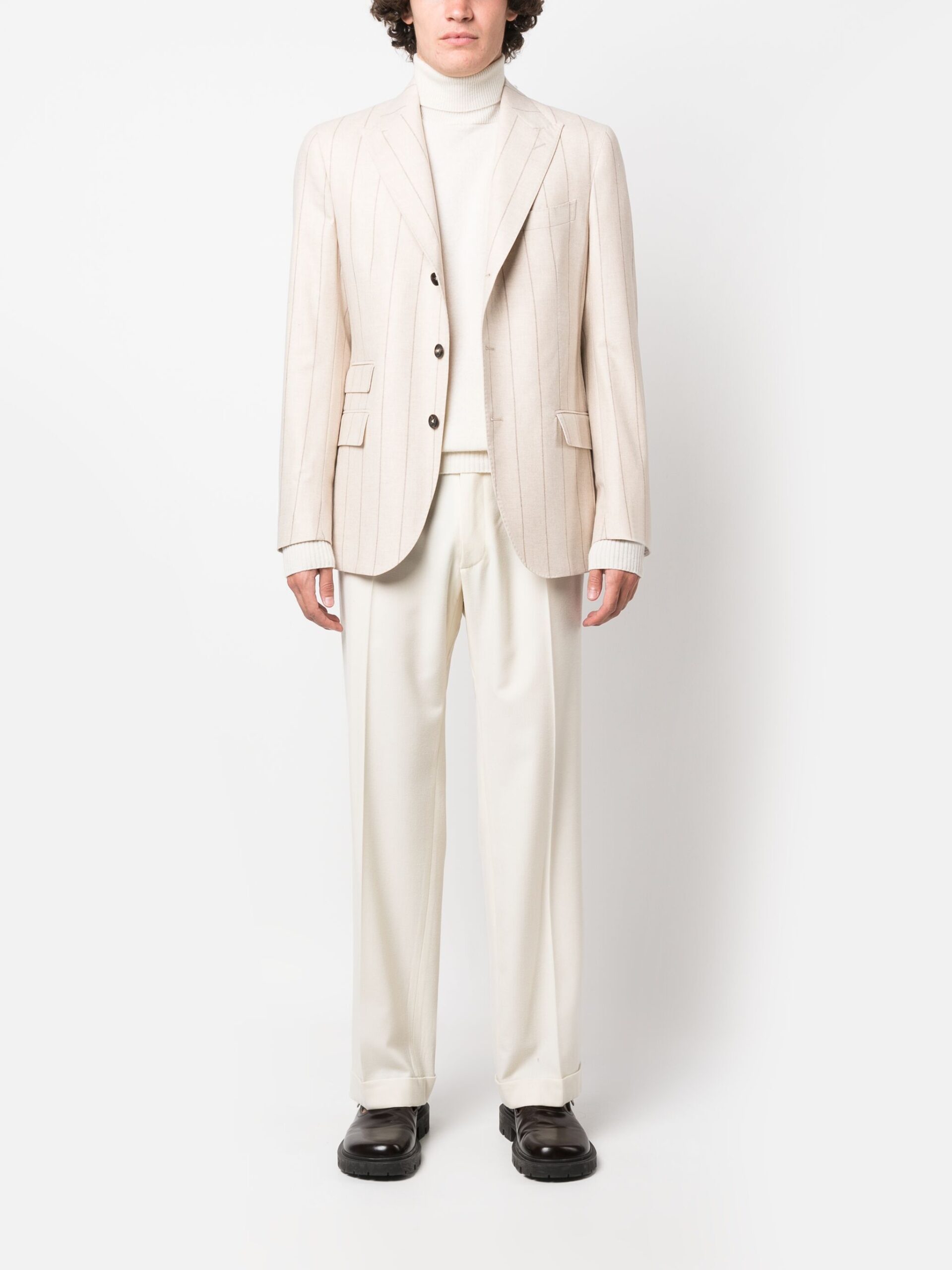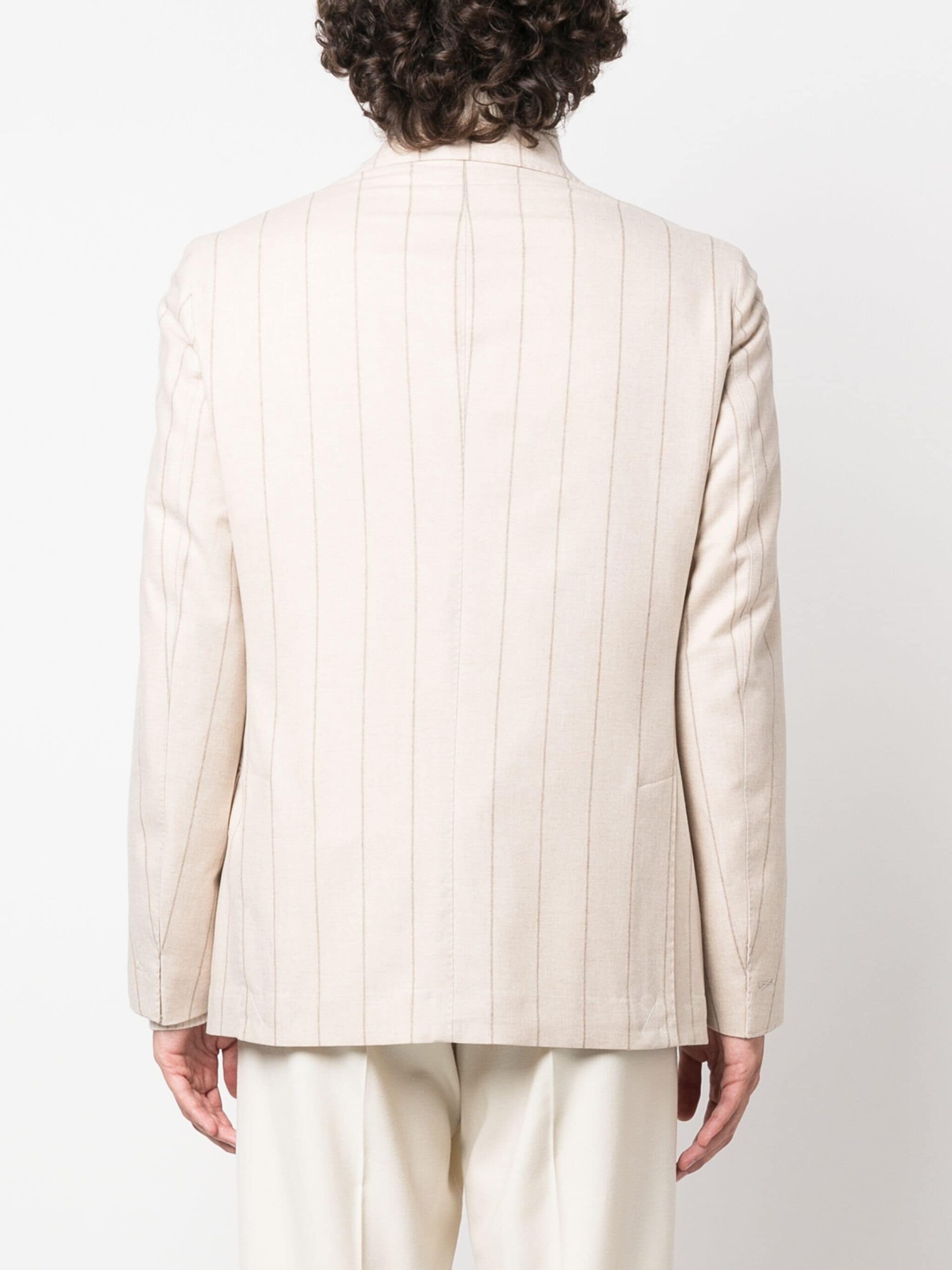 Sacou bej din lana, cu rever crestat, inchidere cu nasturi, maneci lungi, mansete cu nasturi, dungi verticale in tesatura, buzunar la piept, buzunare laterale, captuseala din viscoza si tiv drept. Potrivit pentru sezonul toamna/iarna. 89% lana; 6% matase; 5% casmir; 52% viscoza; 48% cupro.
