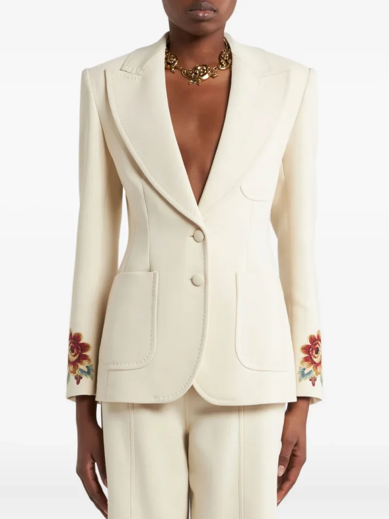 Sacou ETRO Floral-Embroidered bej, realizat din mix de materiale, cu rever ascutit, inchidere cu nasturi, maneci lungi decorate cu broderii, buzunare aplicate, cusaturi punctate si tiv drept. Potrivit pentru sezonul toamna/iarna. 52% viscoza; 48% acetat; 52% poliester; 44% lana; 4% elastan.