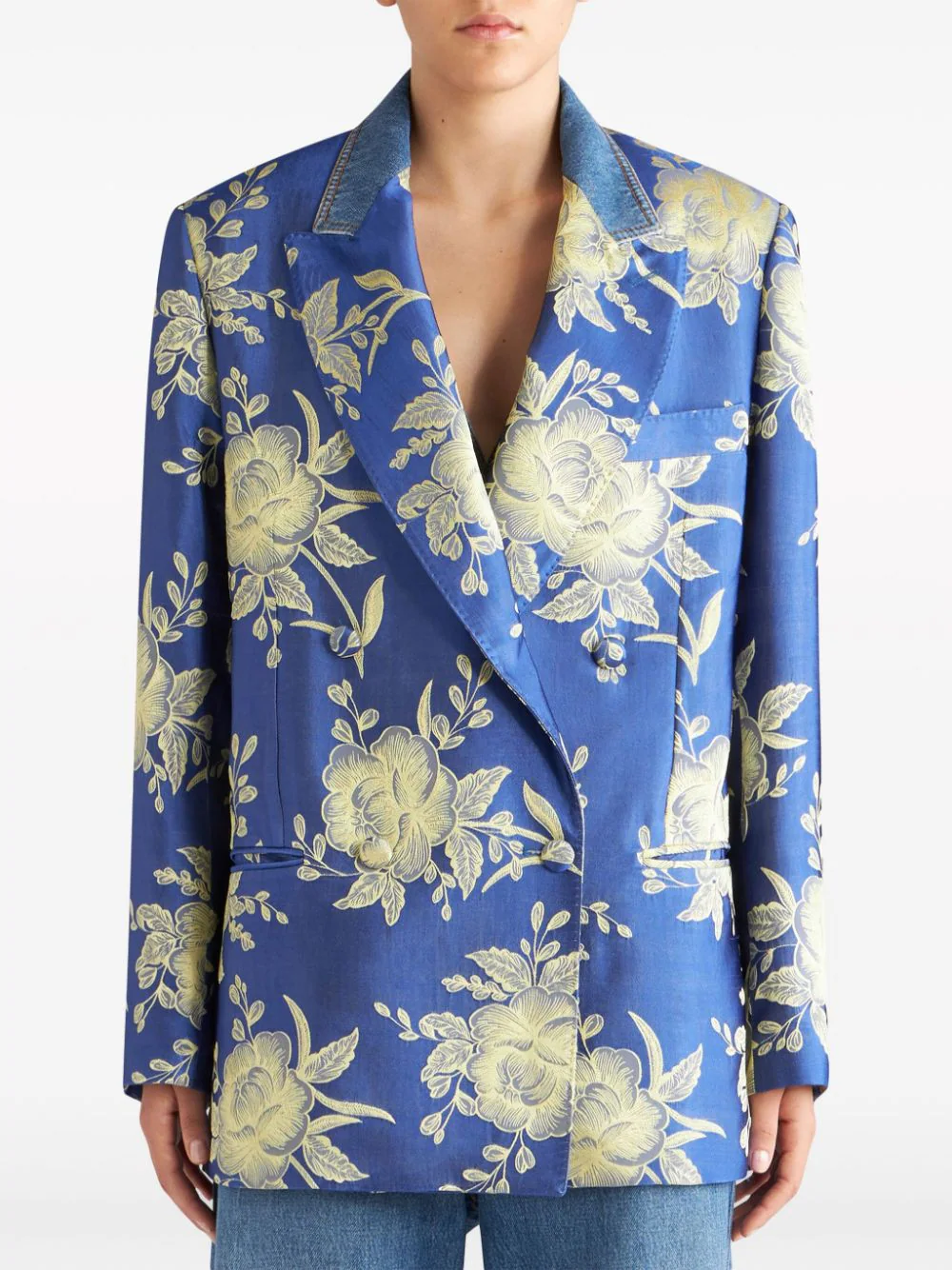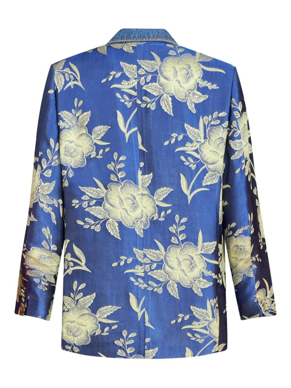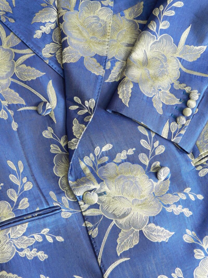 Sacou albastru din poliester si viscoza, cu rever tip peak, inchidere cu nasturi, maneci lungi, mansete cu nasturi, model floral in tesatura pe toata suprafata, buzunare laterale, buzunar la piept, captuseala din viscoza si tiv drept. Potrivit pentru sezonul primavara/vara. 44% poliester; 30% viscoza; 26% matase; 100% bumbac; 52% viscoza; 48% acetat.