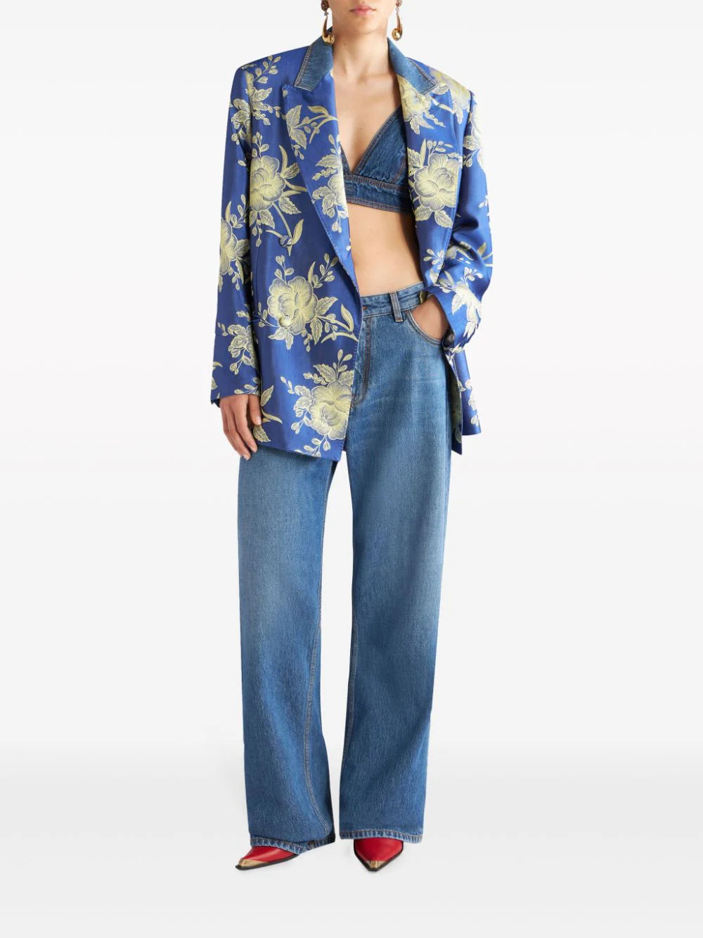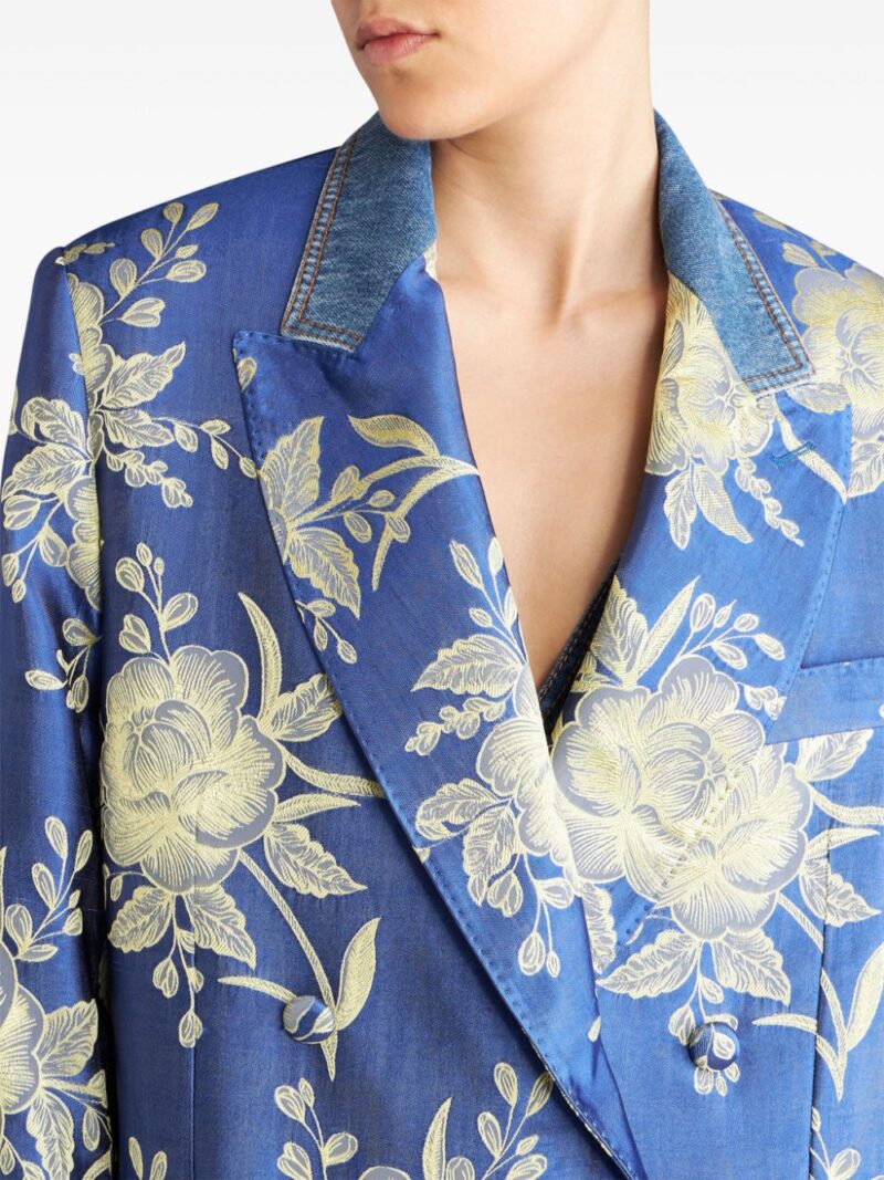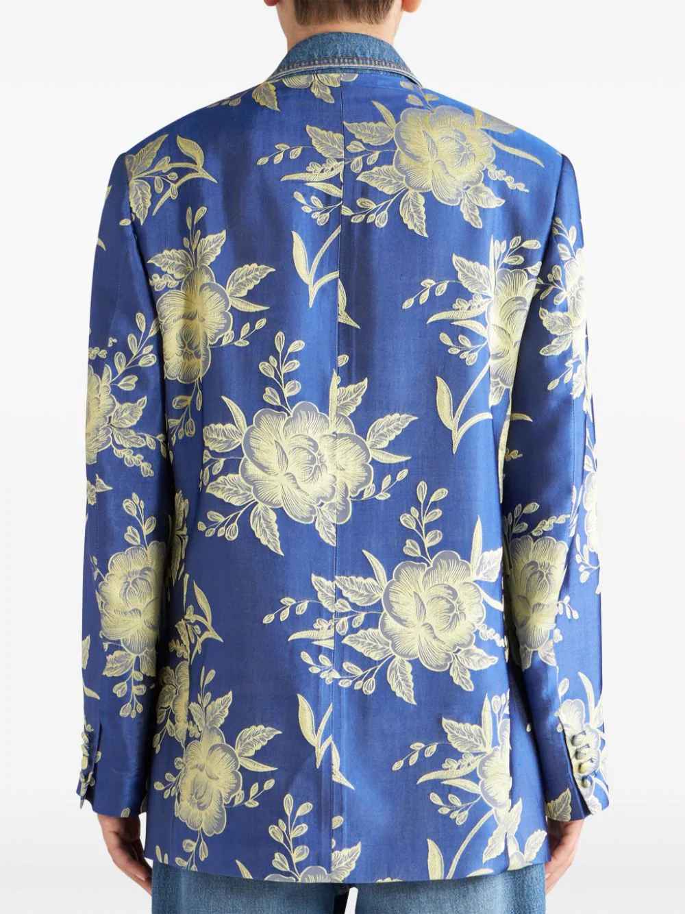 Sacou albastru din poliester si viscoza, cu rever tip peak, inchidere cu nasturi, maneci lungi, mansete cu nasturi, model floral in tesatura pe toata suprafata, buzunare laterale, buzunar la piept, captuseala din viscoza si tiv drept. Potrivit pentru sezonul primavara/vara. 44% poliester; 30% viscoza; 26% matase; 100% bumbac; 52% viscoza; 48% acetat.