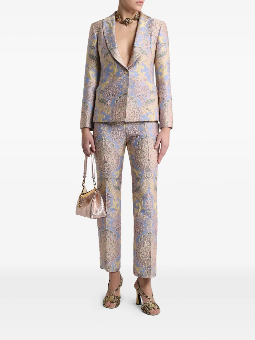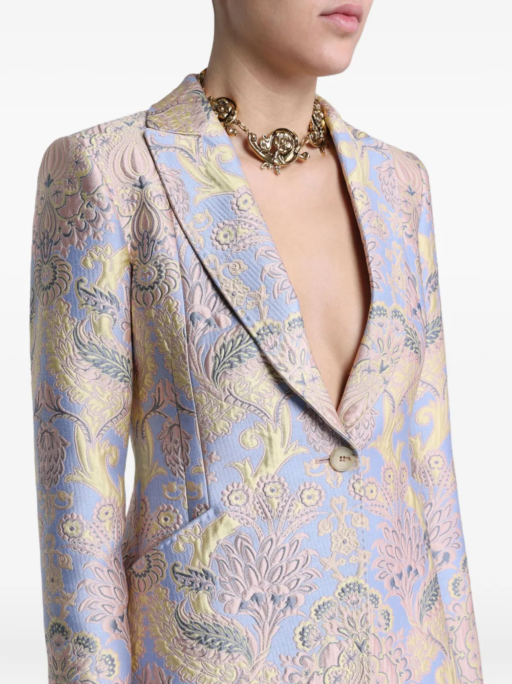 Sacou ETRO Floral-Jacquard multicolor, cu rever crestat, inchidere cu nasturi, maneci lungi, tesatura jacquard cu pattern floral, aspect lucios si tiv drept. Potrvit pentru sezonul toamna/iarna. 92% poliester; 8% fibre metalice.