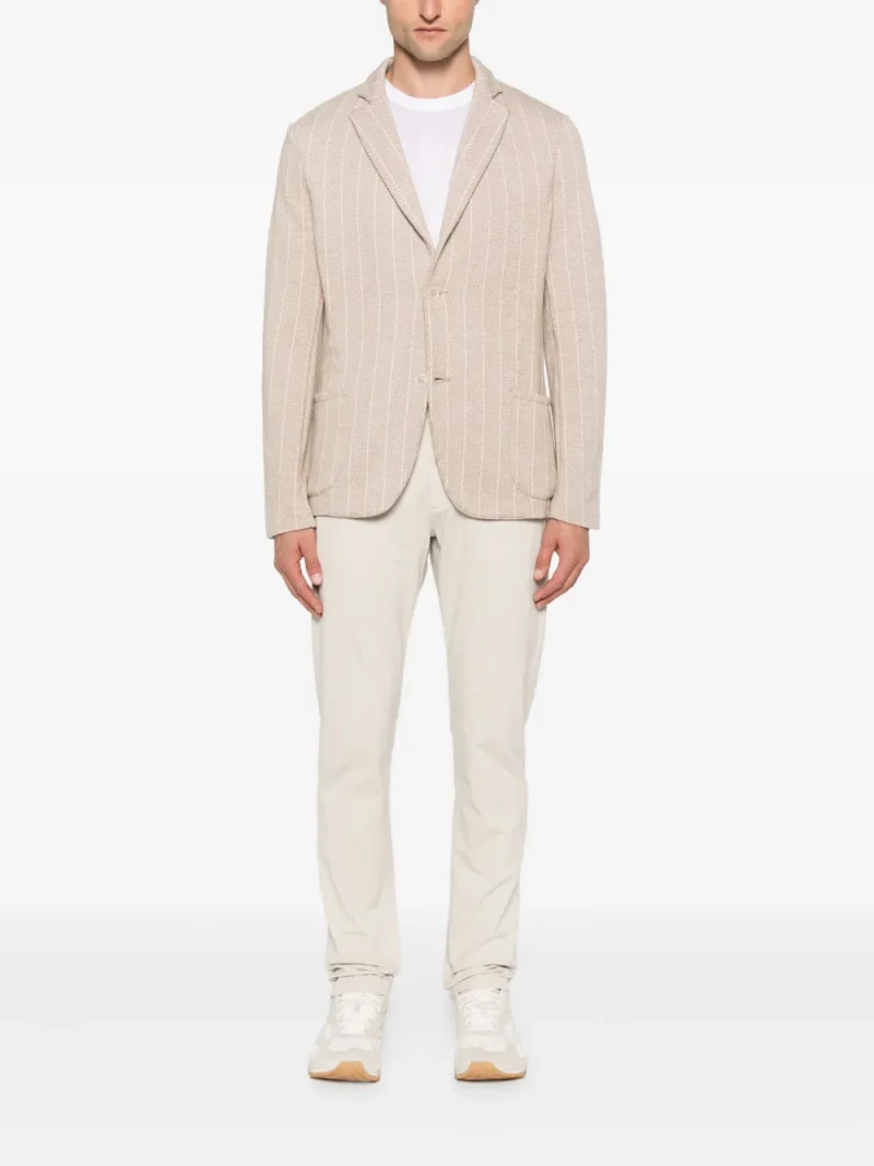 Sacou Gran Sasso Virgin Wool Single-Breasted bej, din lana premium, cu rever crestat, inchidere cu nasturi, maneci lungi, buzunare laterale, grafica cu dungi in tesatura si tiv drept. Potrivit pentru sezonul toamna/iarna. 100% lana.