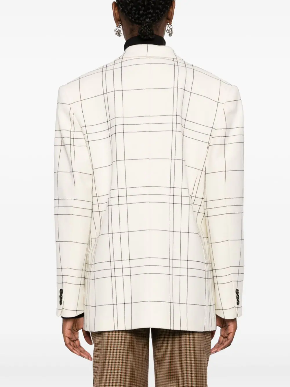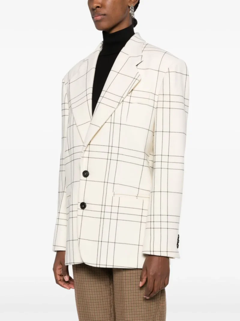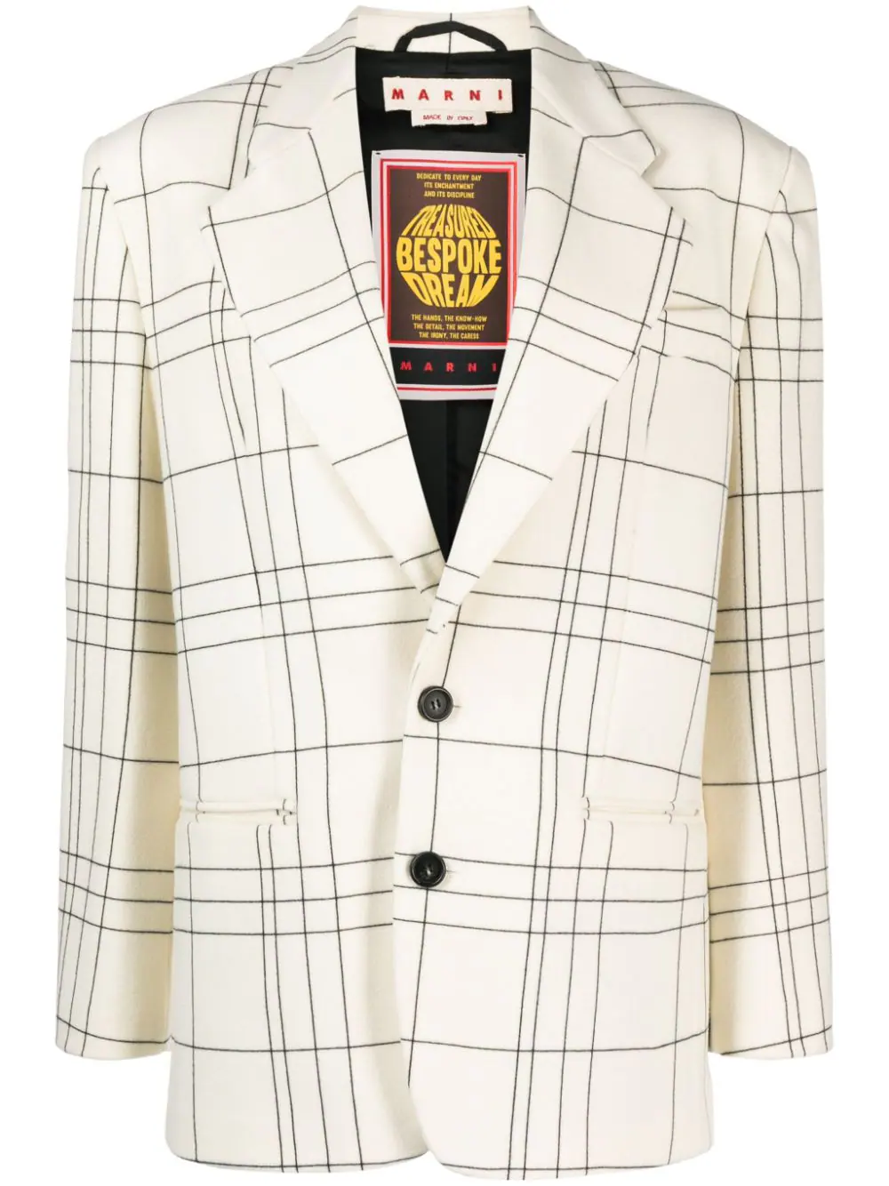 Sacou alb/negru din lana, cu rever tip peak, inchidere cu nasturi, maneci lungi, mansete cu nasturi, model Marni Checked in tesatura pe toata suprafata, buzunare laterale, buzunar la piept, captuseala din viscoza si tiv drept. Potrivit pentru sezonul toamna/iarna. 100% lana; 100% viscoza.