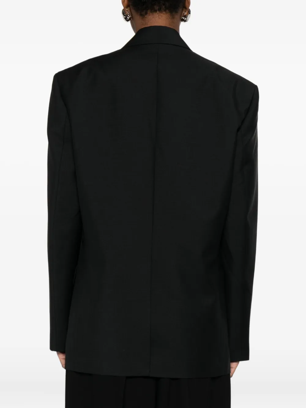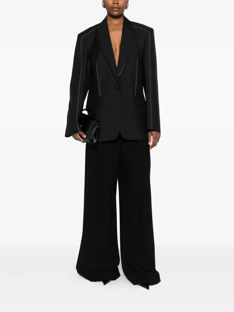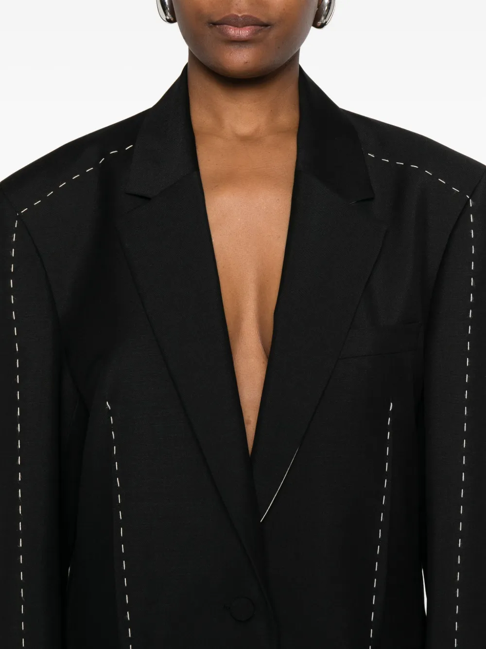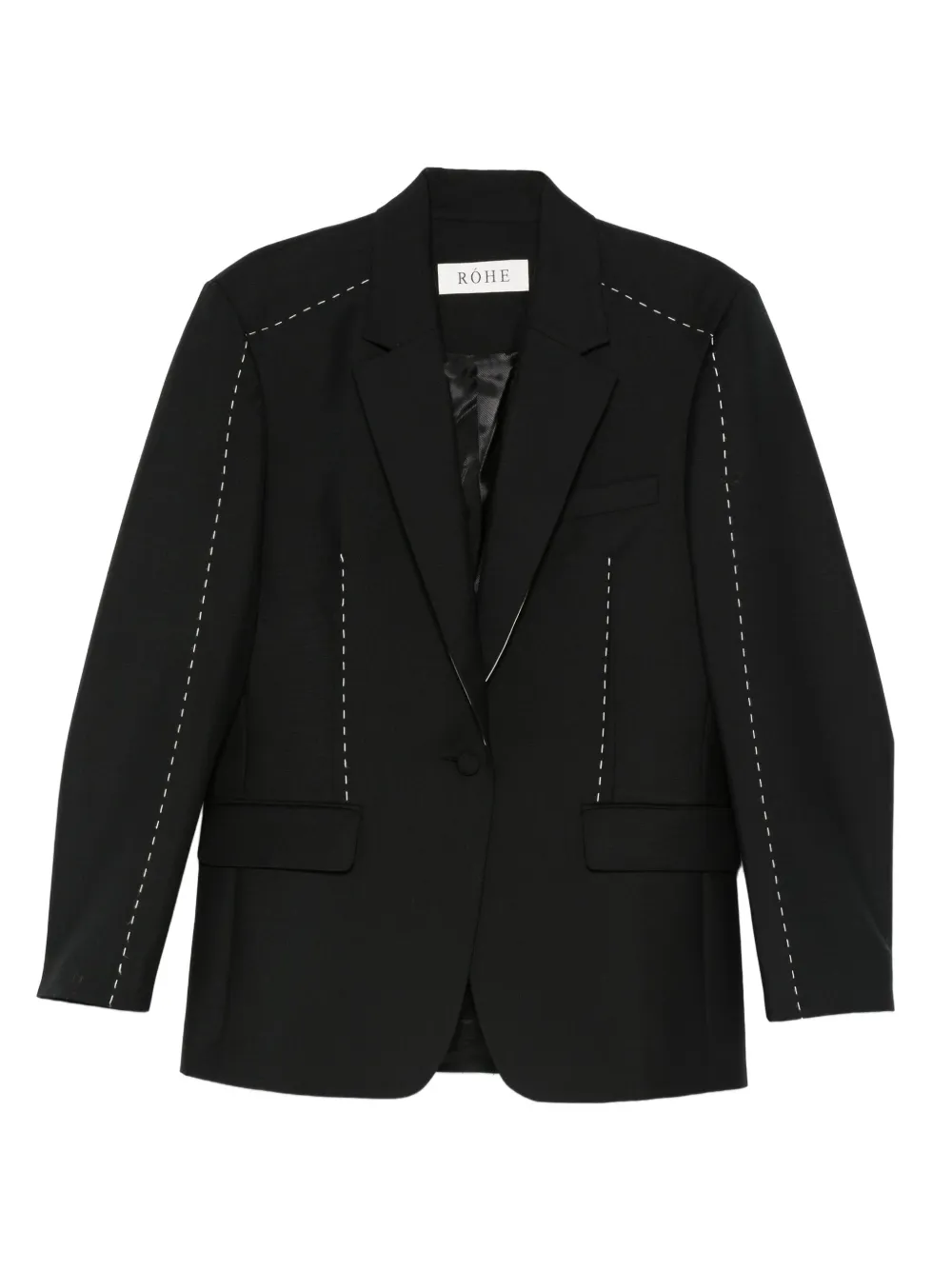 Sacou ROHE Contrast-Stitching negru, cu rever crestat, maneci lungi, inchidere cu un singure nasture, cusaturi in contrast decorative, buzunare laterale cu clapeta, buzunar tip welt la piept si tiv drept. Potrivit pentru sezonul toamna/iarna. 100% textil.