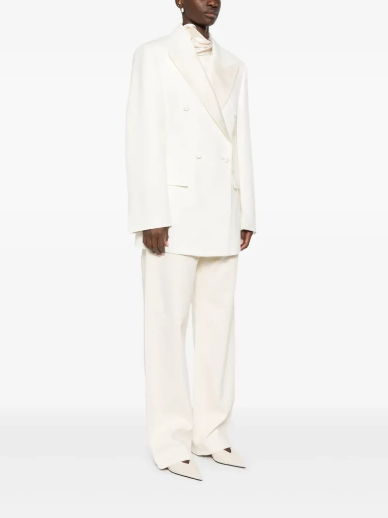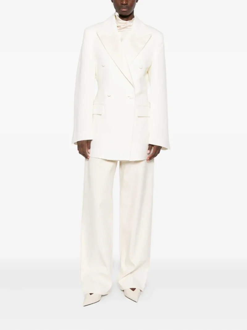Sacou ROHE Hourglass Tuxedo alb, realizat din lana, cu rever crestat, inchidere cu nasturi dubli, maneci lungi, buzunare laterale cu clapeta, croiala stramta in jurul taliei si tiv drept. Potrivit pentru sezonul toamna/iarna. 100% lana; 100% lana.