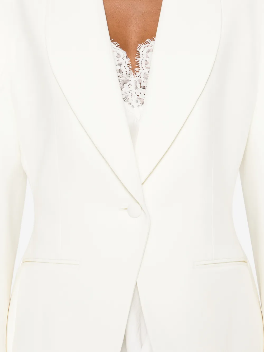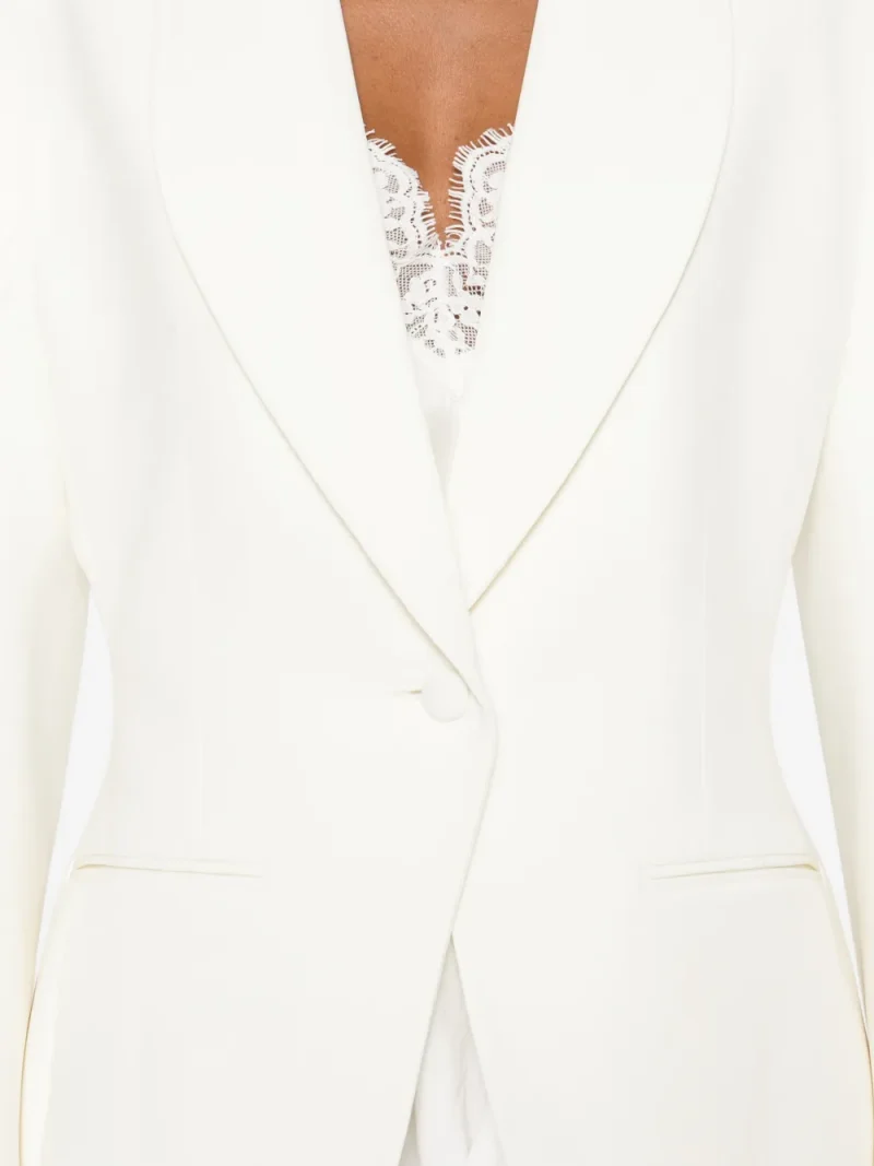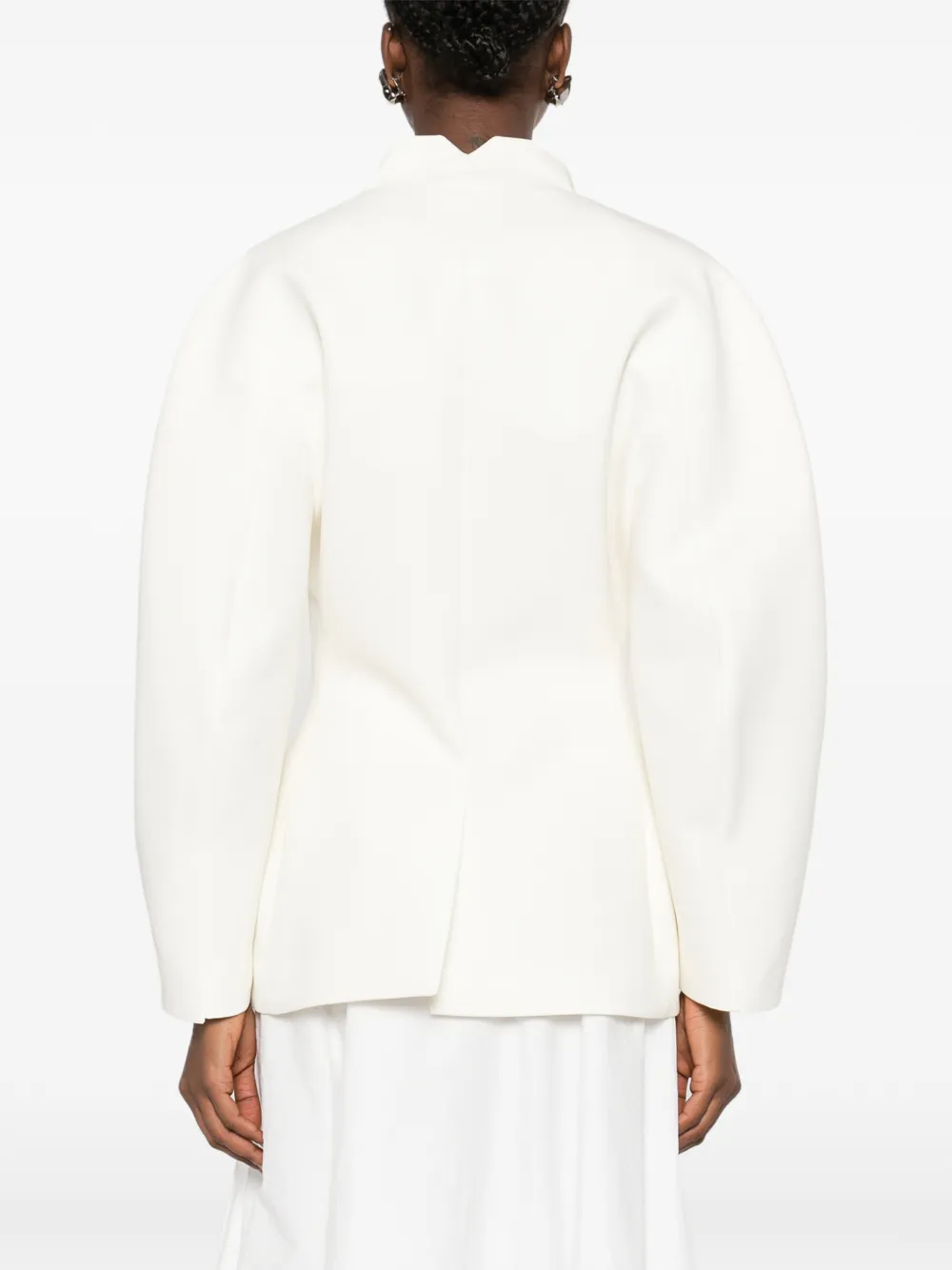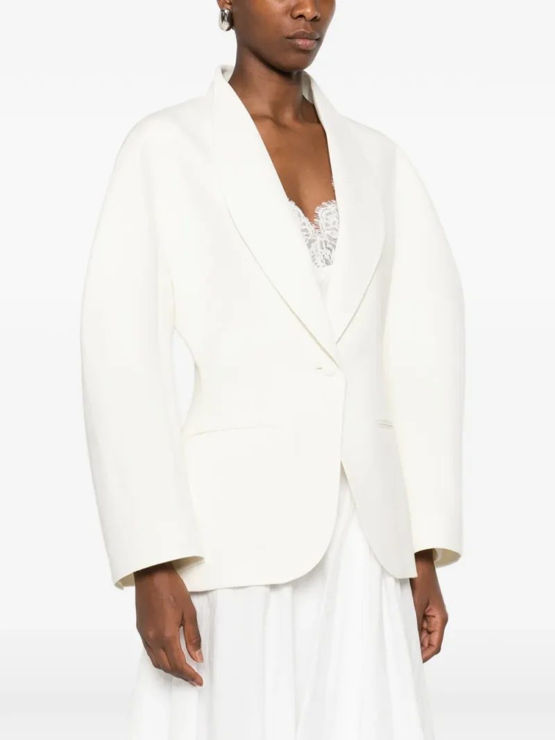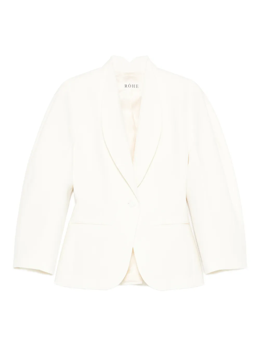 Sacou Rohe Shawl-Lapel ecru, din lana, design structurat cu rever tip shawl, umeri supradimensionati, inchidere cu un singure nasture, buzunare laterale tip welt si tiv drept. Potrivit pentru sezonul primavara/vara. 100% lana.